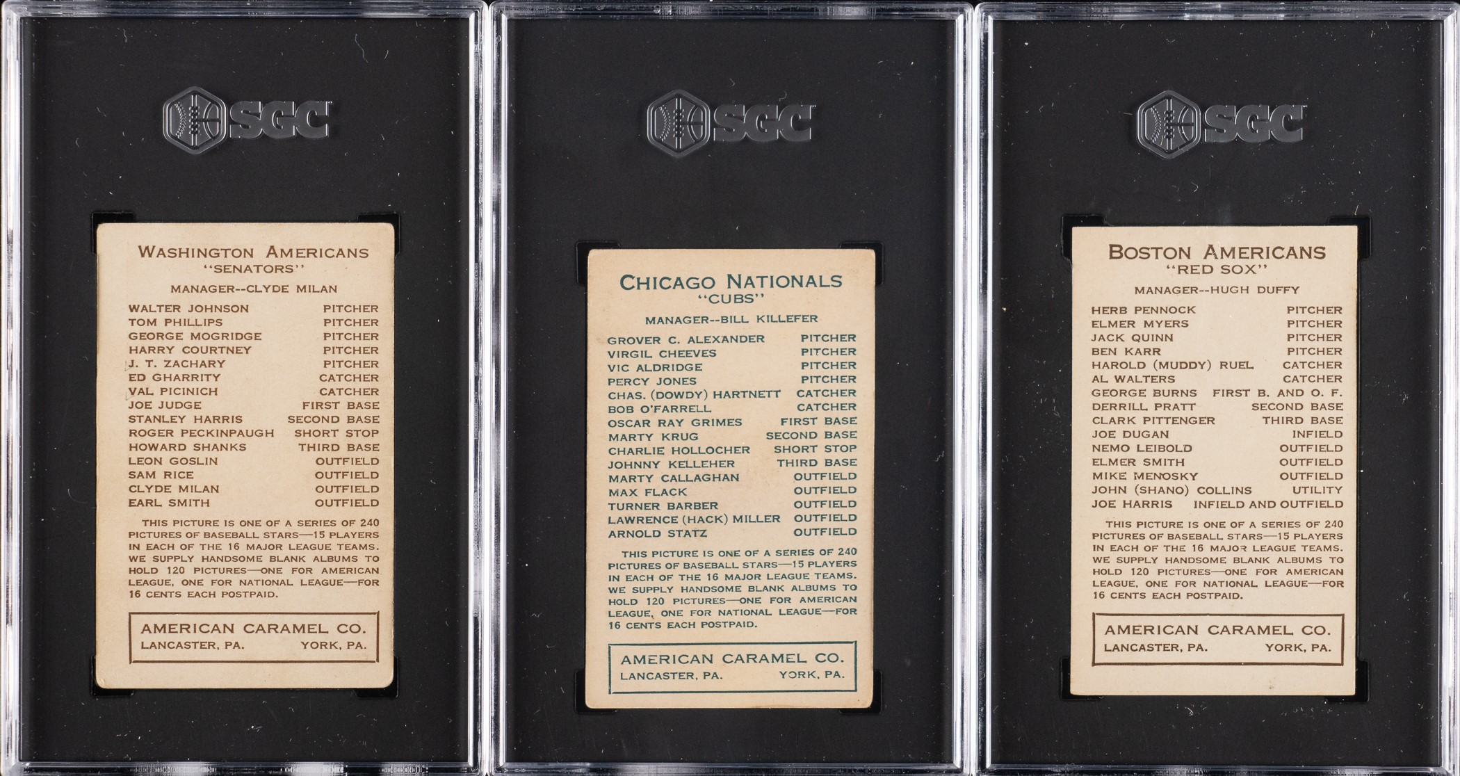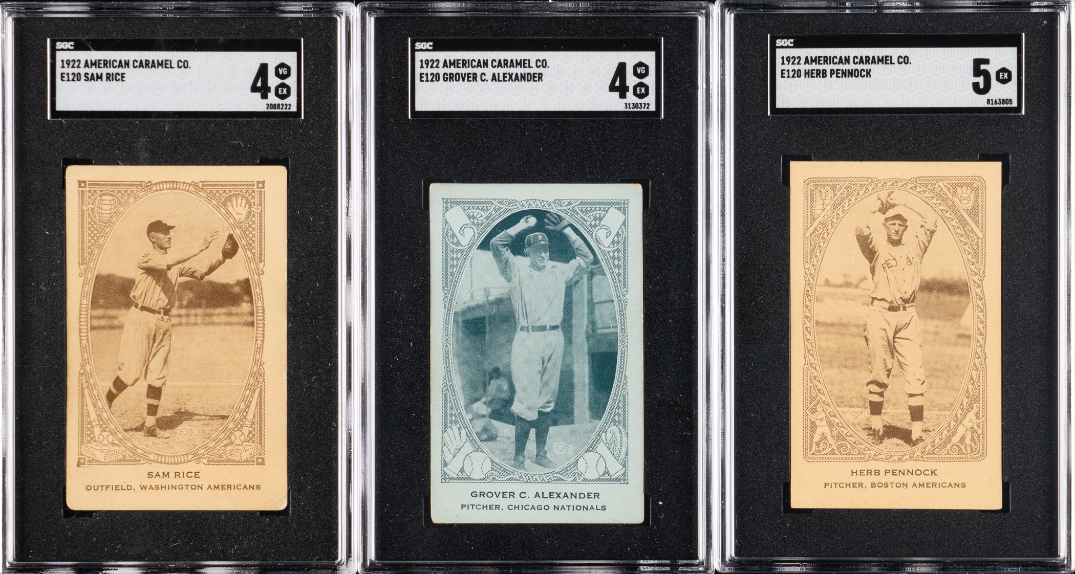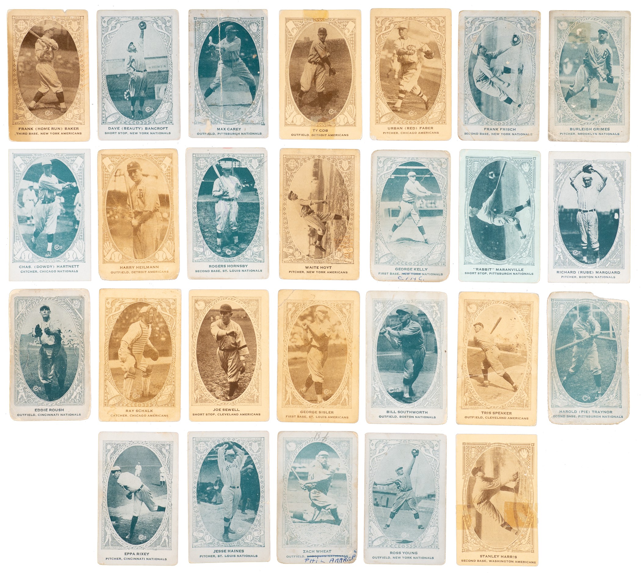 This rarely offered, lower-grade, near-complete set of 1922 E120 American Caramel (Series 240) cards includes 232 of the 240 cards in the set, highlighted by twenty-eight Hall of Famers, including Ty Cobb, Grover Alexander, and Tris Speaker. Condition is 56% Gd to Vg (including 3% better) and 44% Pr to Fr (including three altered and one trimmed). Missing the following eight cards for completion: E. Collins, Gardner, Hauser, Hooper, W. Johnson, B. Meusel, Morrison, and Ruth. The E120 American Caramel Company set issued in 1922 is the classic set from the 1920s. The E120 set’s 240 cards make it the only comprehensive set of the era, and its striking design make it one of the most attractive baseball card sets of any era. The set features fifteen members from each of the sixteen Major League teams. All the players are pictured in full-length poses. The National Leaguers are printed in a green tone, the American Leaguers in a sepia tone. We have selected three cards to be graded and encapsulated by SGC. Keys: Alexander (VG/EX 4), Baker (Pr), Bancroft (Vg, blank back), Carey (Pr), Cobb (Pr due to two strips of clear tape on top and bottom), Faber (Gd+), Frisch (Pr), Grimes (tape repairs, otherwise Pr), Haines (Fr), Harris (Pr due to two strips of clear tape on sides), Hartnett (Ex-Mt), Heilmann (Pr-Fr), Hornsby (Pr), Hoyt (Pr-Fr), Kelly (Pr), Maranville (Gd), Marquard (Pr due to paper loss on reverse), Pennock (EX 5), Rice (VG/EX 4), Rixey (Gd), Roush (Pr-Fr), Schalk (Gd+), Sewell (Vg), Sisler (marks on reverse, otherwise Gd), Southworth (Pr-Fr), Speaker (Fr), Traynor (Pr), Wheat (Pr), and Youngs (Gd, blank back). E120s are almost never found in set or even near-set form. They could be collected only one card at a time by buying packs of American Caramel. They were never offered by the company in complete-set form, and with 240 cards to collect a complete set was a great challenge even in 1922. Assembling a set today, while theoretically possible, would be even a greater challenge and might be considered somewhat impractical by most collectors. This is a rare opportunity to acquire a near-complete set of 231 different cards (out of 240 in the set) of this all-time classic 1920s baseball-card issue. Total: 232 cards. Reserve $1,000.