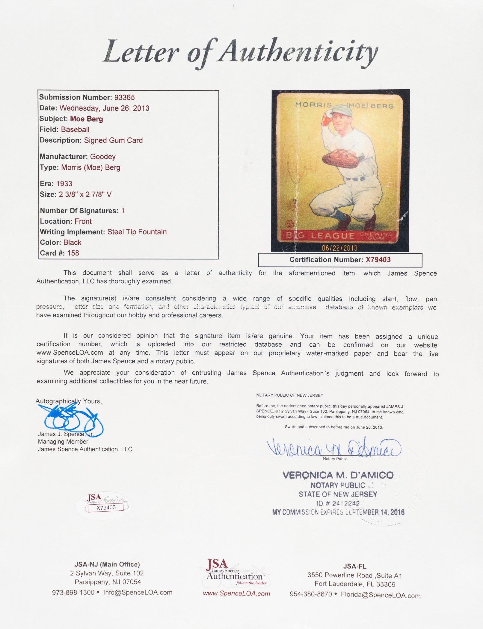 1933 Goudey Moe Berg card #158 signed by him on the front. PSA/DNA has encapsulated the card and certified the signature as "Authentic." Berg's signature, in black fountain pen to the left of his image, is light but legible. This is just the third signed example of this card we have ever offered one of only four certified by PSA/DNA. In Fair to Good condition overall with a few light creases, small, light stains, corner wear, and a tiny abrasions. Despite the flaws, this remains a visually appealing example of this exceedingly rare signed card, which is one of the keys to any signed 1933 Goudey set. Reserve $500.