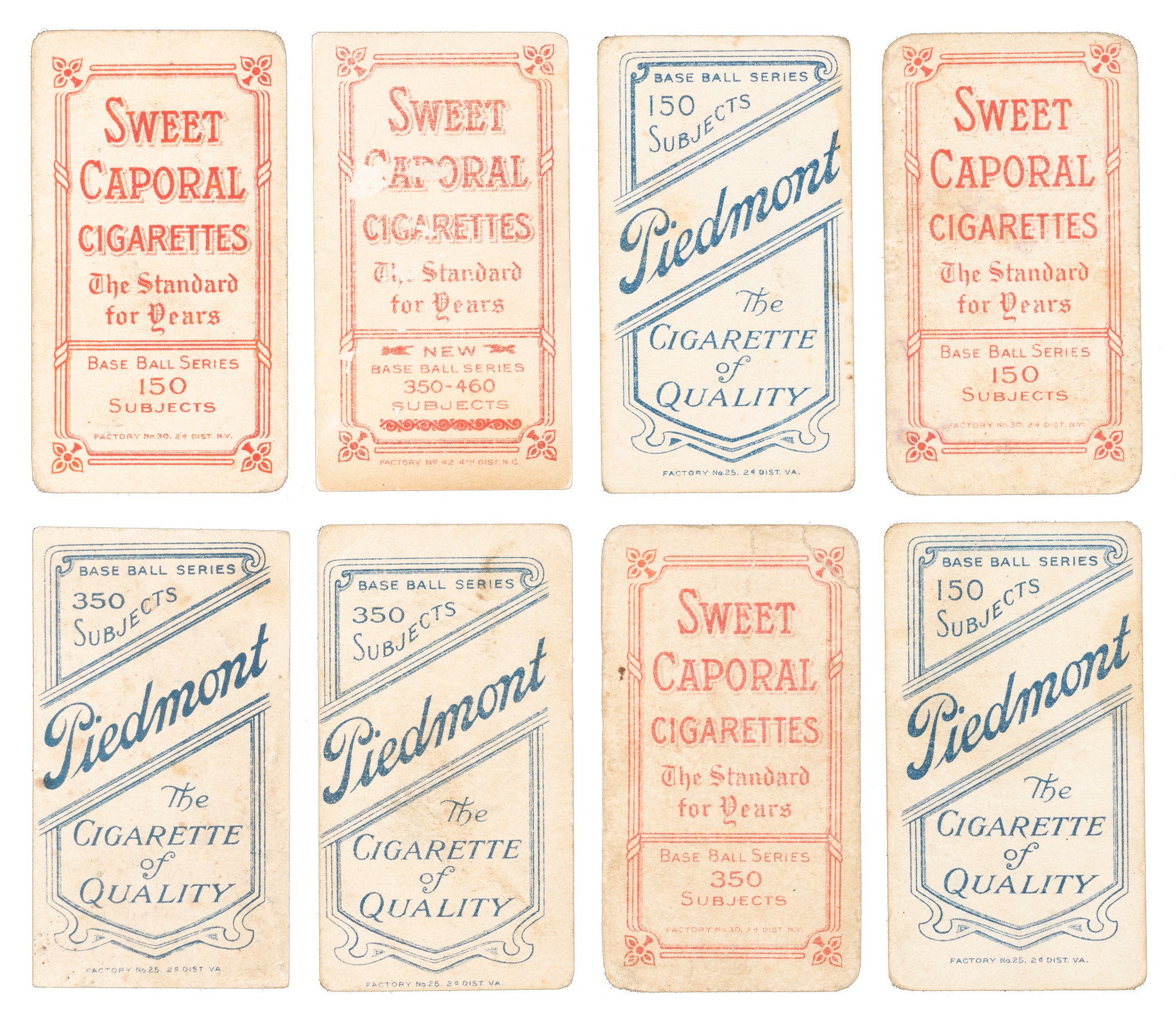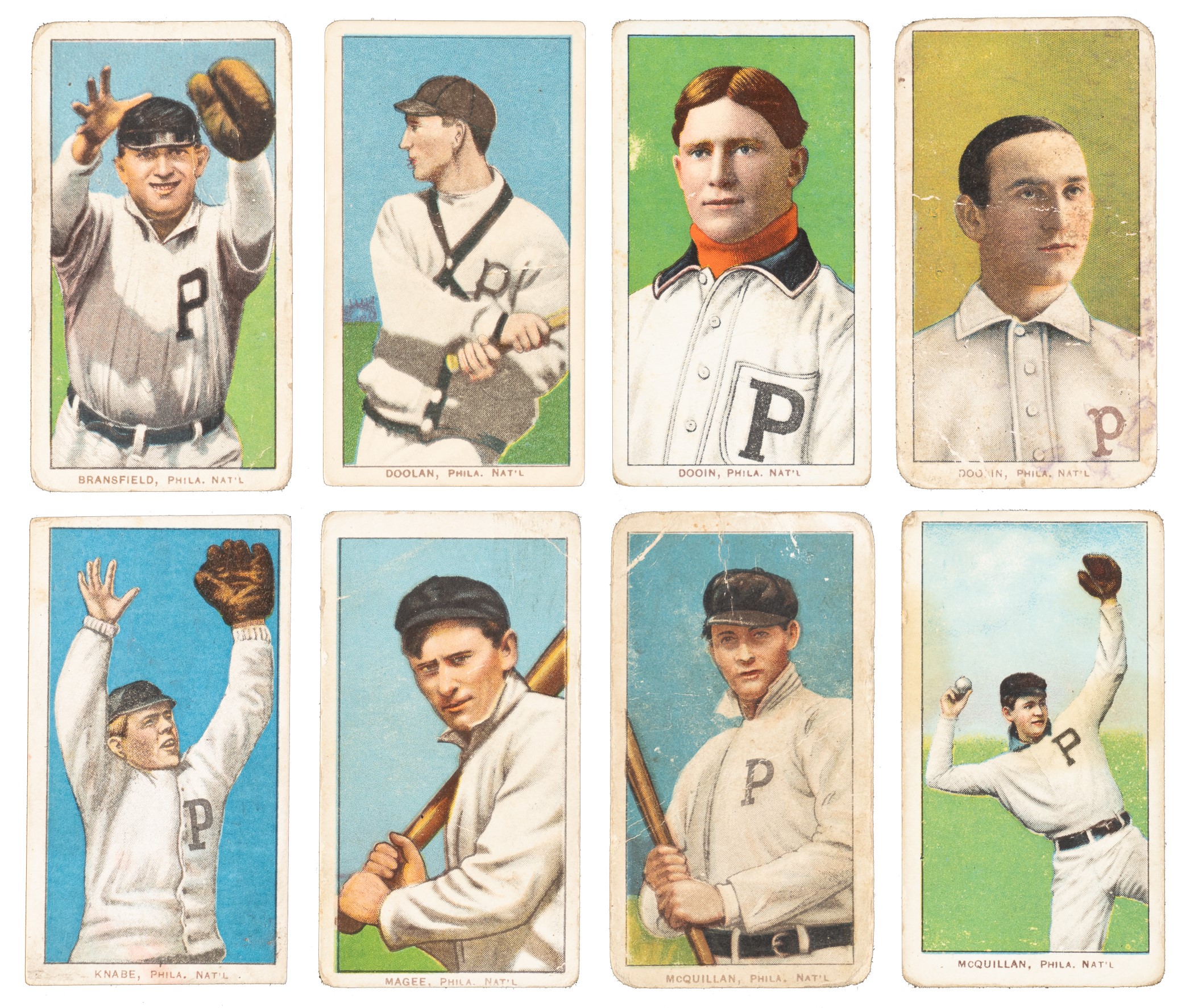 Collection of eight 1909-1911 T206 White Border tobacco Philadelphia Phillies cards (four Piedmont and four Sweet Caporal). This collection consists of the following: Bransfield (Fr-Gd), Doolan/Batting (Pr due to back damage), Dooin (Gd), Doolin (Pr), Knabe (Gd+), Magee/Bat (Fr-Gd), McQuillan/Bat (Pr), and McQuillan/Ball in Hand (Gd+). Total 8 cards. Reserve $10.