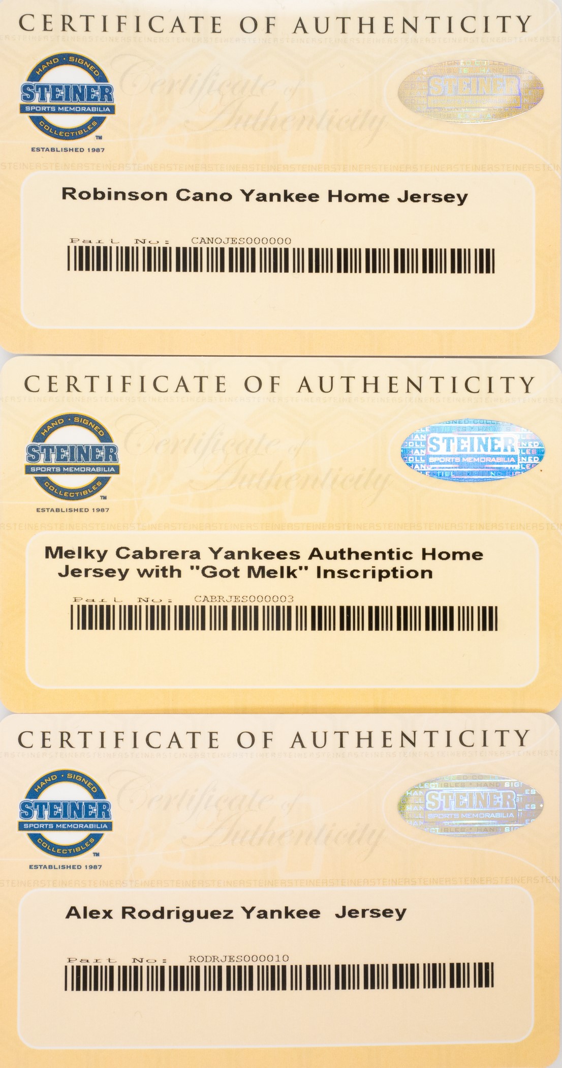 New York Yankees Alex Rodriguez, Robinson Cano, and Melky Cabrera signed Jersey. Steiner hologram on jerseys with certificates. The size/weight of this item requires that there will be an additional shipping charge for this lot. Reserve $10.