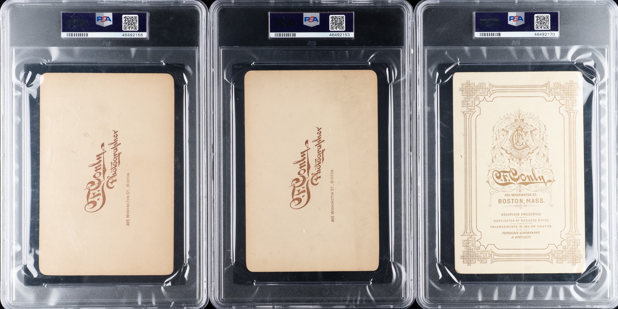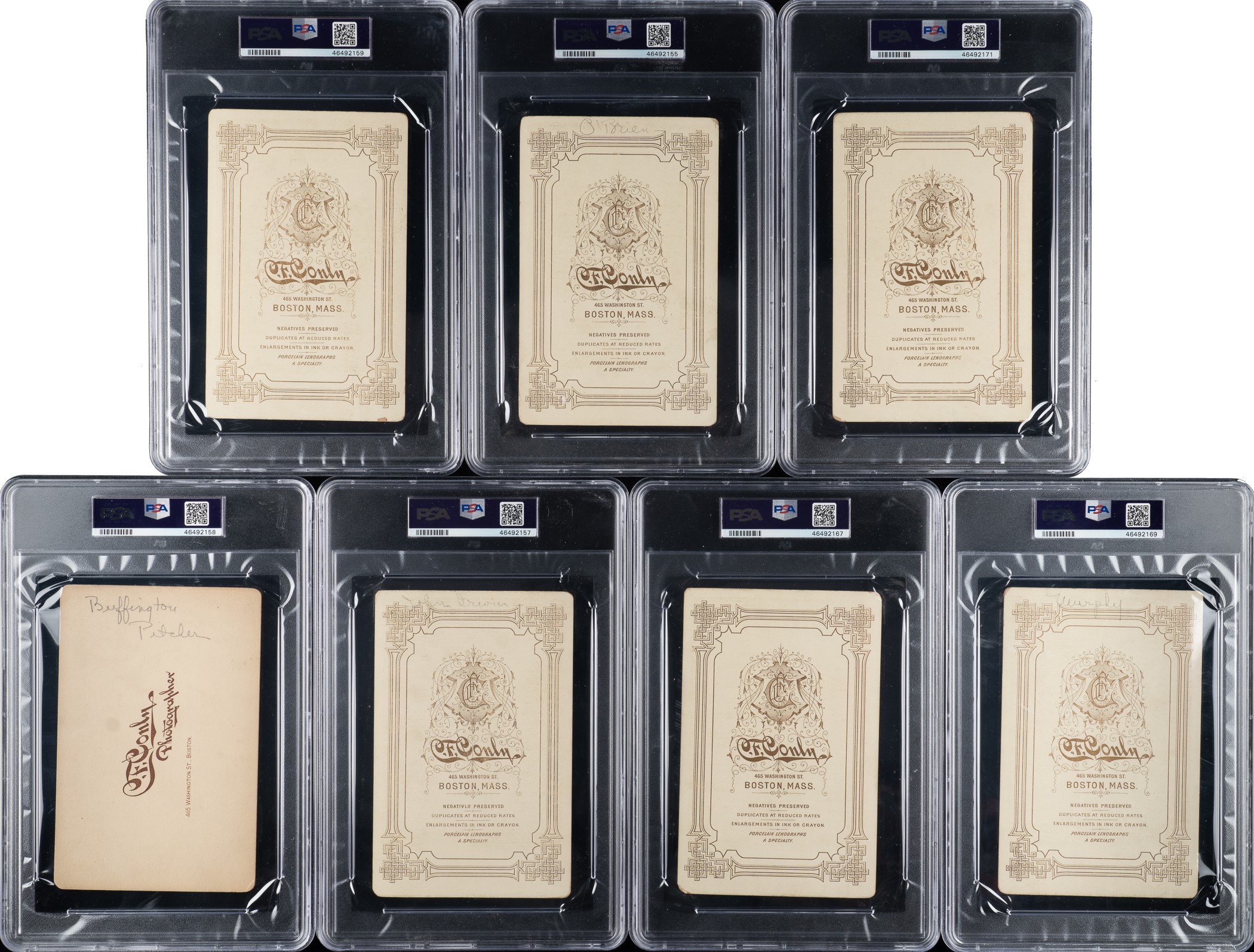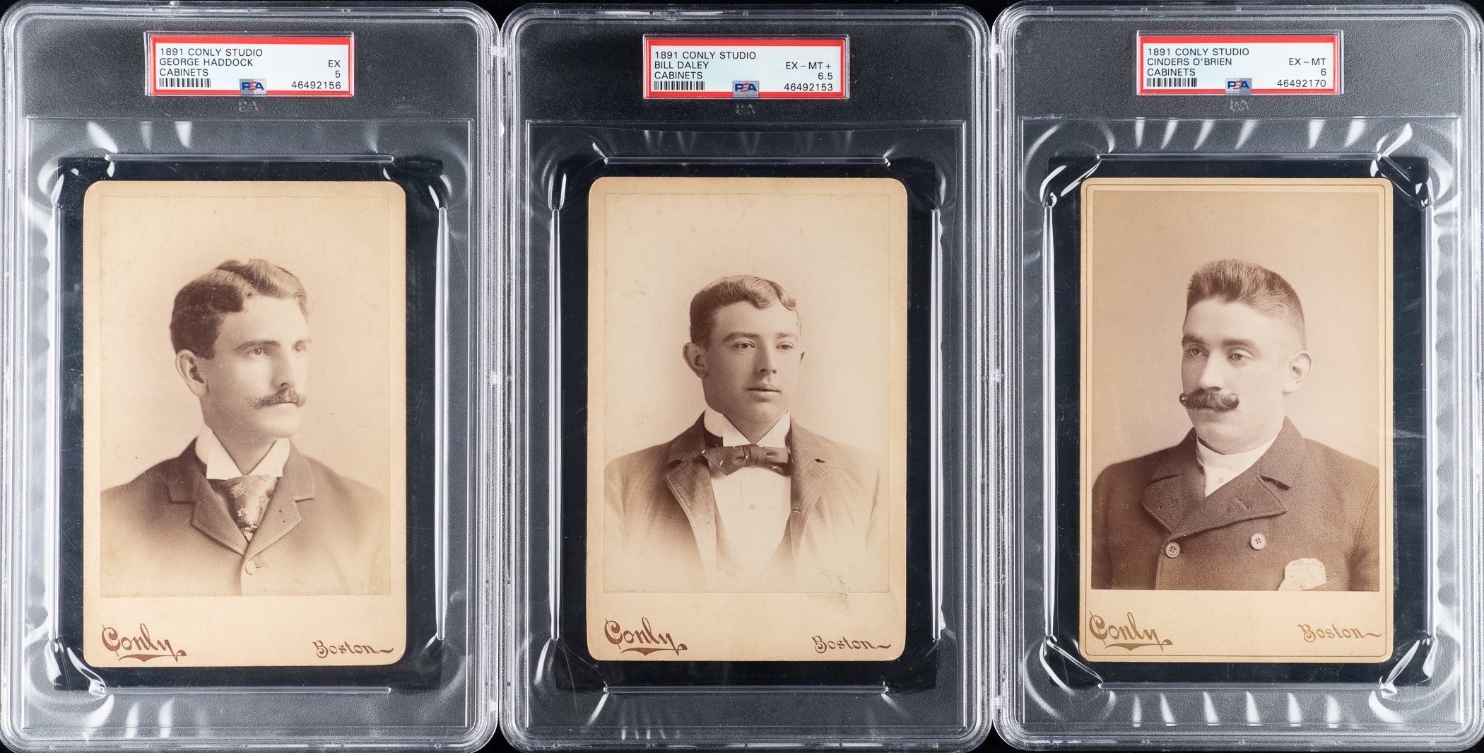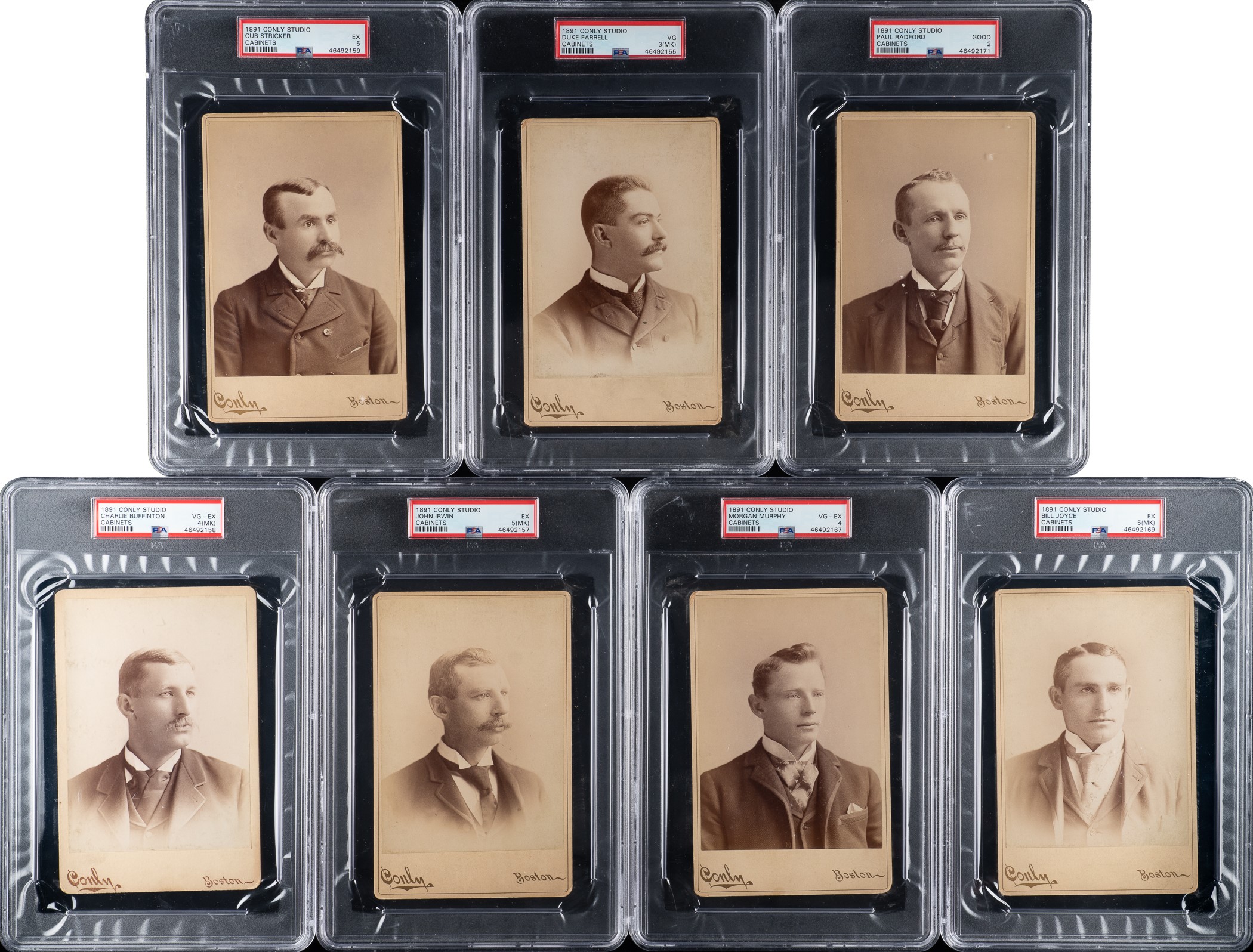Each of these ten baseball cabinet photos was produced by the Conly Photographic Studios of Boston, Massachusetts, and each pictures a member of the 1891 Boston Red Stockings, champions of the American Association in that league's final season of operation. Conly was one of the most prominent professional photographers specializing in baseball player images in the Boston area in the 1890s. This series is all the more interesting in that it is essentially a set unto itself, featuring players from the same team, and this might be the closest to a set ever issued of this significant Major League team. The early 1890s was a time of great turmoil in the business of professional baseball. The Players' League, the National League, and the American Association all vied for the attention and support of the ticket-buying public in 1890. The Players' League survived only the one season, but the financially weakened American Association, a major league since 1883, also fell victim to the heated competition. The 1891 season was the swan song of the legendary second major league, and the Boston Red Stockings were its premier team and final champions.Each cabinet card (4.25 x 6.5 inches) is nearly identical in design and features a sepia photo of the player dressed in formal attire. The photographer's name and city ("Conly" and "Boston") are printed along the front base of the mount, and the reverse features advertising for the Conly studio (two different back variations are featured in this group). Each card has been professionally graded and encapsulated by PSA. The collection consists of the following: Charlie Buffinton (VG-EX 4 [MK]), Bill Daley (EX-MT+ 6.5), Duke Farrell (VG 3 [MK]), George Haddock (EX 5), John Irvin (EX 5 [MK]), Bill Joyce (EX 5 [MK]), Morgan Murphy (VG-EX 4), Cinders O'Brien (EX-MT 6), Paul Radford (GOOD 2), and Cub Stricker (EX 5). This is a fascinating and very attractive cabinet-card collection featuring members of the 1891 Boston Red Stockings, the last champions of the American Association. Total: 10 cabinet cards. Reserve $1,000.