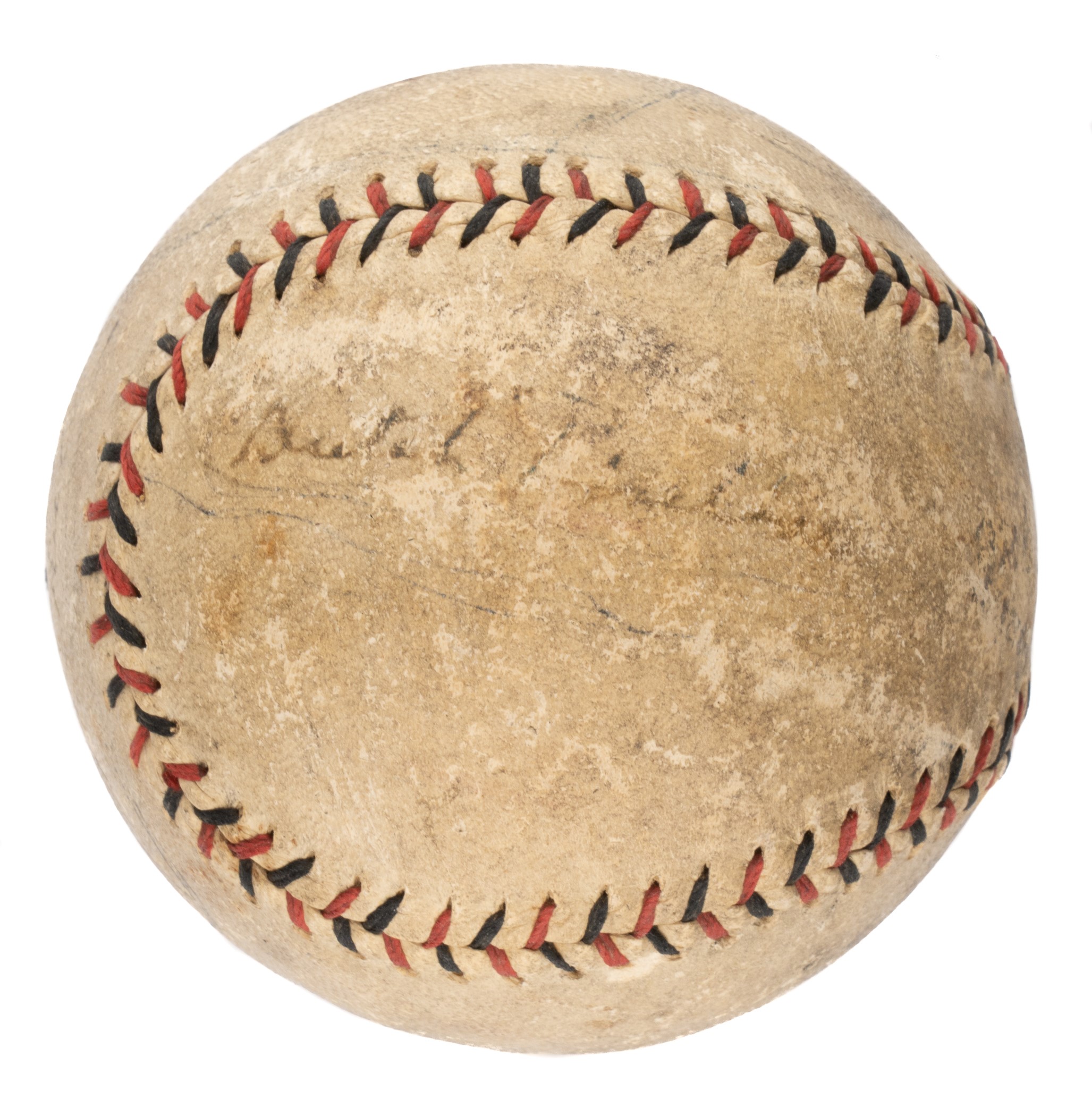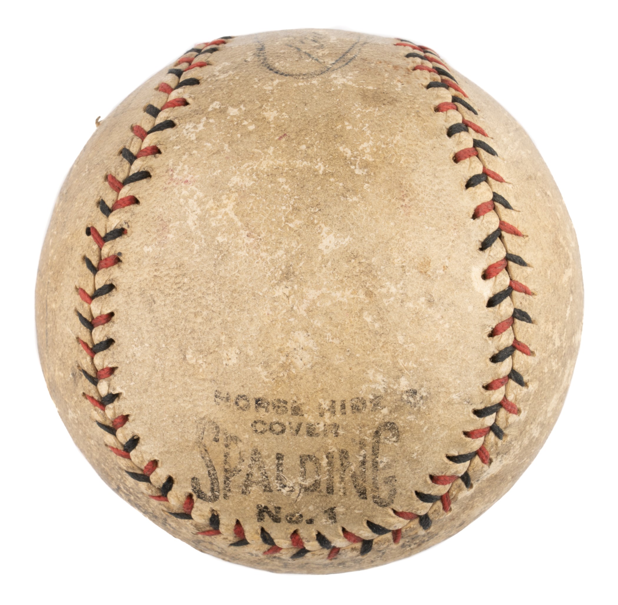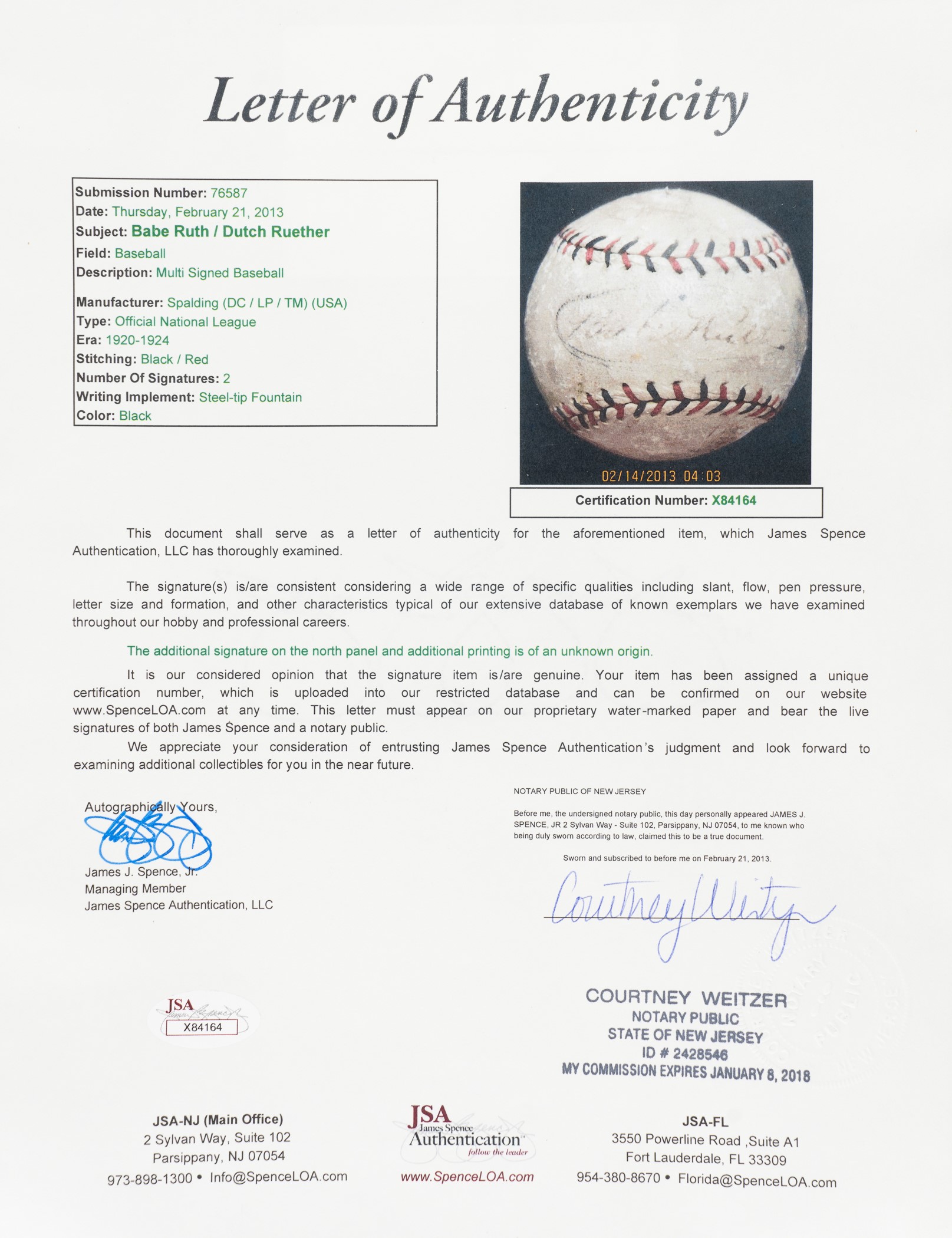 Official National League baseball (Heydler) signed in black fountain pen, on separate panels, by Babe Ruth and Dutch Ruether. Ruth's signature appears on the sweet spot, and Ruether's has been signed upside down on a side panel. There is an additional signature on a side panel in an unknown hand. Ruth and Ruether were teammates on the New York Yankees in 1926 and 1927. Though we do not know the history of this ball, it seems reasonable to assume that it was signed by the pair sometime during those two seasons. The ball is moderately soiled, including a few areas of discoloration, and most of the manufacturer's labels have faded (enough of the main label remains visible to positively identify it as an official National League ball). There are surface abrasions throughout and a printed ink notation on a side panel. In Fair to Good condition overall. Despite the flaws, the early Ruth signature remains clearly legible. Though this does not qualify as a Babe Ruth single-signed ball, it certainly displays as one. Full LOA from James Spence/JSA. Reserve $500.
