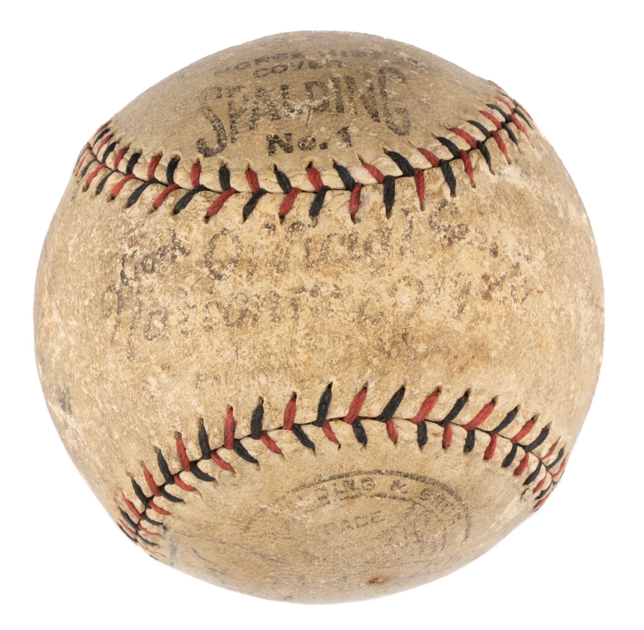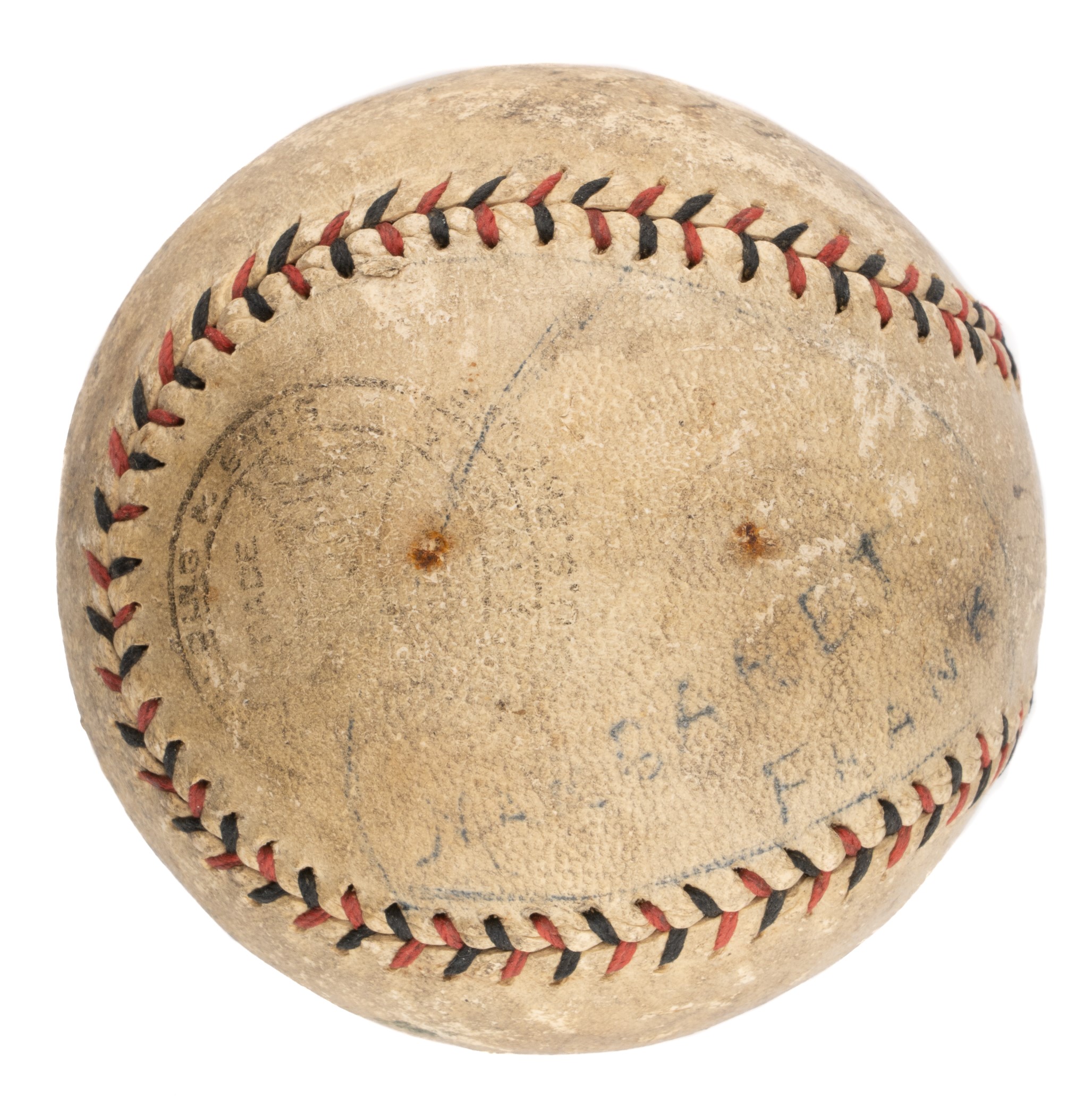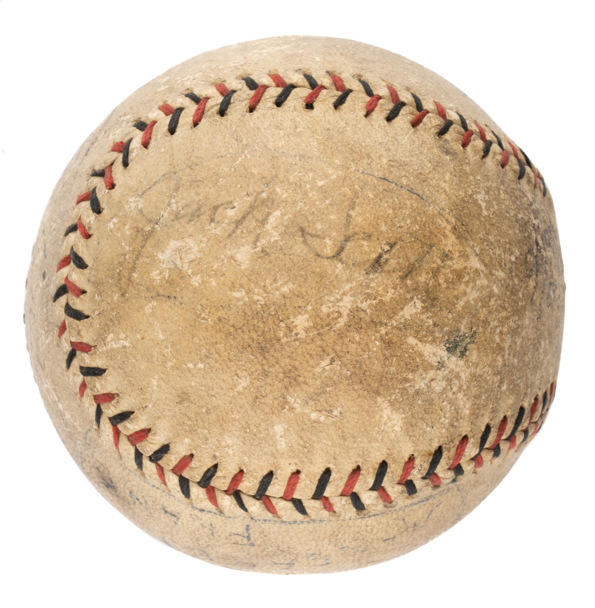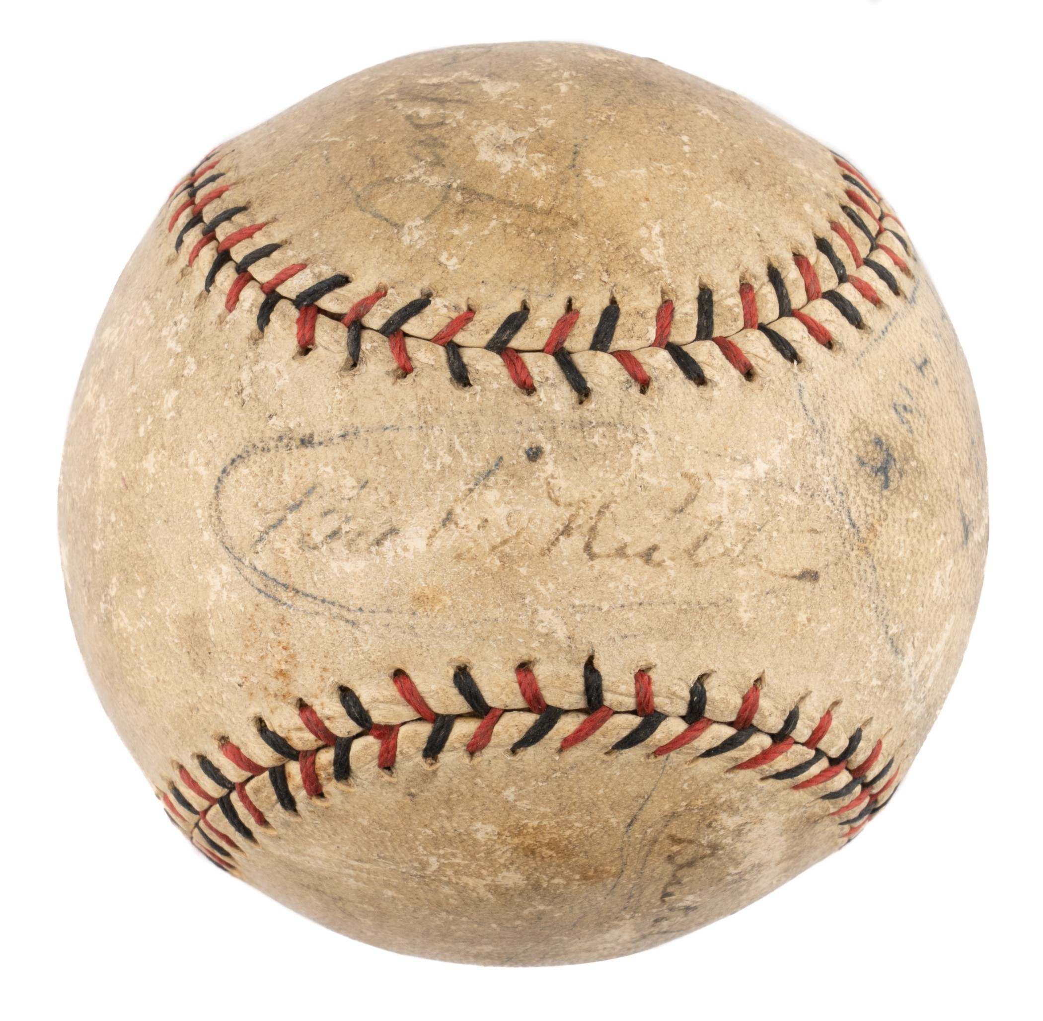Official National League baseball (Heydler) signed in black fountain pen, on separate panels, by Babe Ruth and Dutch Ruether. Ruth's signature appears on the sweet spot, and Ruether's has been signed upside down on a side panel. There is an additional signature on a side panel in an unknown hand. Ruth and Ruether were teammates on the New York Yankees in 1926 and 1927. Though we do not know the history of this ball, it seems reasonable to assume that it was signed by the pair sometime during those two seasons. The ball is moderately soiled, including a few areas of discoloration, and most of the manufacturer's labels have faded (enough of the main label remains visible to positively identify it as an official National League ball). There are surface abrasions throughout and a printed ink notation on a side panel. In Fair to Good condition overall. Despite the flaws, the early Ruth signature remains clearly legible. Though this does not qualify as a Babe Ruth single-signed ball, it certainly displays as one. Full LOA from James Spence/JSA. Reserve $500.