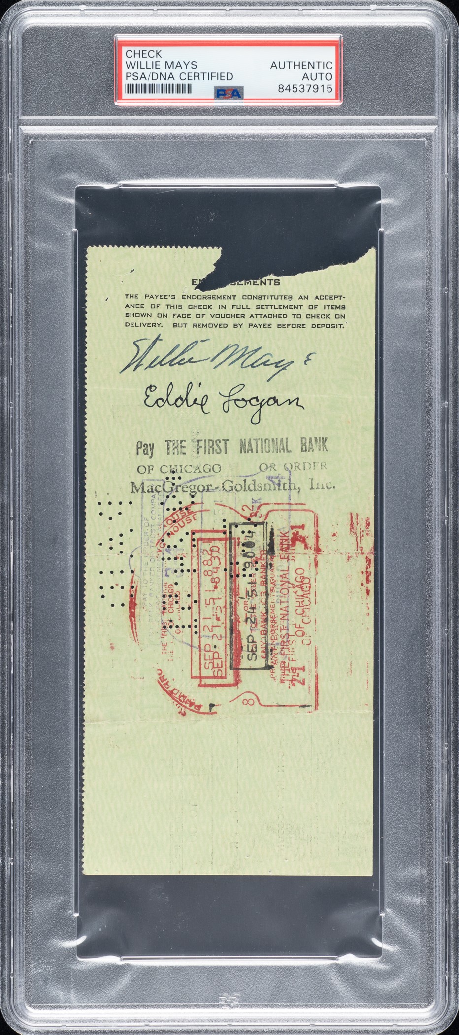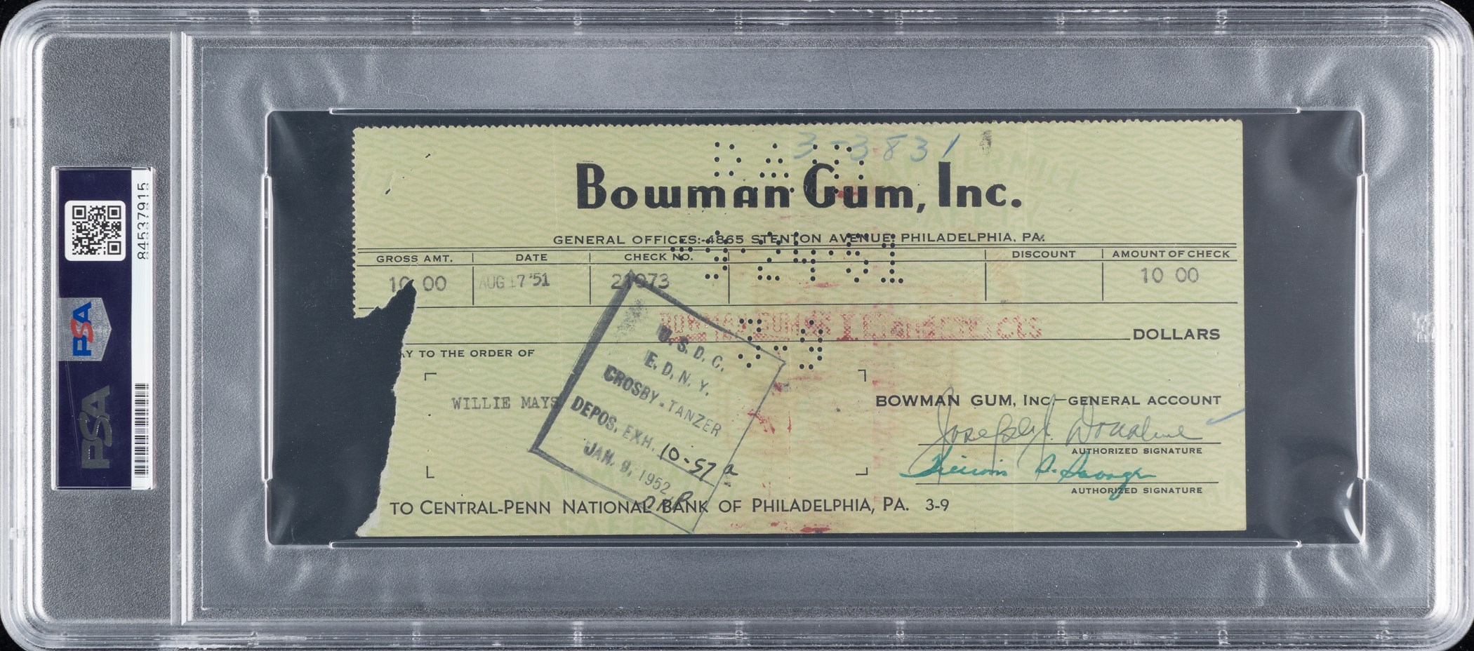 Royalty check to Willie Mays from the Bowman Gum Co. for his image and likeness in the 1951 Bowman baseball card set, endorsed by Mays on the reverse. PSA/DNA has encapsulated the check and certified the signature as "Authentic." Not only is this one of the earliest Mays' signatures we have offered in the past 20 plus years, but this royalty check also has direct ties to his rookie card, one of the iconic cards in the hobby. The check, dated August 17, 1951, and drawn on the Central-Penn National Bank of Philadelphia, Pennsylvania, is made out to “Willie Mays” in the amount of $10. Signed by a pair of Bowman executives along the base. Mays has signed the check on the reverse in black fountain pen. Also endorsed by the Giants equipment manager, “Eddie Logan." The check (7.5 x 3.5 inches) displays a tear along the left edge, blue ink notations along the top edge, and normal bank cancellation stamps and holes. In Fair condition overall. Reserve $500.