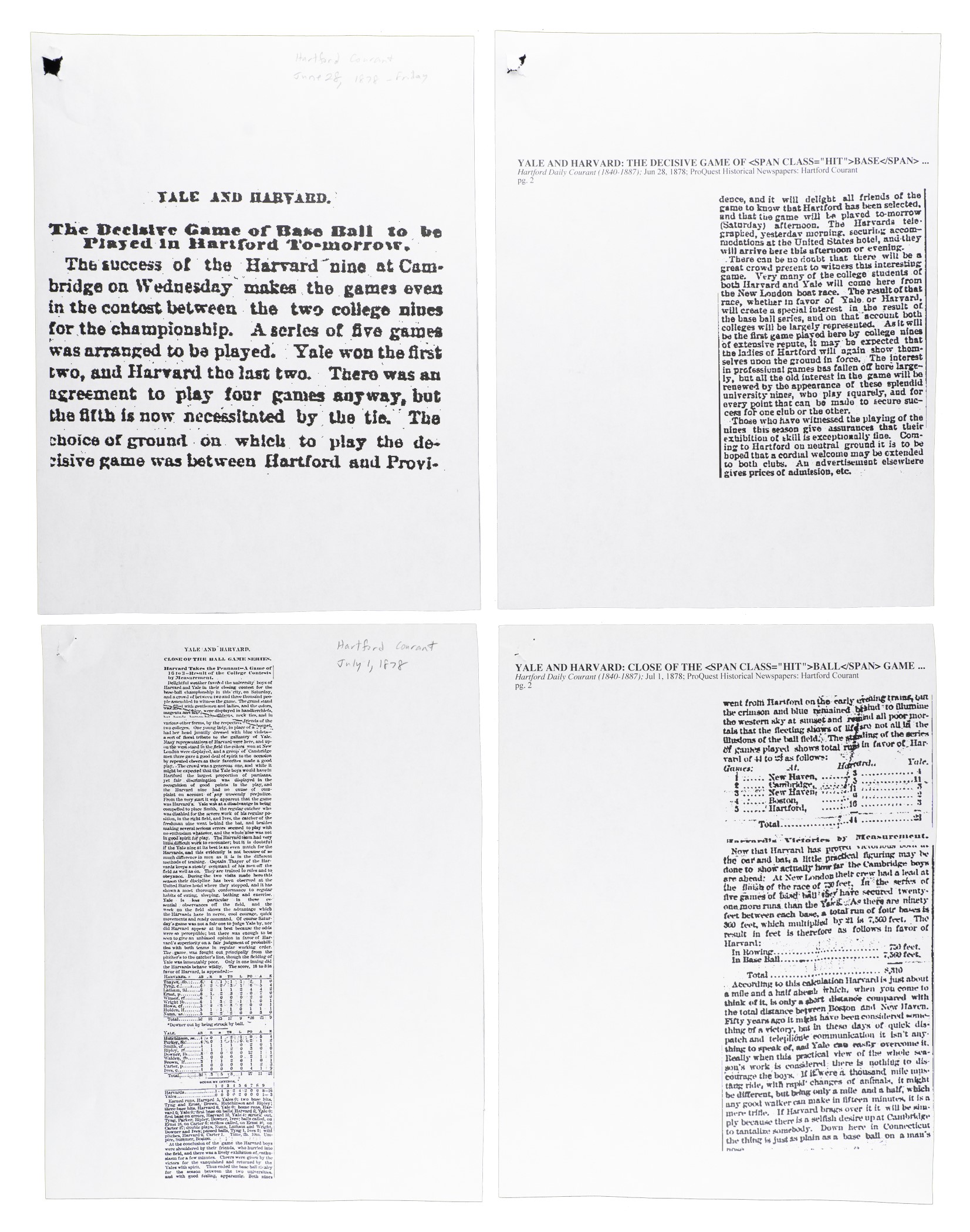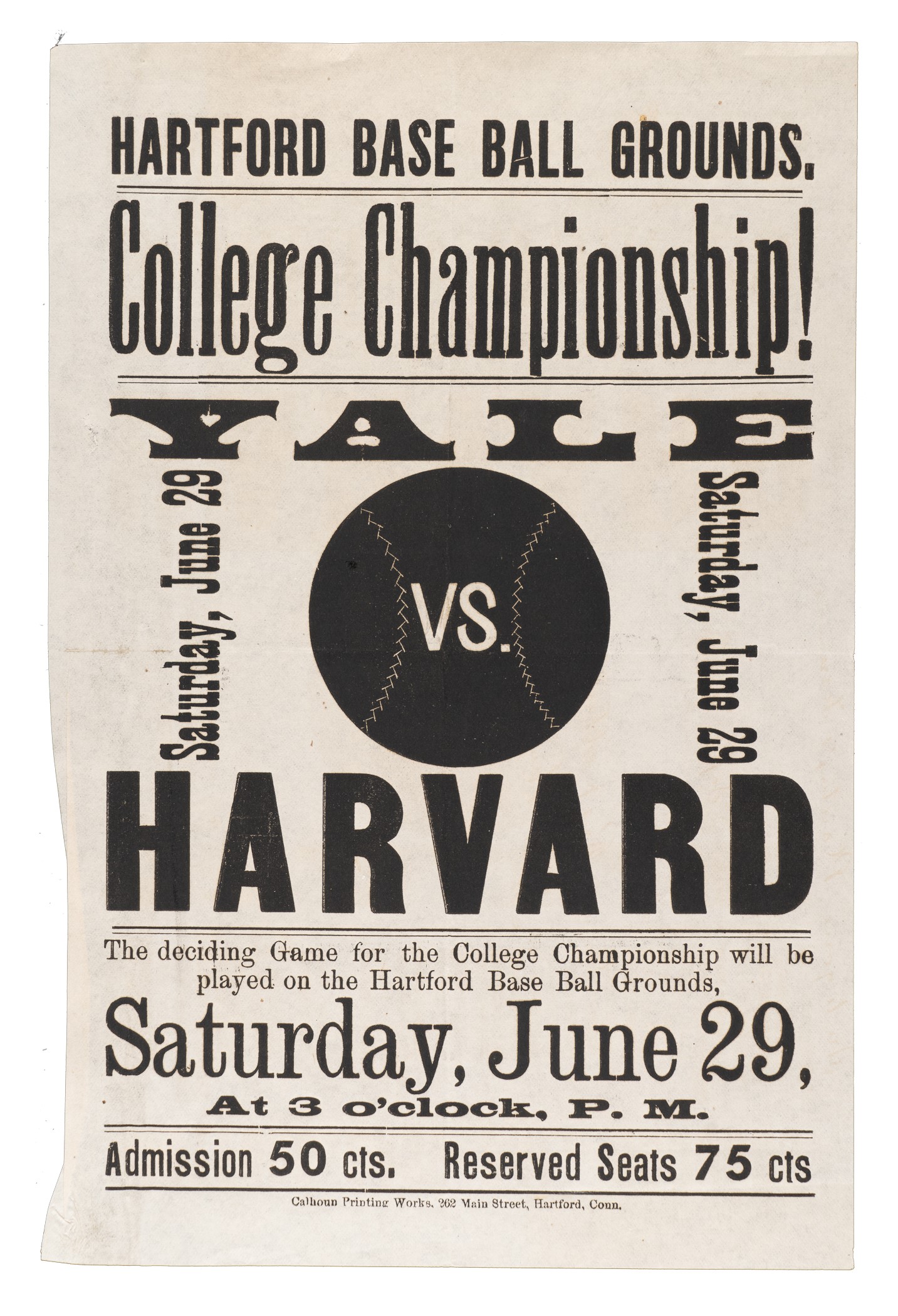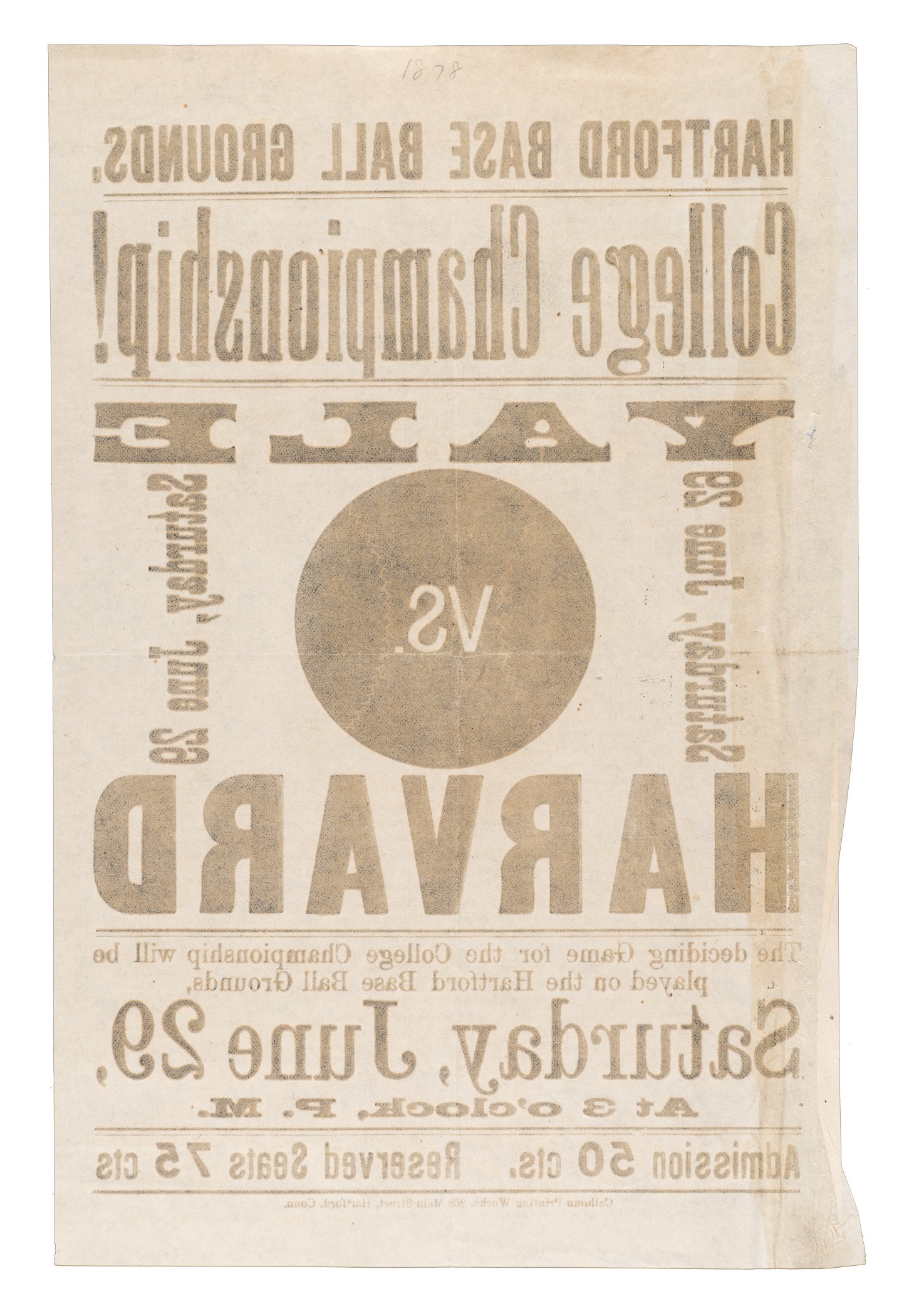 Broadside heralding the fifth and deciding game of the college baseball championship between the Yale Bulldogs and Harvard Crimson at Hartford Baseball Grounds in Hartford, Connecticut, on Saturday, June 29th, 1878. After winning the first two games of the series, Yale proceeded to drop the next three including the decisive contest, which Harvard won 10-3. The broadside (6.75 x 10.25 inches) displays an uneven cut along the left edge and a few spots of surface wrinkling but otherwise presents in Excellent condition. The broadside is accompanied by four pages of reference material. Reserve $200.
