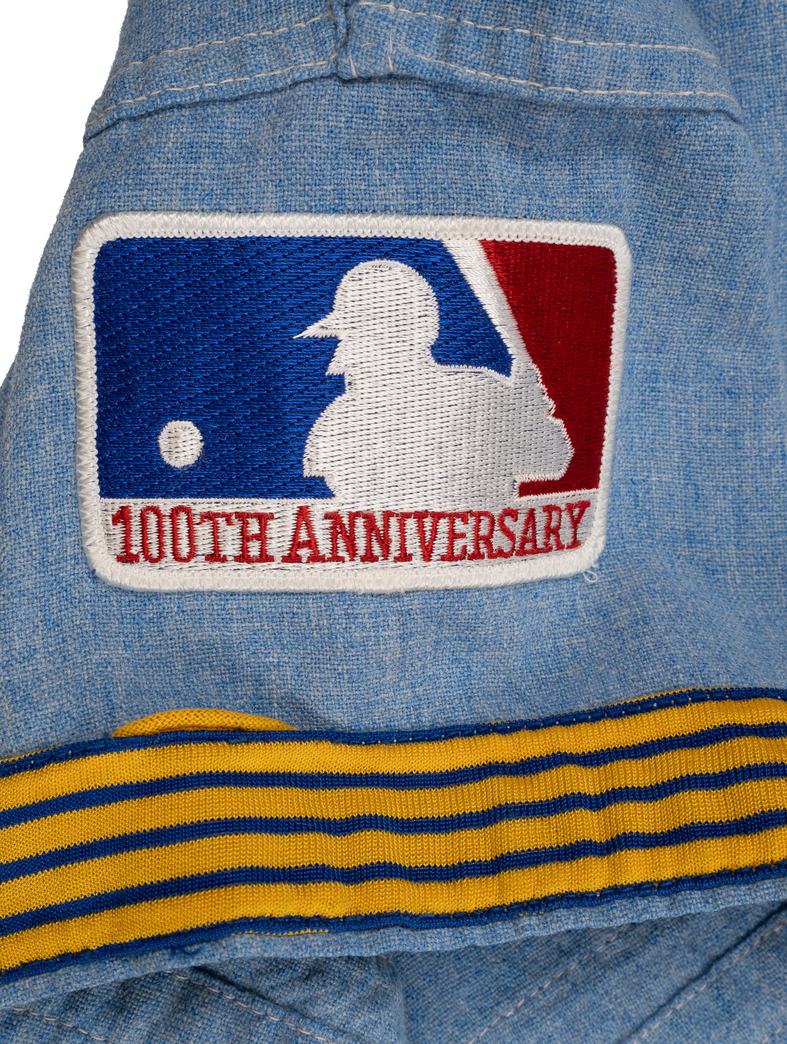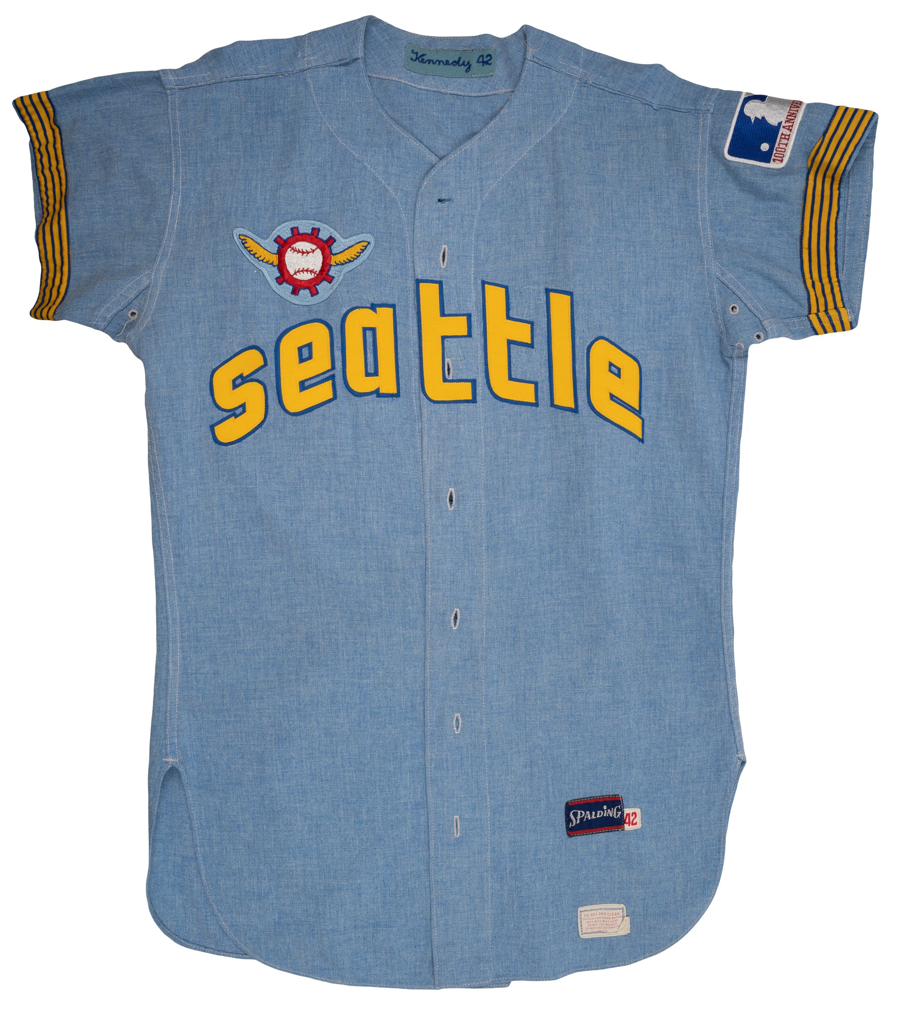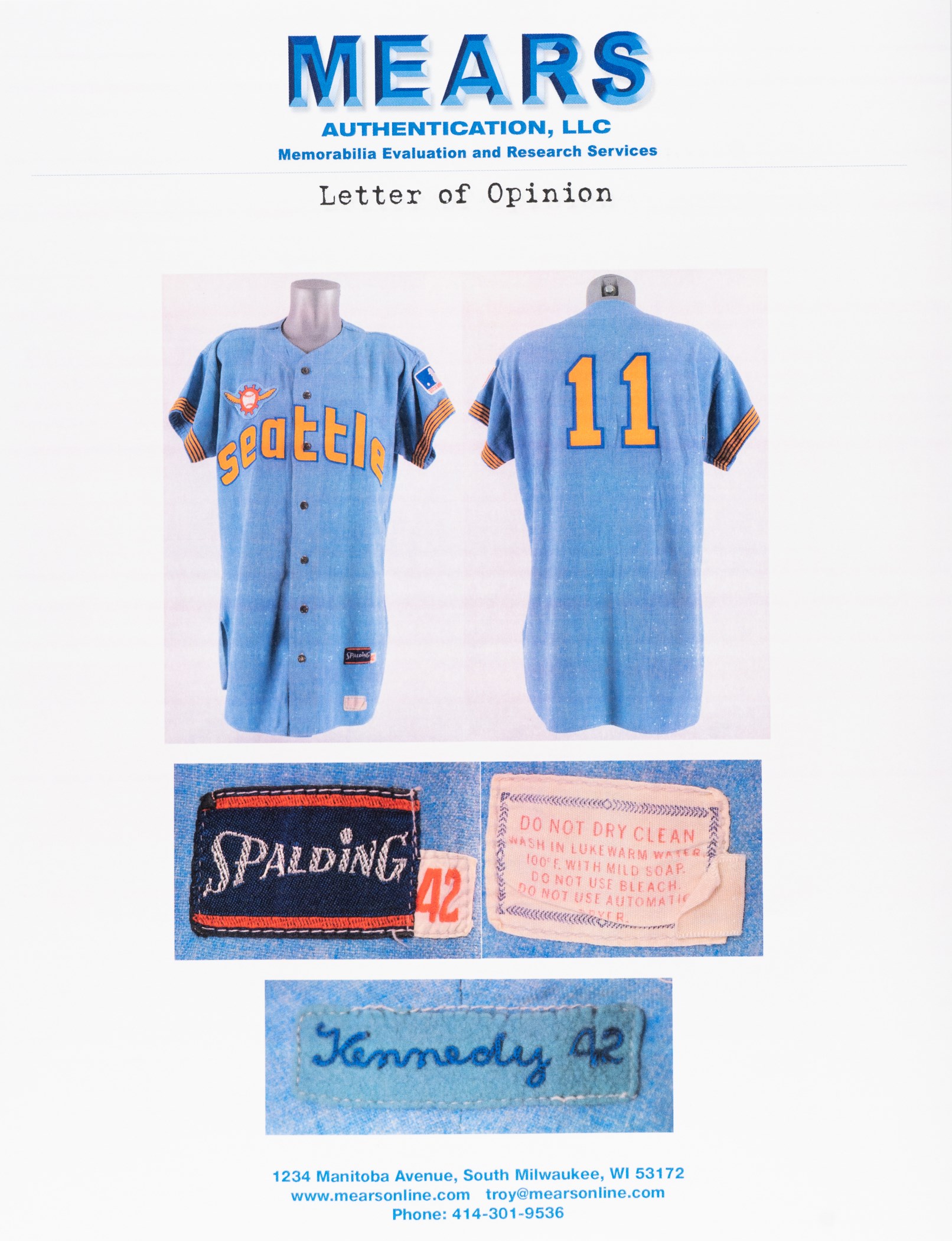 Rare 1969 Seattle Pilots road jersey worn by infielder John Kennedy during the club's only season. The blue flannel jersey is lettered "Seattle" across the front and features the club’s embroidered logo patch on the right breast. The number "11" appears on the reverse. All letters and numerals are appliquéd in gold on blue tackle twill. A Major League Baseball "100th Anniversary" patch adorns the left sleeve. The player's name and jersey size ("Kennedy 42") are chain-stitched in blue upon a blue strip tag in the collar. Located on the left front tail are a "Spalding" label, an adjacent "42" size tag, a laundry tag, and a flag tag reading "Set 1 1969." All of the letters and numerals on the front and back, including the front logo patch, as well as the 100th Anniversary patch on the left sleeve have been restored. The name tag in the collar and the tagging/labels on the left front tail are all original. Moderate wear is displayed throughout.