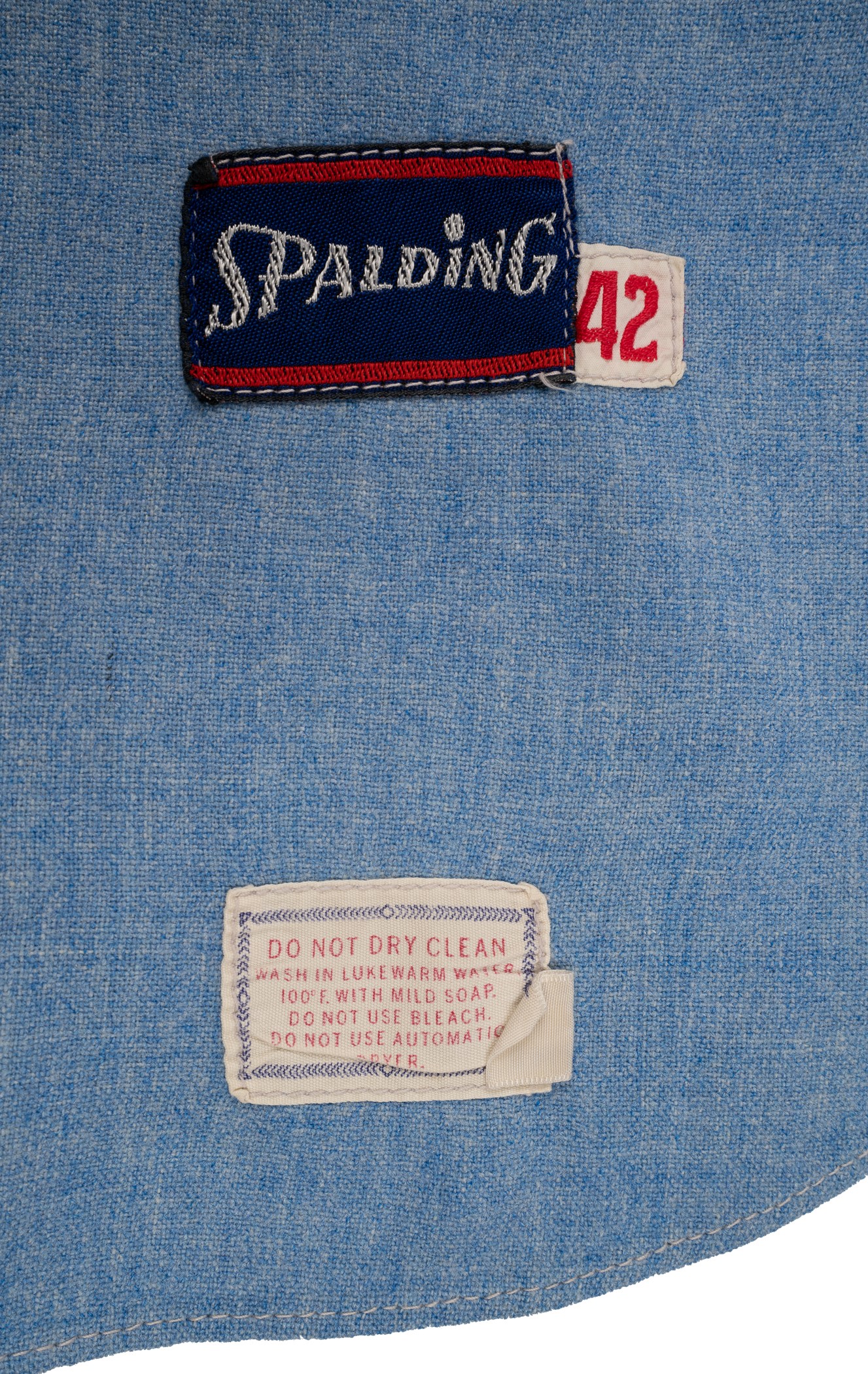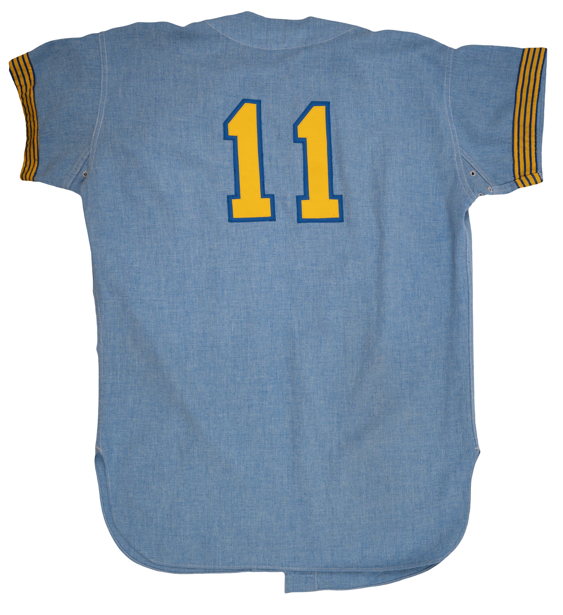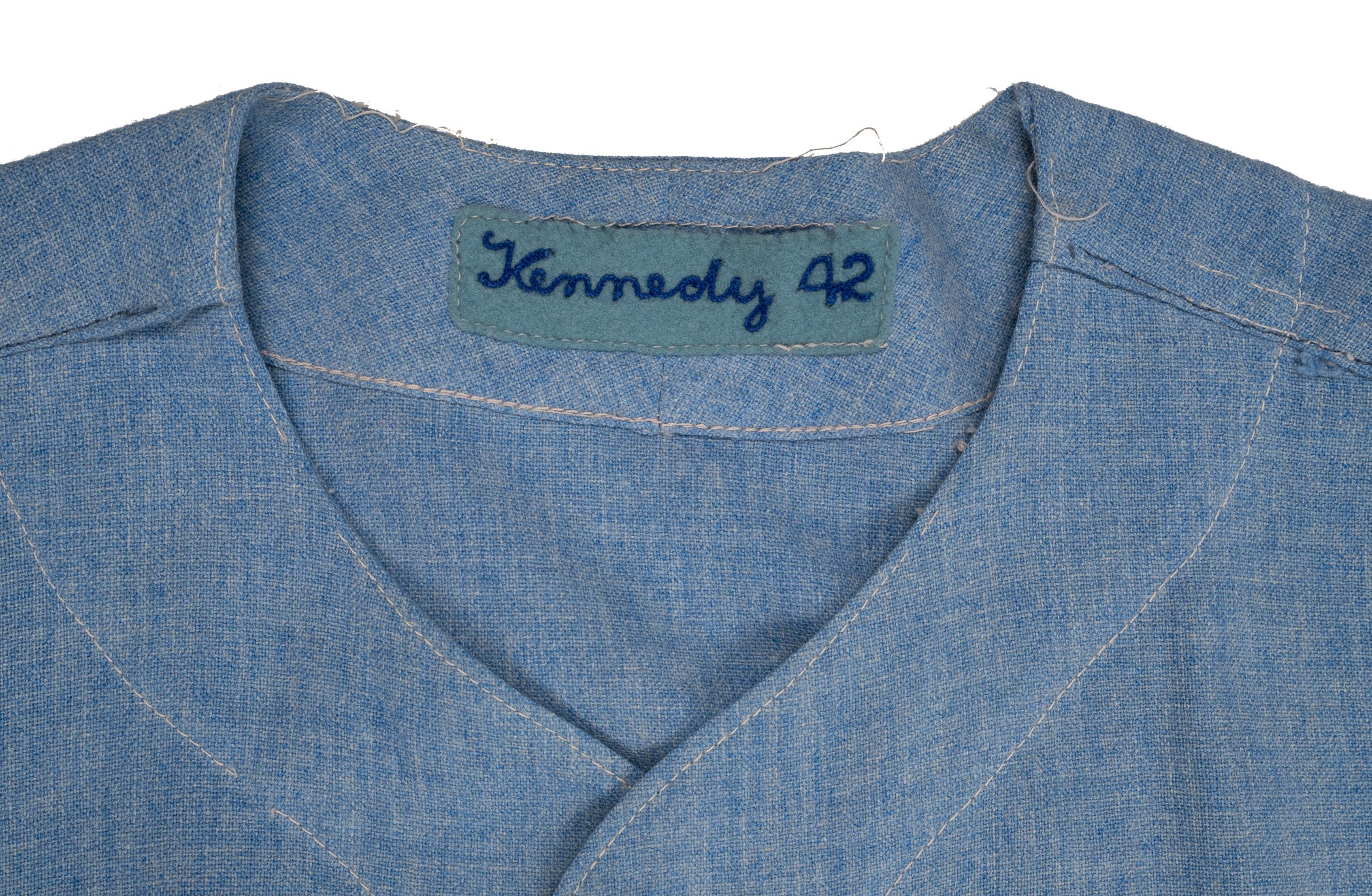 Rare 1969 Seattle Pilots road jersey worn by infielder John Kennedy during the club's only season. The blue flannel jersey is lettered "Seattle" across the front and features the club’s embroidered logo patch on the right breast. The number "11" appears on the reverse. All letters and numerals are appliquéd in gold on blue tackle twill. A Major League Baseball "100th Anniversary" patch adorns the left sleeve. The player's name and jersey size ("Kennedy 42") are chain-stitched in blue upon a blue strip tag in the collar. Located on the left front tail are a "Spalding" label, an adjacent "42" size tag, a laundry tag, and a flag tag reading "Set 1 1969." All of the letters and numerals on the front and back, including the front logo patch, as well as the 100th Anniversary patch on the left sleeve have been restored. The name tag in the collar and the tagging/labels on the left front tail are all original. Moderate wear is displayed throughout.