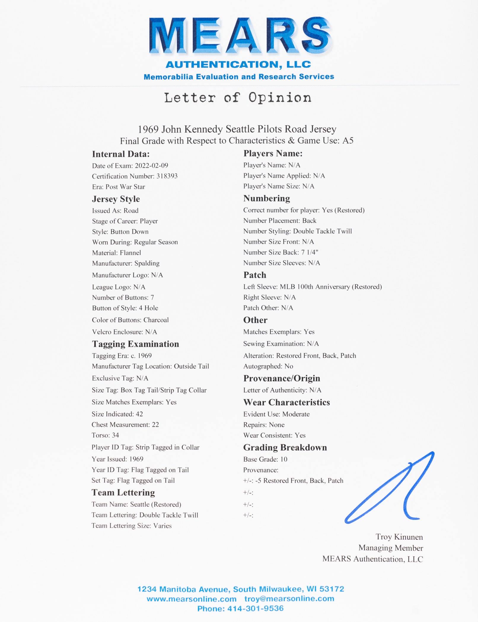 1969 John Kennedy Seattle Pilots Game-Used Road Jersey MEARS A5