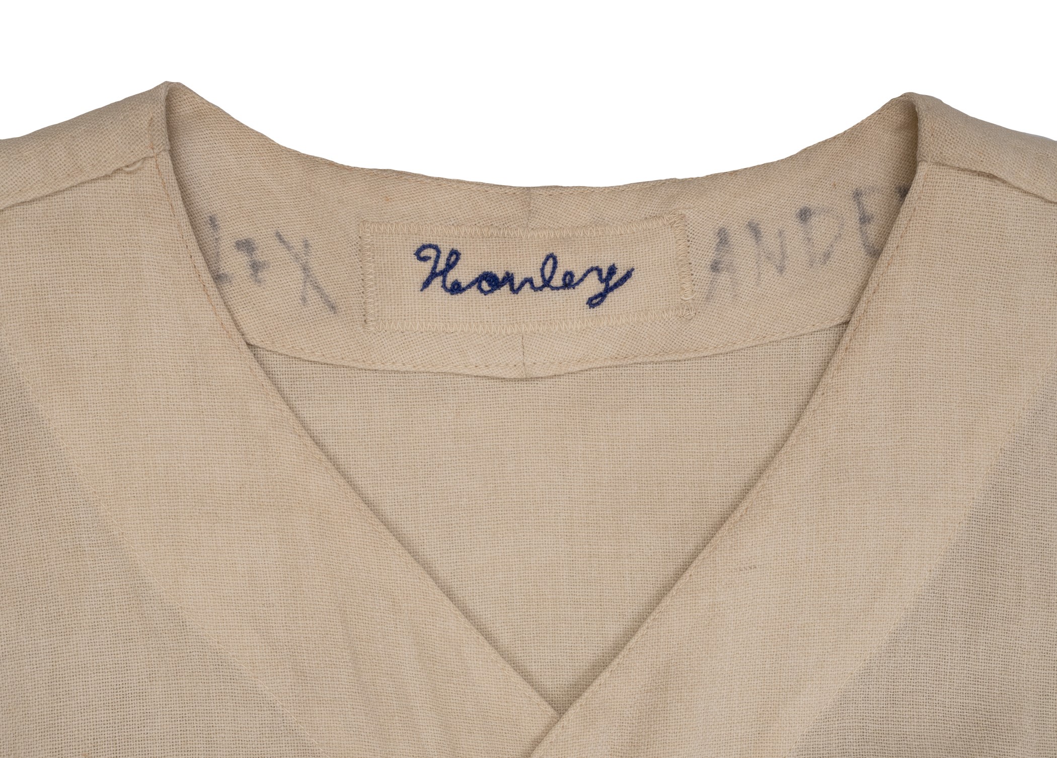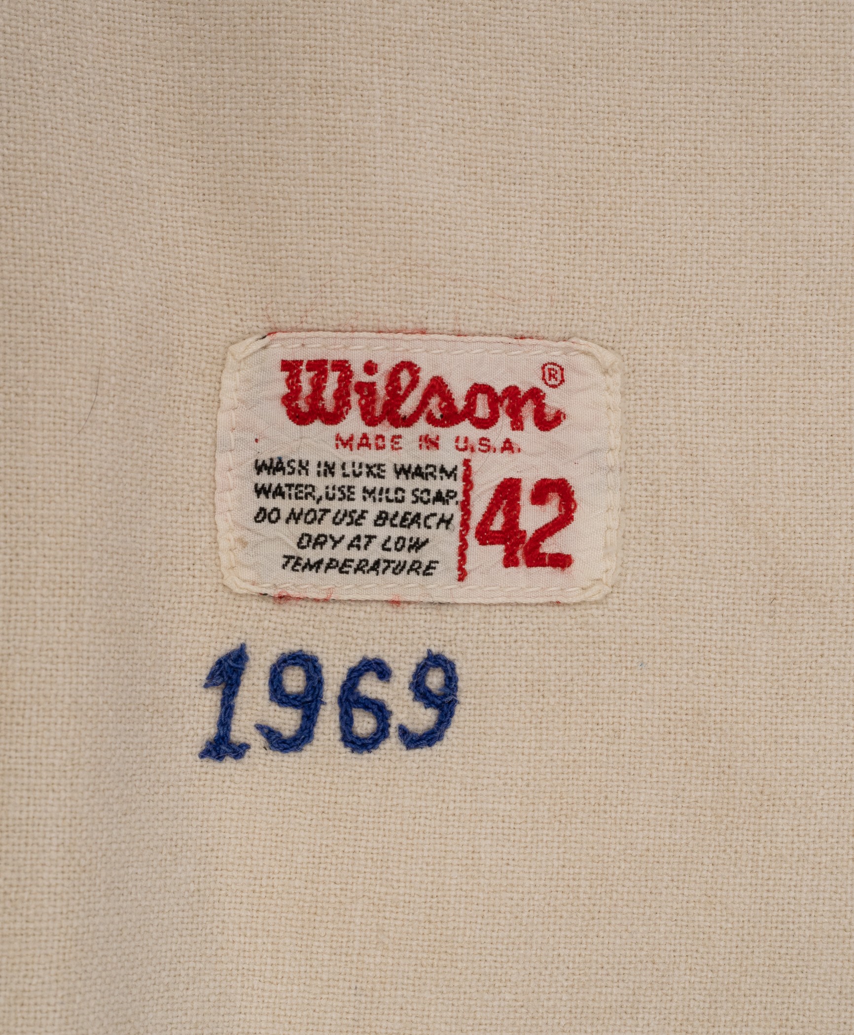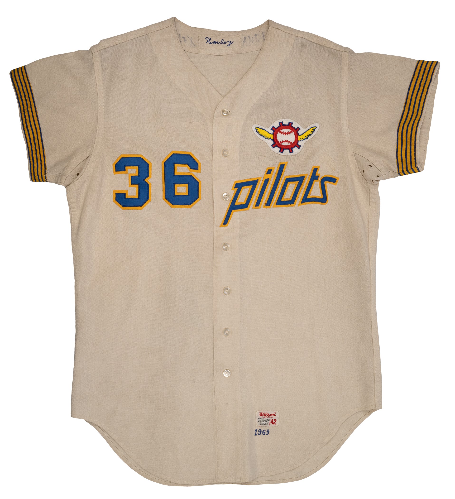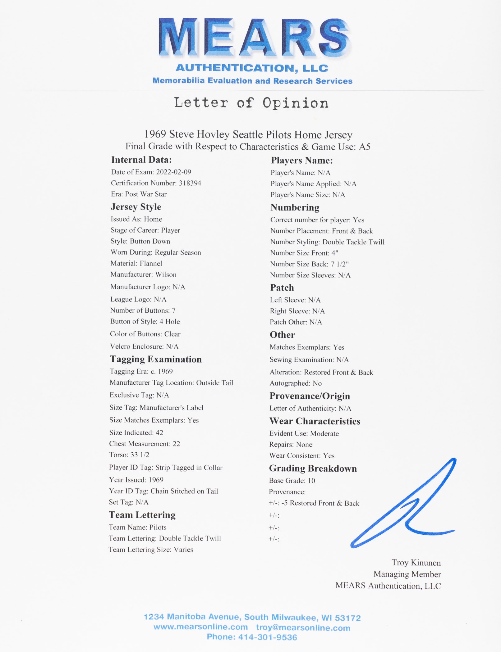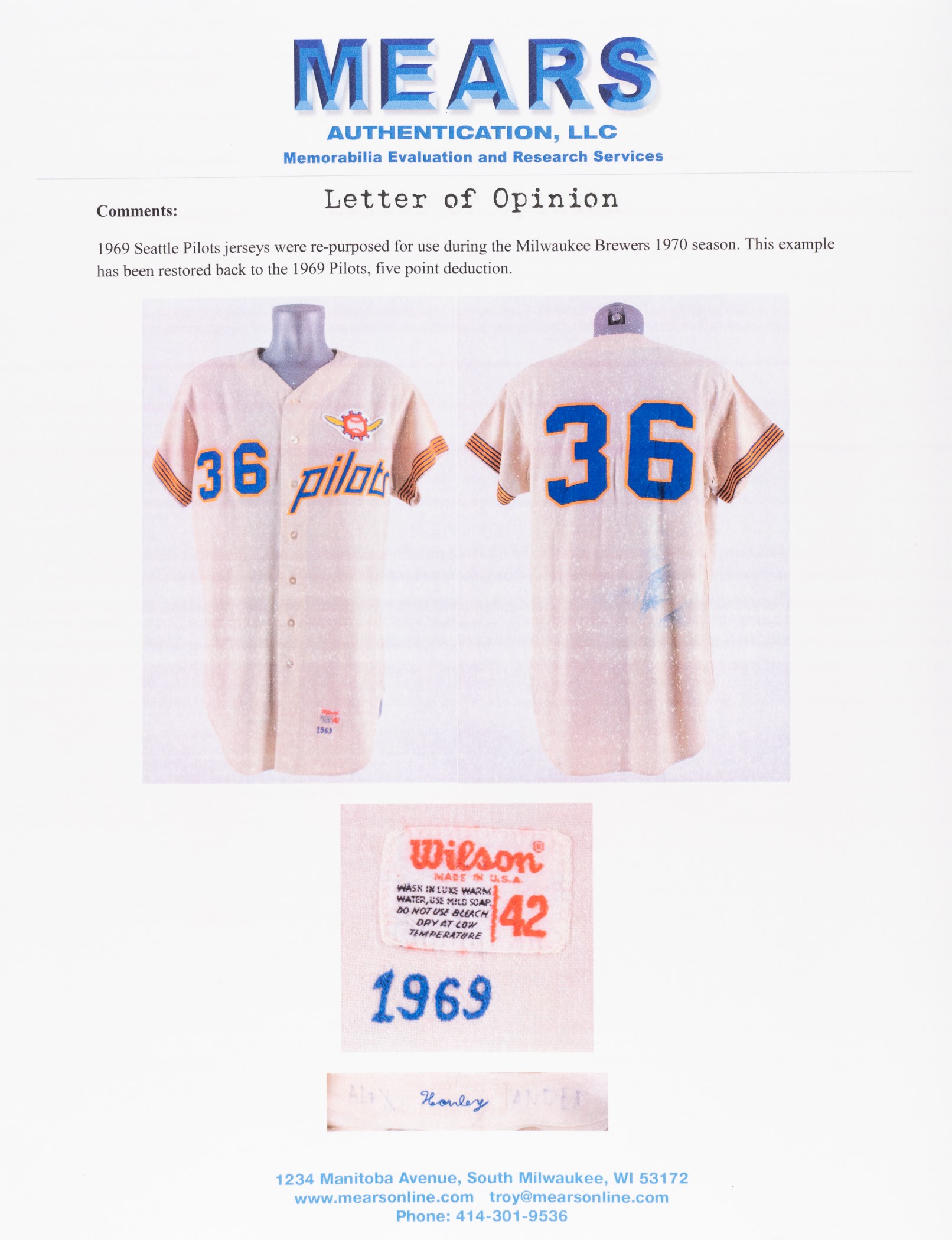 Rare 1969 Seattle Pilots home jersey worn by outfielder Steve Holvey during the club's only season. The white flannel jersey is lettered "Pilots" on the left breast, above which is the club’s embroidered logo patch. The number "36" appears on the both the right breast and reverse. All letters and numerals are appliquéd in blue on gold tackle twill. The player's name ("Hovley") is chain-stitched in blue upon a blue strip tag in the collar. The name of another individual ("Alex Ander") is written in blue laundry marker on either side of the name tag. The year "1969" is chain-stitched in blue on the left front tail, above which is a "Wilson 42" label. All of the letters and numerals on the front and back, including the front logo patch, have been restored. The name tag in the collar and the tagging/labels on the left front tail are all original. Moderate wear is displayed throughout.The history of the Seattle Pilots is quite brief. Joining the American League as an expansion club in 1969, the franchise, due to financial considerations, was quickly sold and relocated to Milwaukee the following spring. Although the team hardly distinguished itself on the field, finishing in last place with a 64-98 record, the club was later immortalized in Jim Bouton's groundbreaking "tell all" book, Ball Four. Because the Pilots played only one year in Seattle, game-used items, especially jerseys, are exceedingly rare. Graded A5 by MEARS (base grade of 10, with 5 points deducted for the replaced numbers and letters). Full LOA from MEARS. Reserve $500.