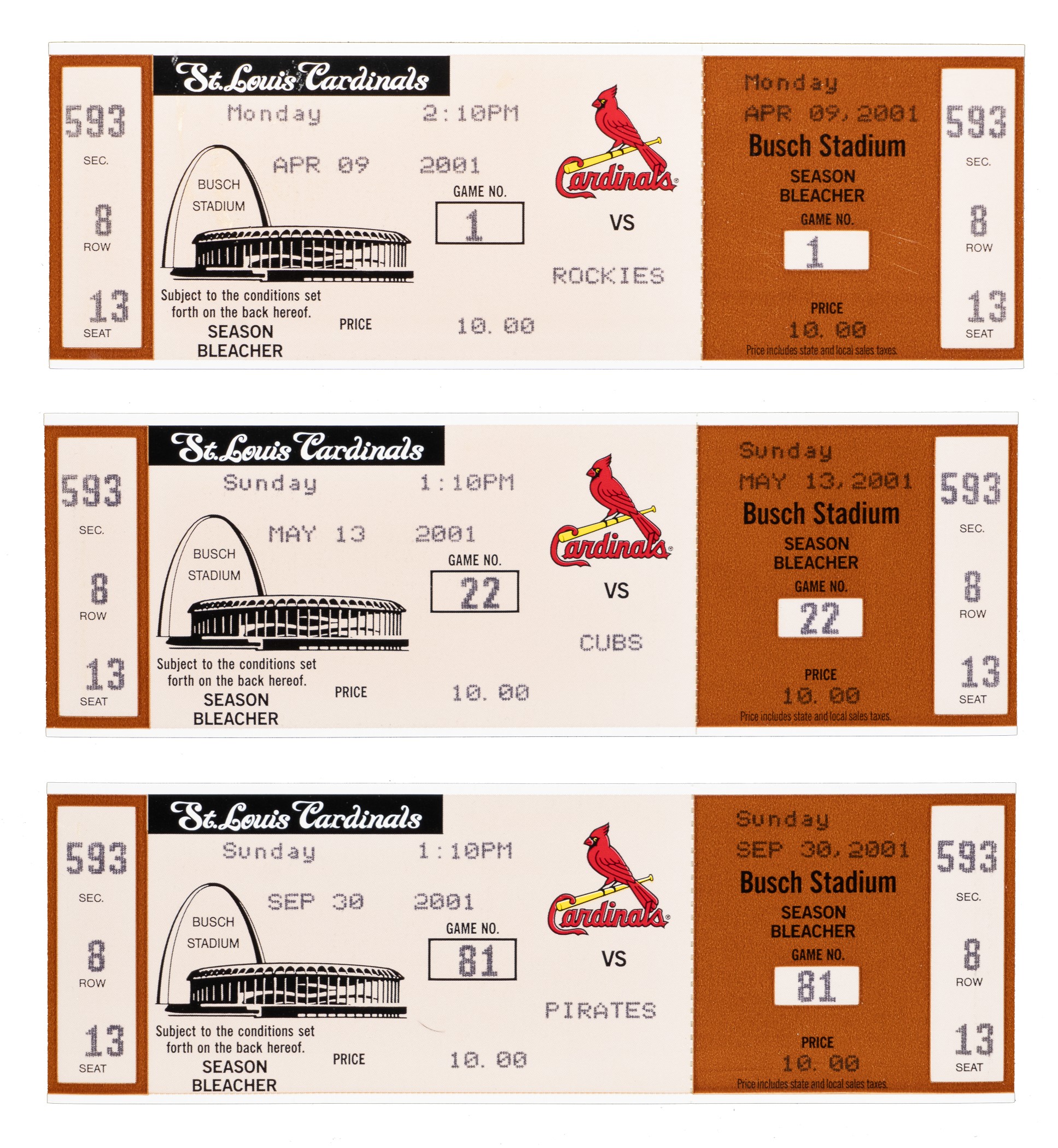 Presented is a collection of 14 full tickets, one ticket from every St. Louis Cardinals home game that Albert Pujols hit a home run in during the 2001 season. During his rookie season in 2001, Pujols blasted 37 home runs on his way to winning Rookie of the Year. Today, Pujols has 679 career home runs, which is good for fifth all time. The condition of the tickets is Excellent to Mint condition. This collection consists of the following: April: 4/9 HR#2, 4/12 HR#3, 4/14 HR#4, 4/25 HR#7, and 4/28 HR#8. May: 5/7 HR#10, 5/10 HR#11, 5/12 HR#12, and 5/13 HR#13. June: 6/26 HR#21. August: 8/4 HR#26, and 8/29 HR#31. September: 9/18 HR#35, and 9/30 HR#37. Total: 14 full tickets. Reserve $200.