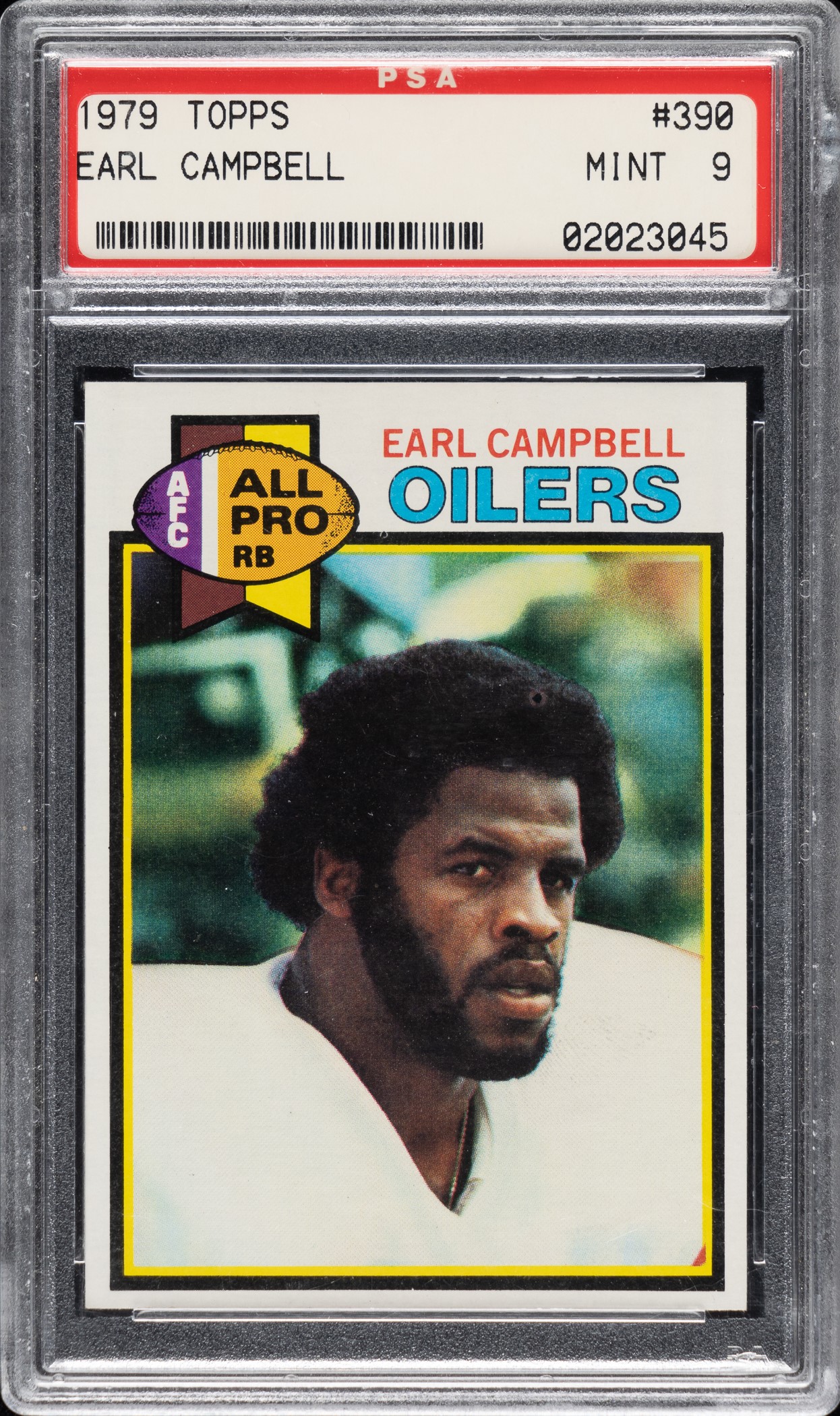 Graded MINT 9 by PSA. Superb example of Hall of Famer Earl Campbell's rookie card from the 1979 Topps football series. Bright, crisp, and clean with four strong corners and centering slightly toward the right. Clean reverse. A very attractive high-grade example worthy of any Earl Campbell or Hall of Fame rookie-card collection. Reserve $100.