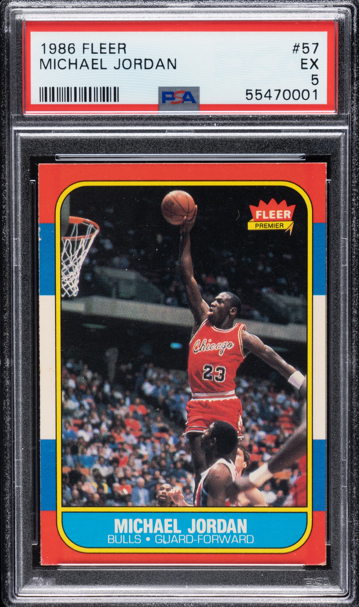 Graded EX 5 by PSA. Very attractive example of Michael Jordan's rookie card from the 1986-1987 Fleer basketball set. This example displays bright colors, a crisp image, and centering slightly toward the bottom right. Boldly printed reverse. Downgraded largely due to a weaker bottom right corner and a couple spots of light discoloration on the reverse. The Fleer Jordan card is one of the cards that is recognizable to collectors of all ages and is one of the great cardboard collectibles in our hobby. This is a very pleasing example of this most sought-after modern basketball-card classic. Reserve $500.