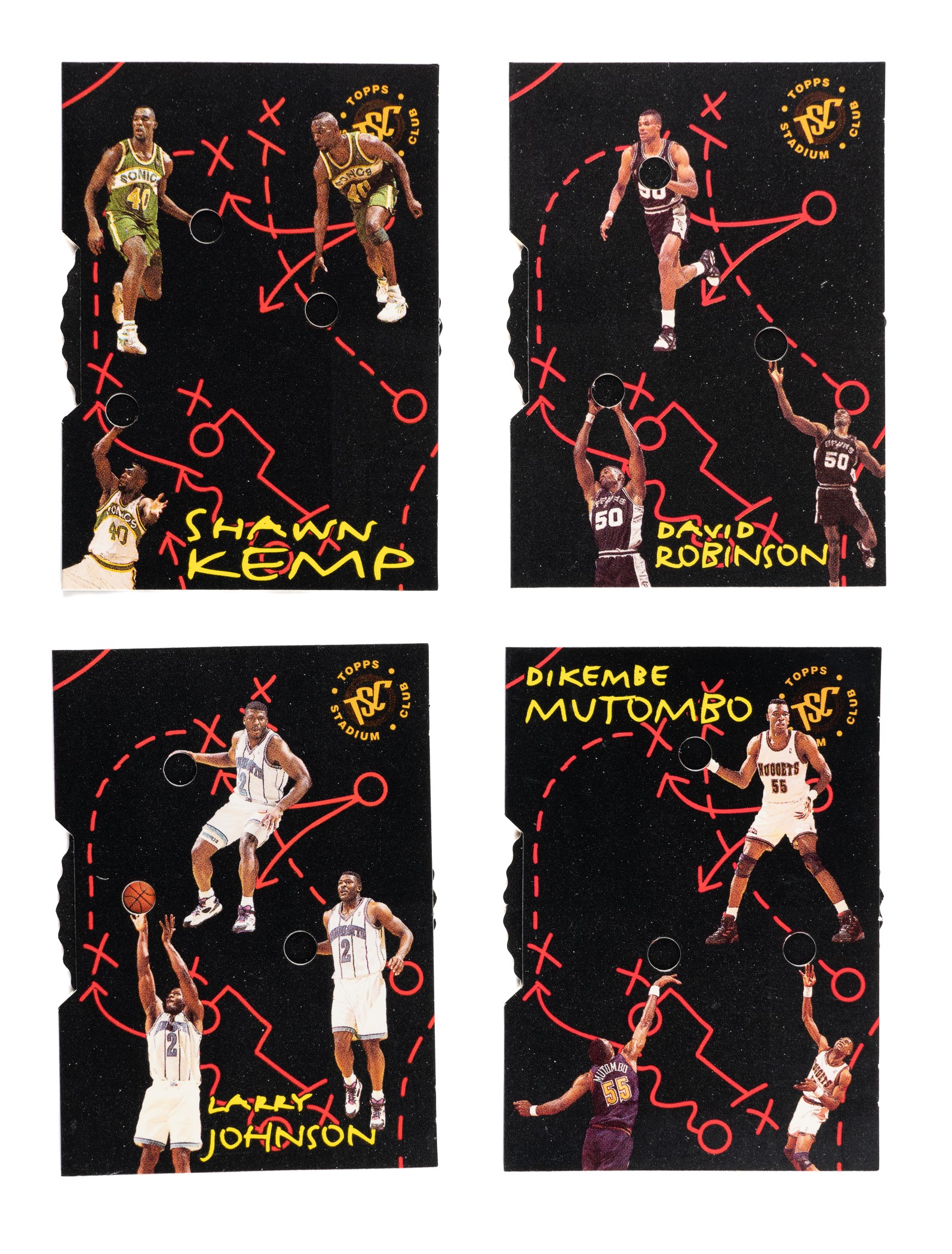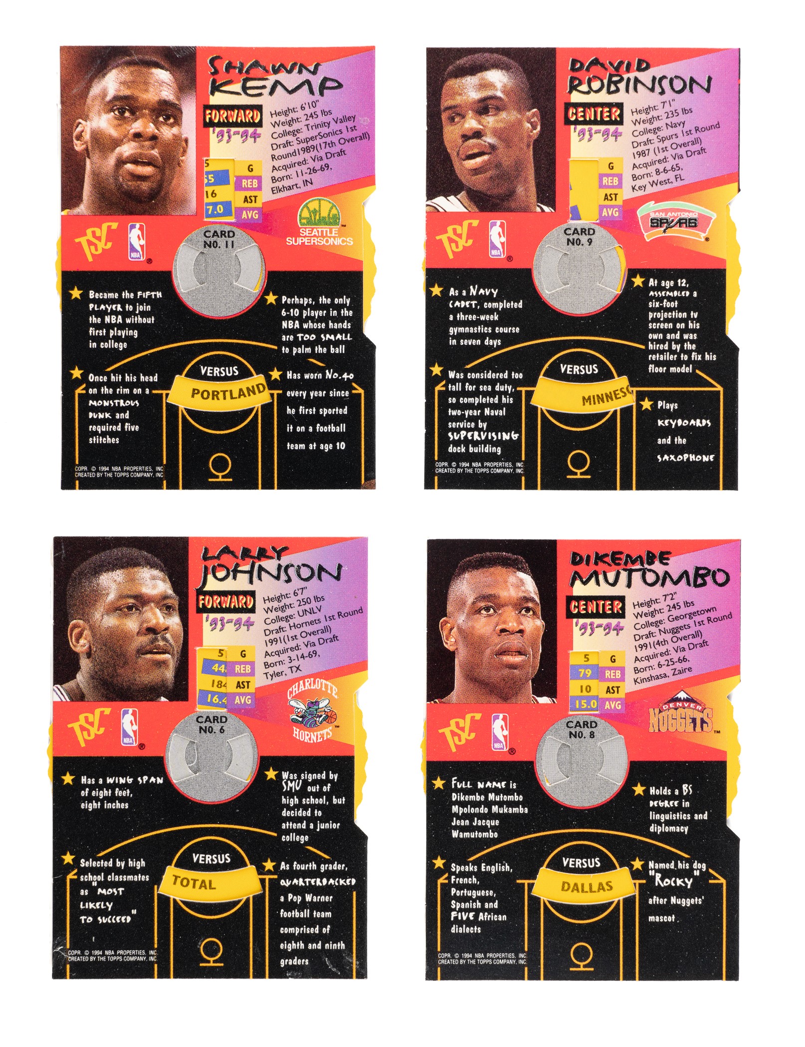 Very attractive 1994-1995 Topps Stadium Club Basketball Stat Wheel Spinners complete test set. The set contains a number of Hall of Famers including Joe Dumars and David Robinson. Condition ranges from Ex to Nr/Mt, averaging Ex-Mt+. This set consists of the following: #1 Anderson, 2 Brown, 3 Starks, 4 Dumars (Nr/Mt, HOF), 5 Kukoc (Ex+, HOF), 6 L. Johnson, 7 Horry, 8 Mutombo (Ex-Mt, HOF), 9 D. Robinson (Nr/Mt, HOF), 10 K. Johnson, 11 Kemp, and 12 C. Robinson. Total: 12 cards. Reserve $100.