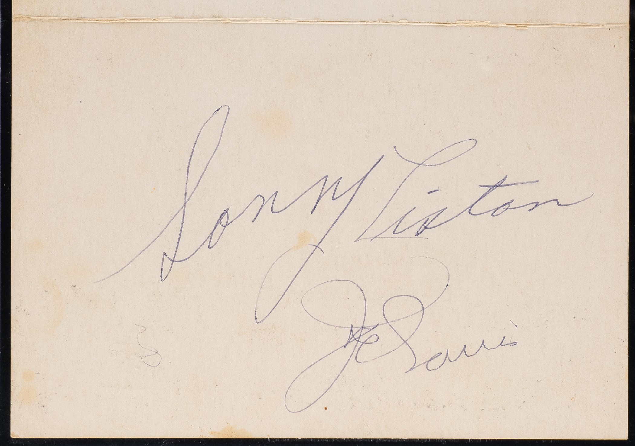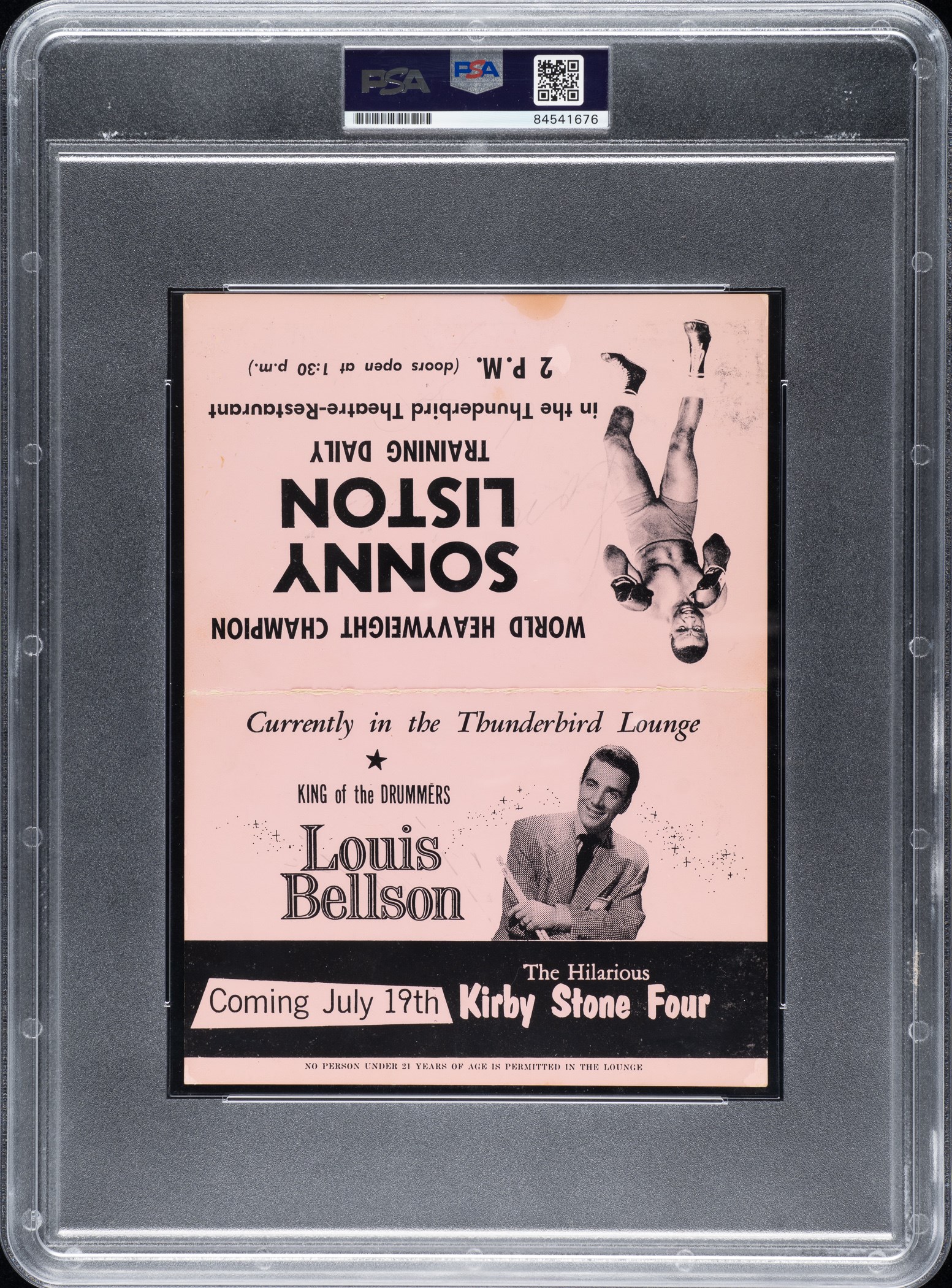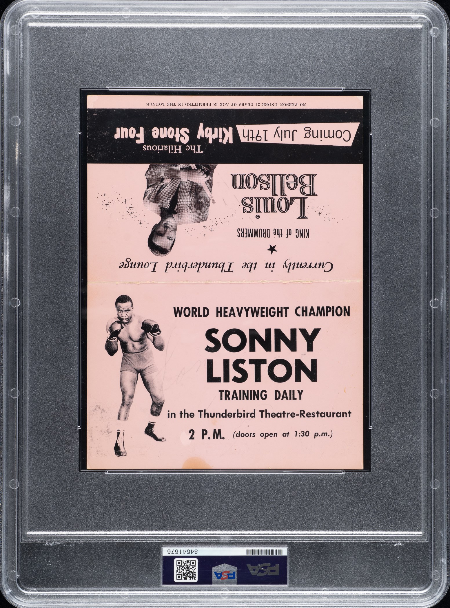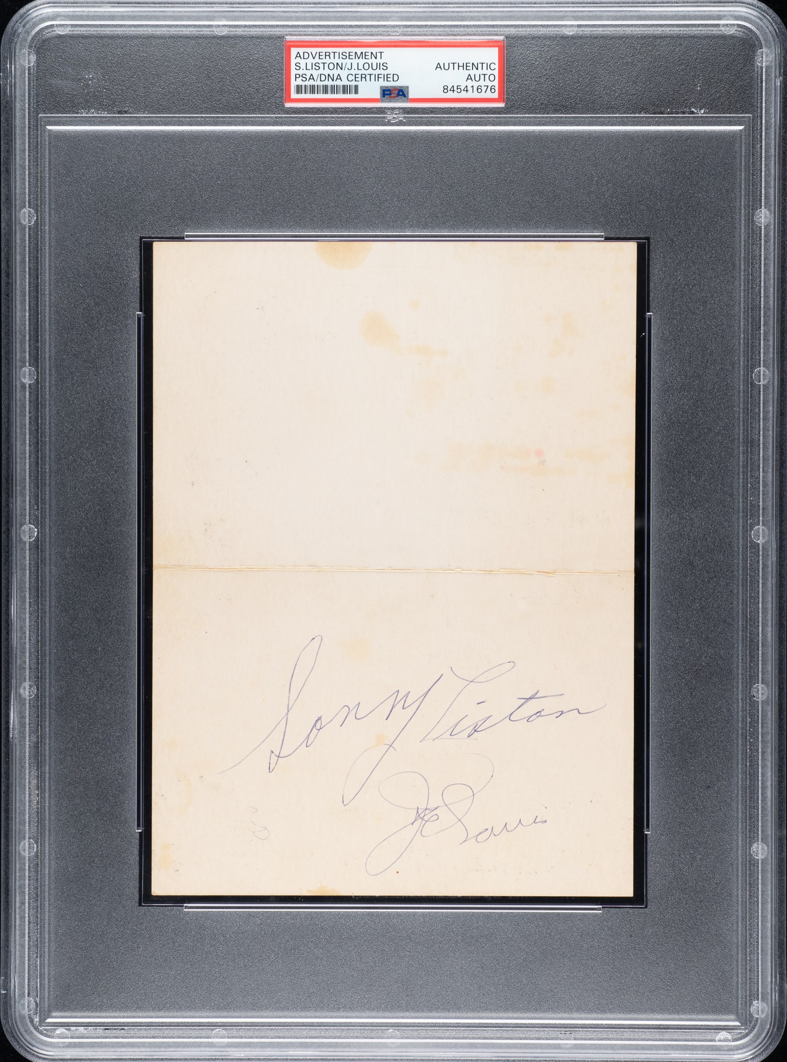 Presented is a Thunderbird Theatre promotional card signed by Hall of Fame boxers Sonny Liston and Joe Louis. PSA/DNA has encapsulated the card and certified the signatures as "Authentic." The two legendary heavyweight champions have both signed the interior of the fold-over card (6 x 8 inches unfolded) in blue ink. The signature of Liston is the scarcer of the two. He died in 1970 at the approximate age of 40 (his birth date was unknown). As a result, his signature is rare today. One side of the card features an image of Liston in a boxing stance and advertises "World Heavyweight Champion/Sonny Liston/Training Daily/in the Thunderbird Theatre-Restaurant/2 P.M. (doors open at 1:30 p.m.)." The opposite side advertises "King of the Drummers/Louis Bellson." The card displays light toning on front and back but otherwise is in Very Good to Excellent condition. Reserve $500.