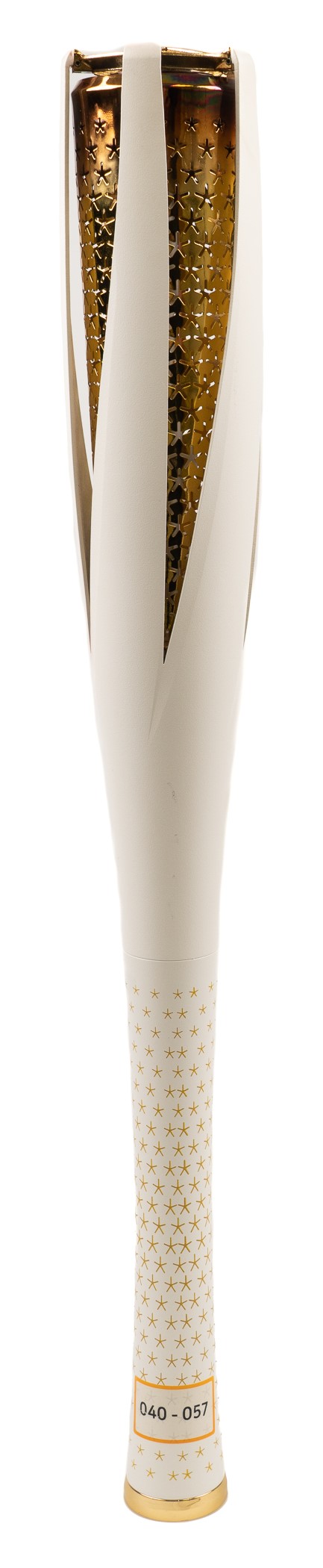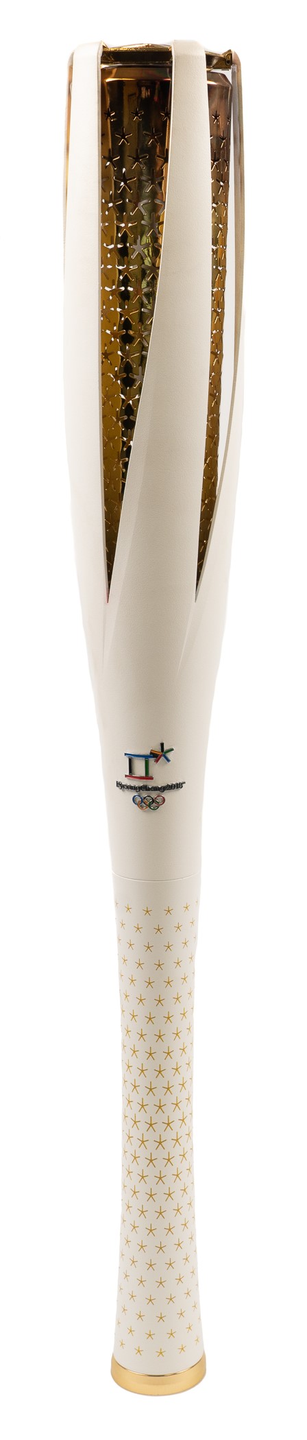 Superb original relay torch used in advance of the 2018 PyeongChang Olympic Winter Games, the first Olympic Games in South Korea since 1988. This impressive piece was meticulously designed with a number of symbolic and purposeful features in mind, including its length of 700 mm (approximately 27 5/8") to represent PyeongChang's 700 m above sea level along with openings and contours in the torch itself to combat wind and rain encountered by the ceremonial torchbearers along the route from Greece to South Korea. According to the official Olympics historical resource, approximately 7,500 individuals participated in the relay, which makes this modern torch an accessible one for collectors but in no way detracts from its luster and significance. The white-and-gold torch is constructed from sturdy plated aluminum and features a small, colorful emblem of the host city on the face of the torch. The piece remains in outstanding condition, presenting as Near Mint overall, with only a small sticker, likely tied to the relay itself, affixed to the reverse. This is a superb commemorative relic from this important sporting event and symbol of international unity and competition. The size/weight of this item requires that there will be an additional shipping charge for this lot. Reserve $1,000.