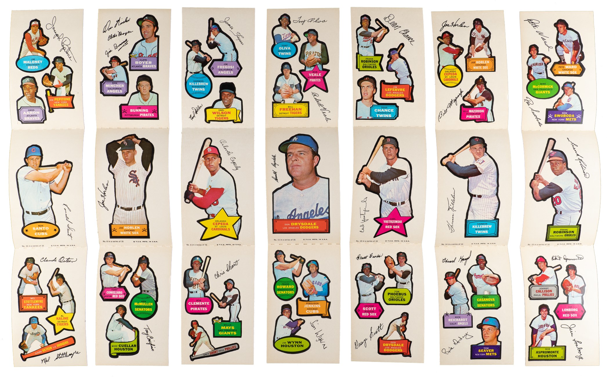 In 1968, Topps issued the "Action All-Star" test sticker set. The sixteen numbered vertical sticker panels in the set are each composed of three 3.25 x 5.25-inch panels, perforated at the joints for separation. Each three-panel strip features a large image of a star player in the center panel, with smaller pictures of three players on the top and bottom panels. Offered is a complete set of sixteen three-panel strips of 1968 "Action All-Star" test stickers, completely intact. Condition is one Nr/Mt-Mt, four Nr/Mt, one Ex-Mt, five Ex, and five Vg-Ex. Keys: #5 Mays (Nr/Mt-Mt), 7 Mantle (Vg-Ex), 10 Aaron (Vg-Ex), and 12 Clemente (Ex). The panels display strong corners throughout, with a few slightly off-center, tiny wrinkles responsible for many downgrades, and center panels generally stronger than outside panels. This is one of the scarcest, as well as most unusual, of all Topps test issues. Total: 16 three-panel strips. Reserve $1,000.