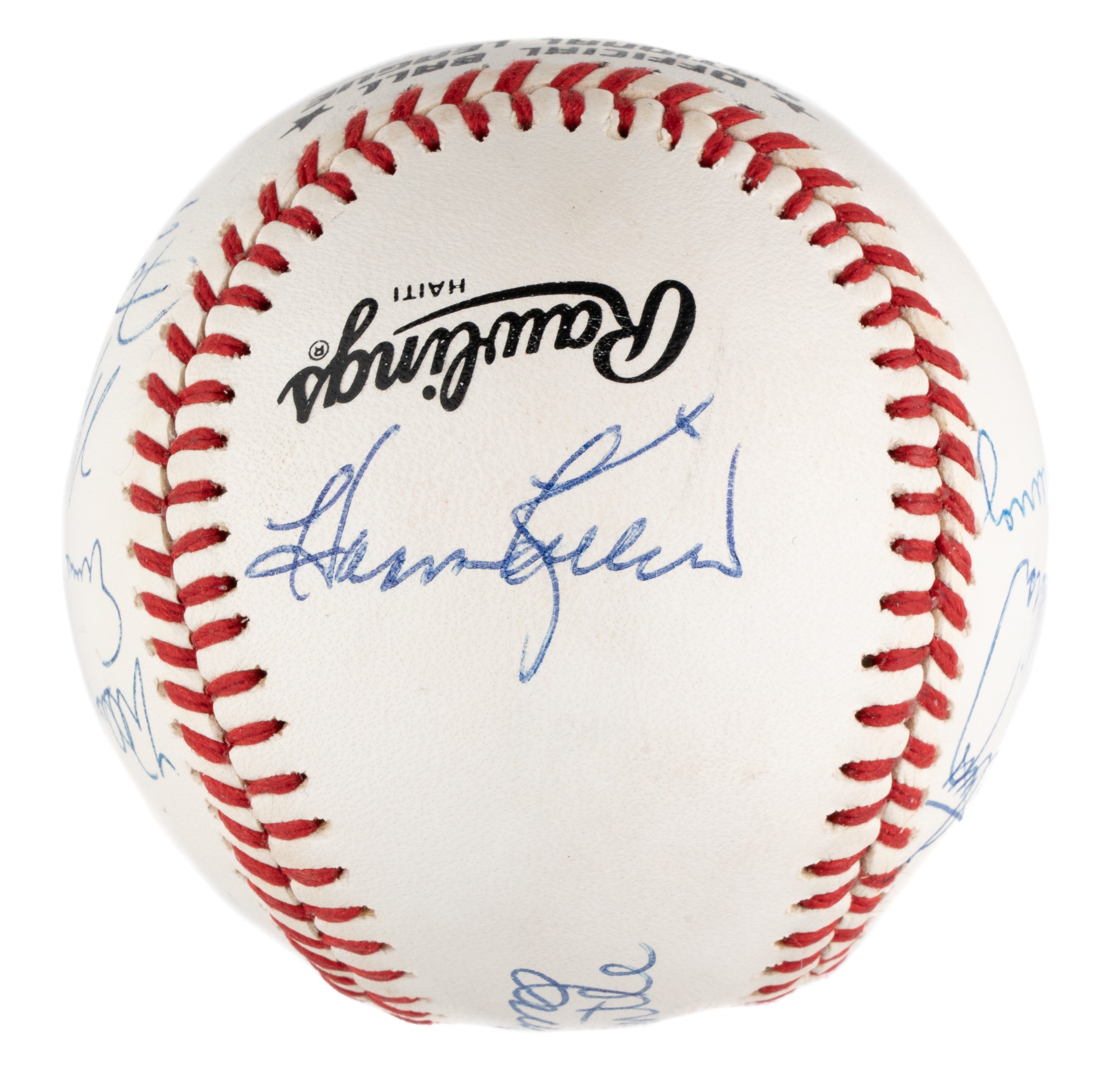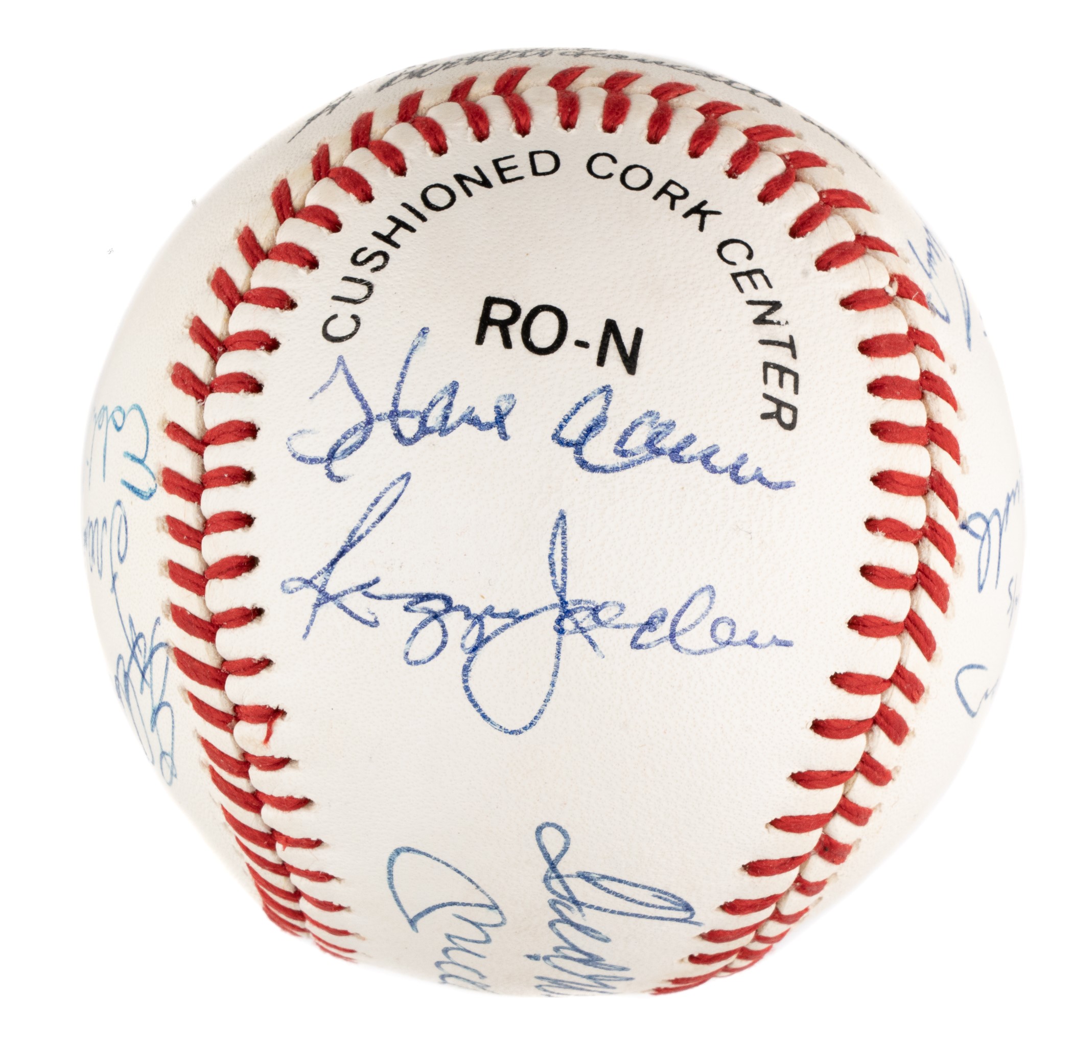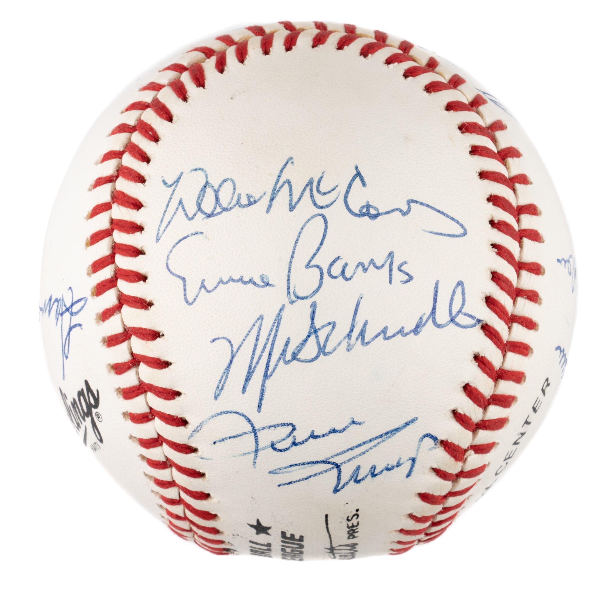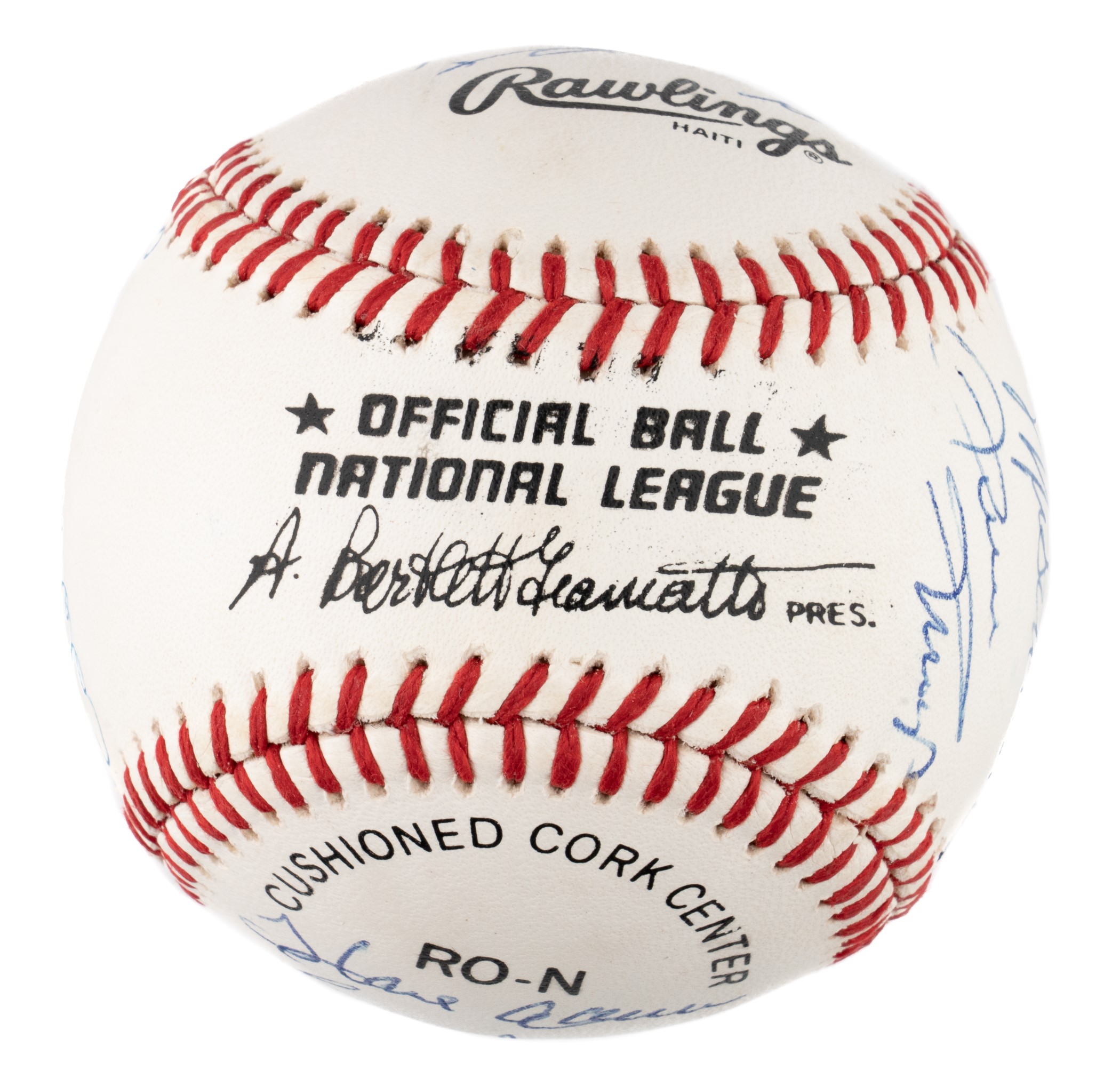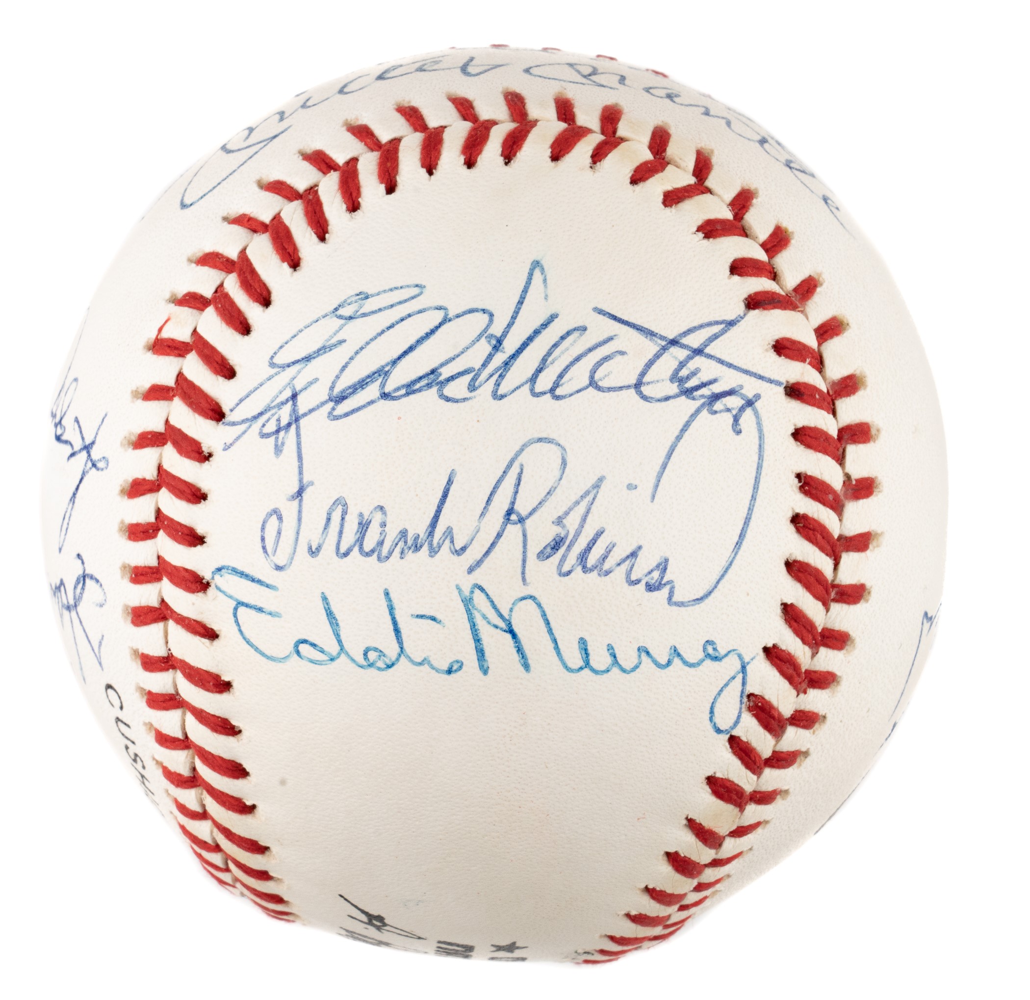 Official National League baseball (Giamatti) signed by the twelve members of the elite 500 Home Run Club: Mantle (sweet spot), T. Williams (sweet spot), Aaron, Mays, Robinson, Murray, McCovey, R. Jackson, Mathews, Banks, Killebrew, and Schmidt. All the signatures have been scripted in blue ink. The ball is in Near Mint condition. An outstanding 500 Home Run Club ball with plenty of room for additional signatures. Auction LOA from James Spence/JSA. Reserve $300.