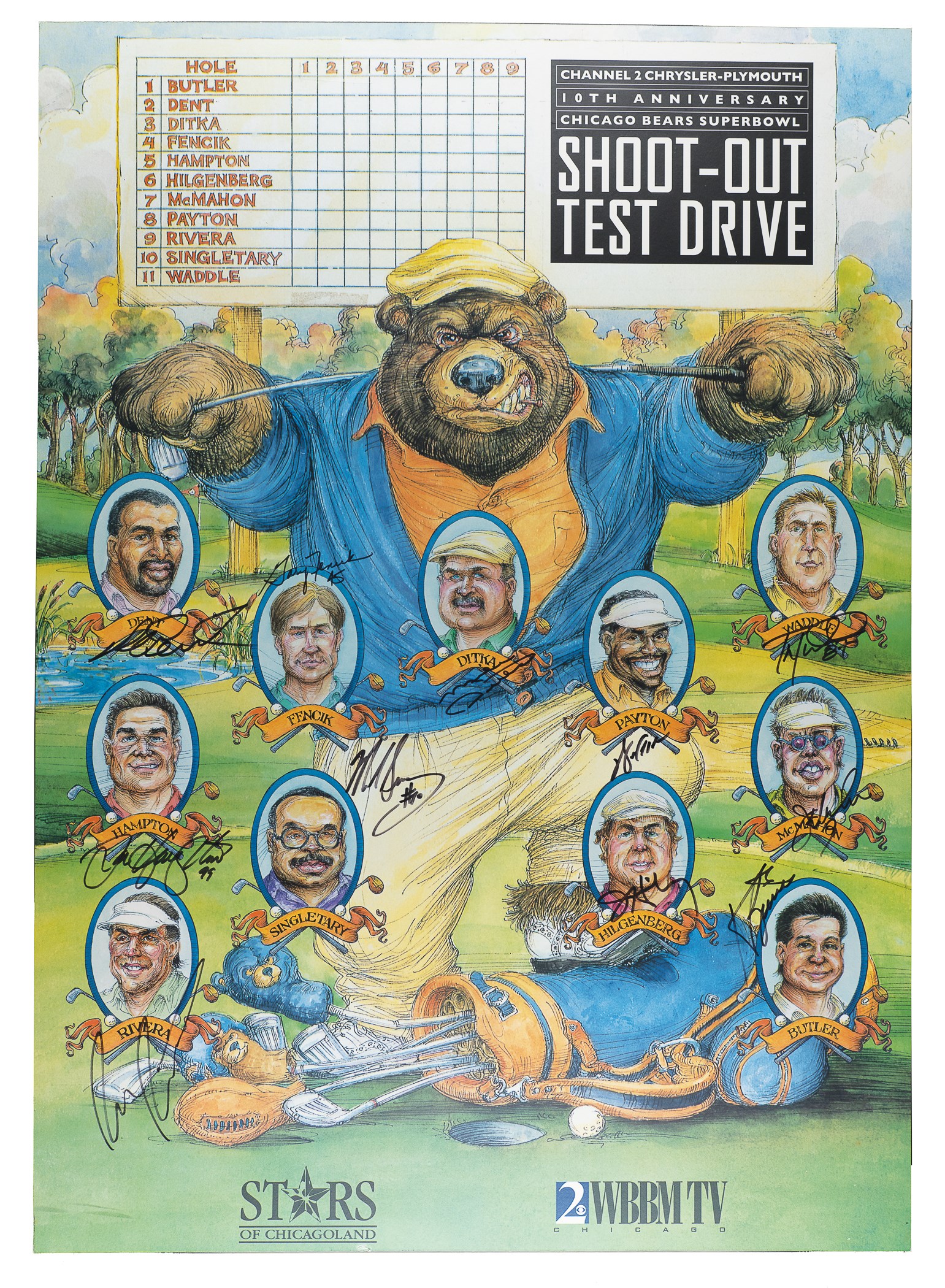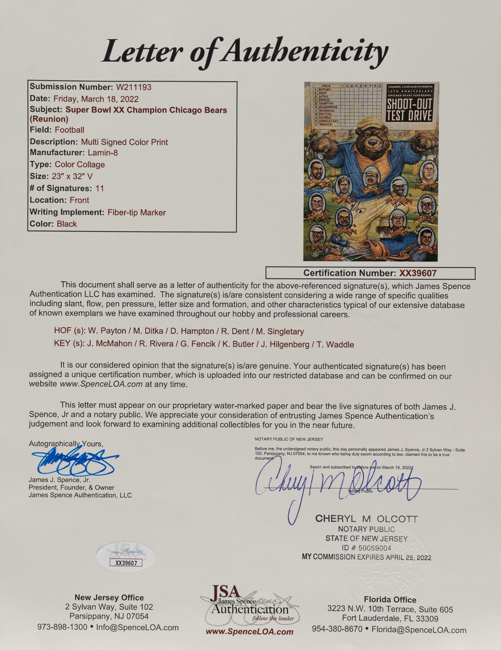 Presented is a 1986 Super Bowl Champion Chicago Bears reunion team-signed print. Eleven players have signed the print in black Sharpie next to their respective image. The print features the signatures of Dent, Ditka, Hampton, Payton, Singletary, Butler, Fencik, Hilgenberg, McMahon, Rivera, and Waddle. The print measures 23 x 32 inches and is in Excellent condition. Full LOA from James Spence/JSA. The size/weight of this item requires that there will be an additional shipping charge for this lot. Reserve $300.