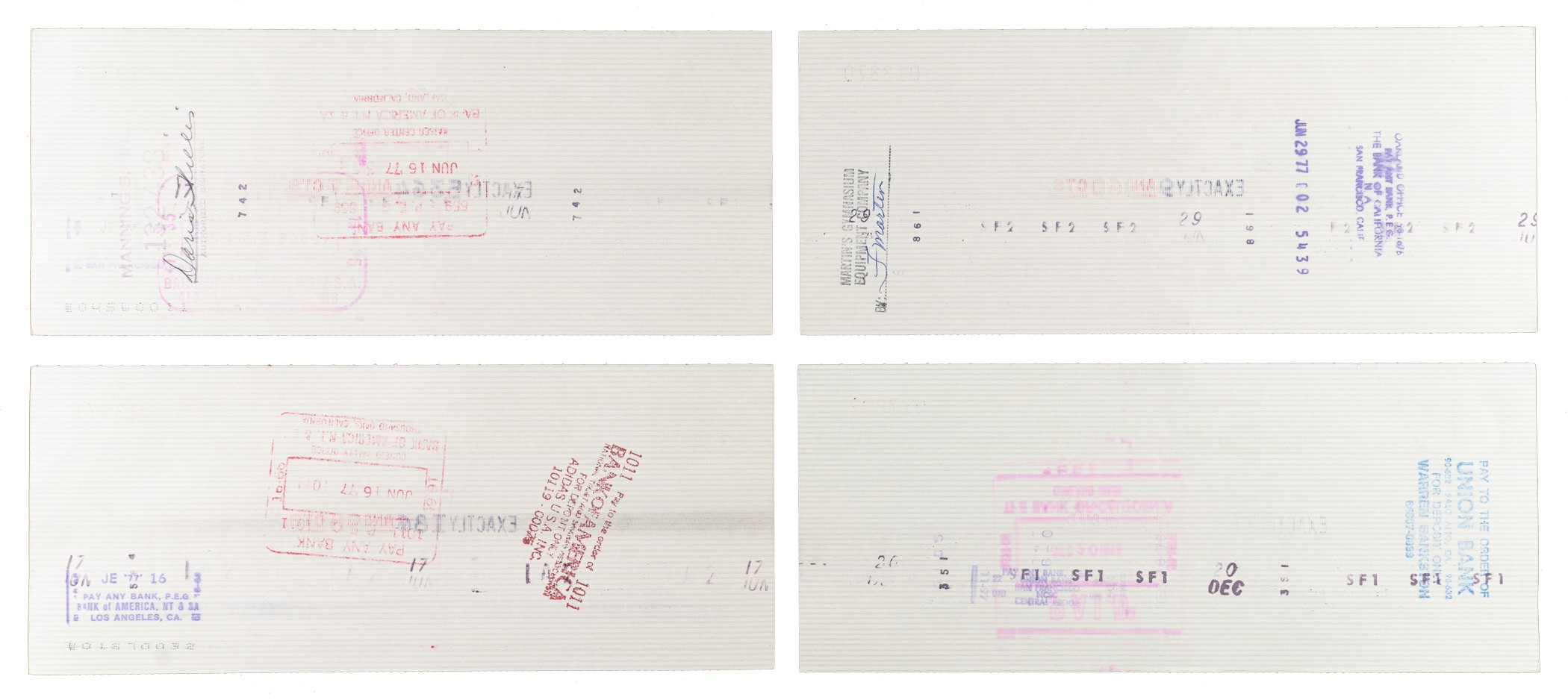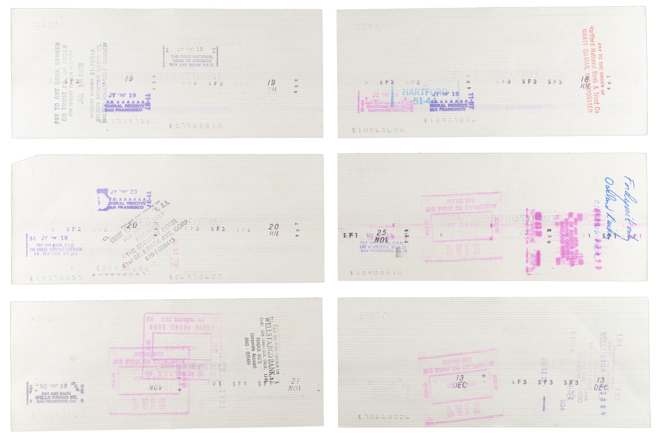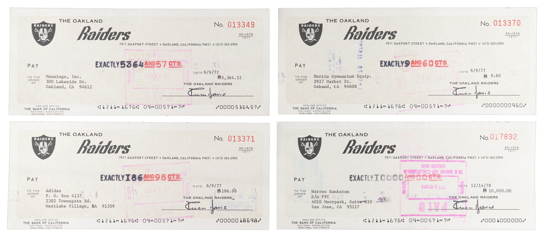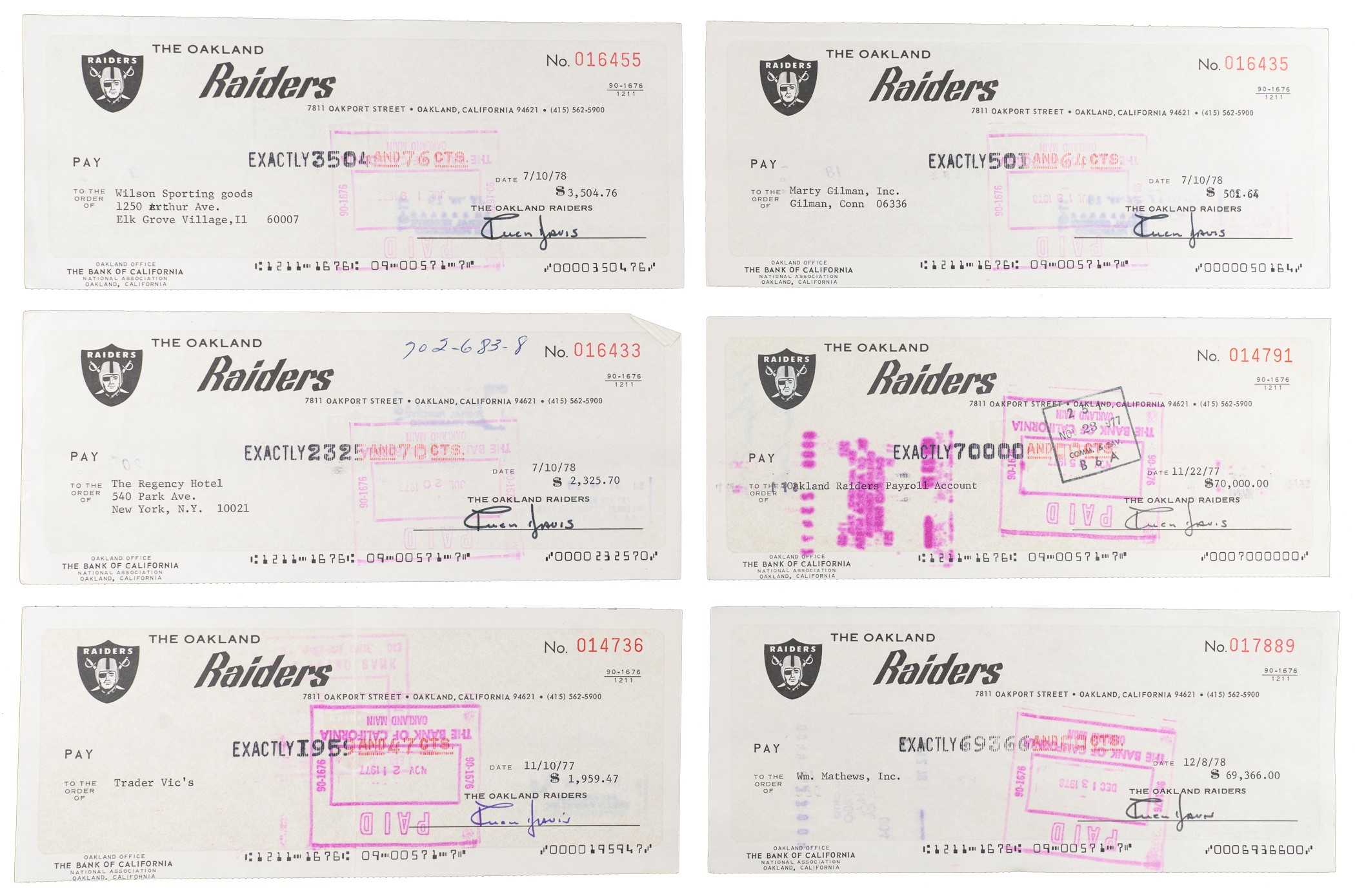 Collection of ten Oakland Raiders business checks dating from 1977 (5) and 1978 (5), each flawlessly signed in black ink by Hall of Fame team owner "Allen Davis." Al Davis' signature is scarce. He was not very accommodating to autograph collectors, and most of the Davis signatures in the hobby today are business-related items such as these. These are not only outstanding examples but also desirable because he has signed with his full name, "Allen," as opposed to "Al." Each check (8.5 x 3.5 inches) has normal bank cancellation stamps. One has a corner bend, otherwise they are all in Excellent condition. Total: 10 checks. Auction LOA from James Spence/JSA. Reserve $300.