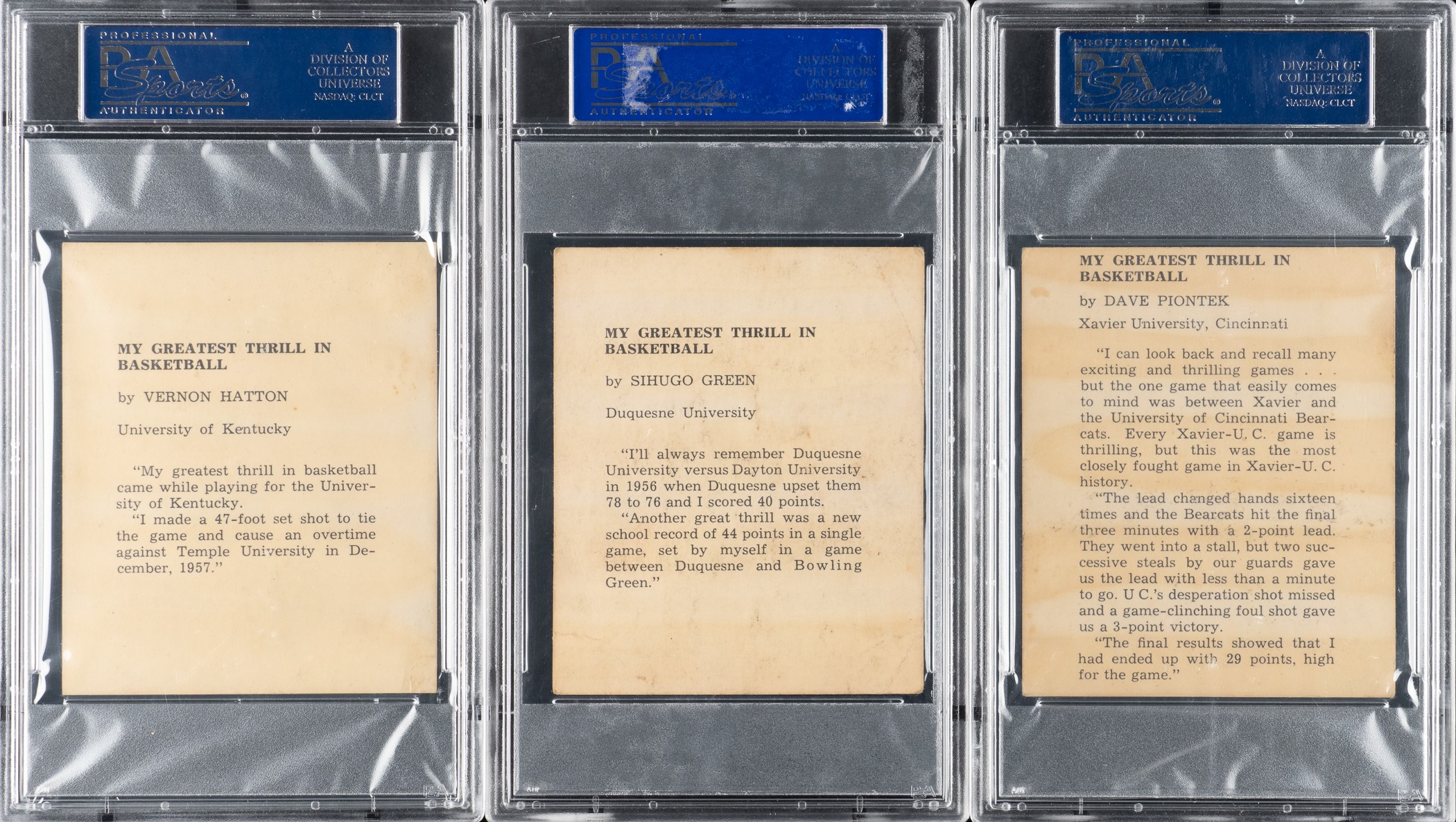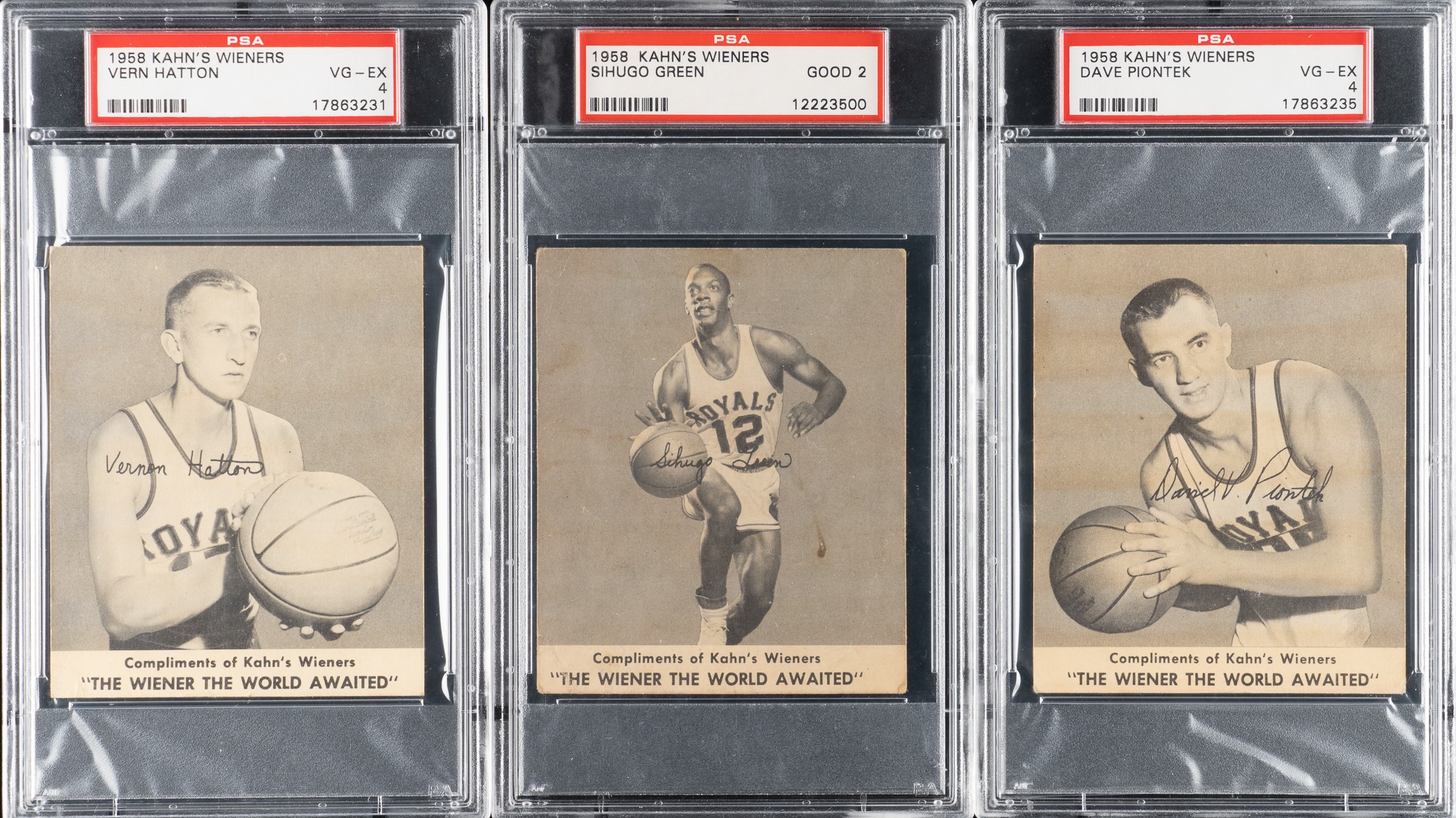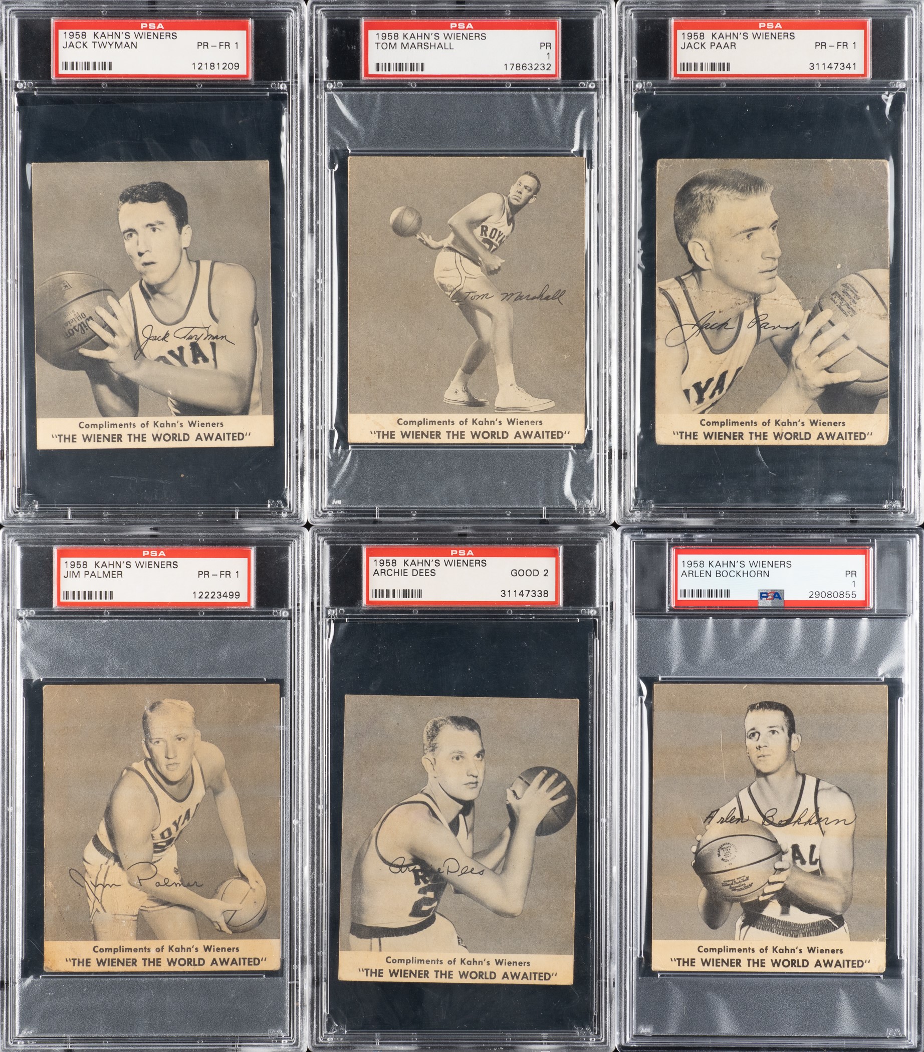 Rarely offered complete nine-card set of 1958-1959 Kahn’s Wieners basketball cards, highlighted by Hall of Famer Jack Twyman. The very scarce 1958-1959 Kahn's Weiners basketball set features nine members of the Cincinnati Royals. This is the first complete set we have offered in the past twenty years! Each card has been graded and encapsulated by PSA. PSA Grading Composite: VG-EX 4 (2 cards): Hatton and Pointek. GOOD 2 (2 cards): Dees and Green. POOR 1 (5 cards): Bockhorn, Marshall, Paar, Palmer, and Twyman. One card was issued with each package of Kahn's meats. Because of the product with which they were packaged, heavy grease stains and creases are common with this issue, making it all the more difficult to assemble a high-grade set. This is a very attractive mid-grade complete set of this popular and attractive issue. Kahn's Wieners cards are far rarer than most 1950s basketball cards and are one of the few food issues of the era. Total: 9 cards. Reserve $300.