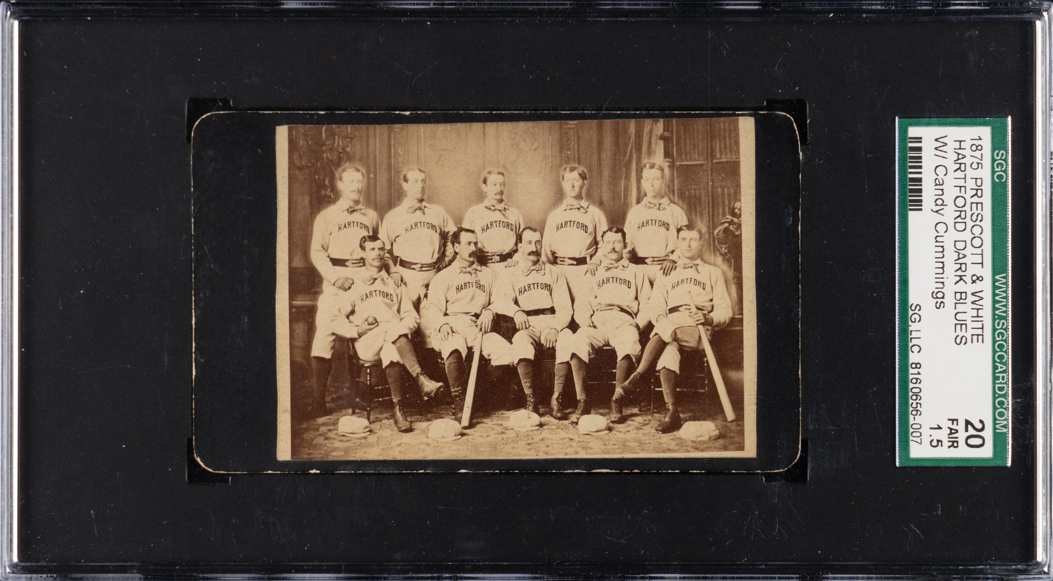 Rare and historically significant CDV of the 1875 Hartford Blues, including Hall of Fame pitcher Candy Cummings. The formal studio photo pictures ten members of the club posing together in uniform, including Cummings (standing in the center) and player/manager Bob "Death to Flying Things" Ferguson (seated in the center). It is interesting to note that the team is pictured in front of an unusually elaborate studio background on the offered example. The photographer's name and city, "Prescott & White - Hartford," is printed on the reverse. Candy Cummings, in addition to being one of the top pitchers of the National Association (baseball's first professional league), and a member of baseball's Hall of Fame, is best known today as the inventor of the curveball. Surprisingly, despite his widespread fame, photos of Cummings are practically nonexistent. This CDV is one of the very few known images of Cummings dating to his playing career. The 1875 Hartford Blues team CDV is well known but exceedingly rare. This is just the fourth example we have ever offered, and we cannot recall having seen more than a few others over the years. Cummings enjoyed the finest season of his career in 1875. As the workhorse of the staff, Cummings finished the year with a 35-12 record, a 1.60 ERA, and league-leading totals for both shutouts (7) and strikeouts (82). Cummings' career included time in both the American Association and National League, and he also briefly served as the first president of the newly formed International Association (minor league) in 1876. The photo exhibits outstanding clarity and detail. The mount (4-1/8 x 2-7/16 inches) displays minor edge and corner wear. A light surface crease is visible on back. Graded FAIR 20 by SGC due to writing and a small spot of paper loss, both on the reverse. This is a stellar representation of this great rarity! Reserve $5,000.