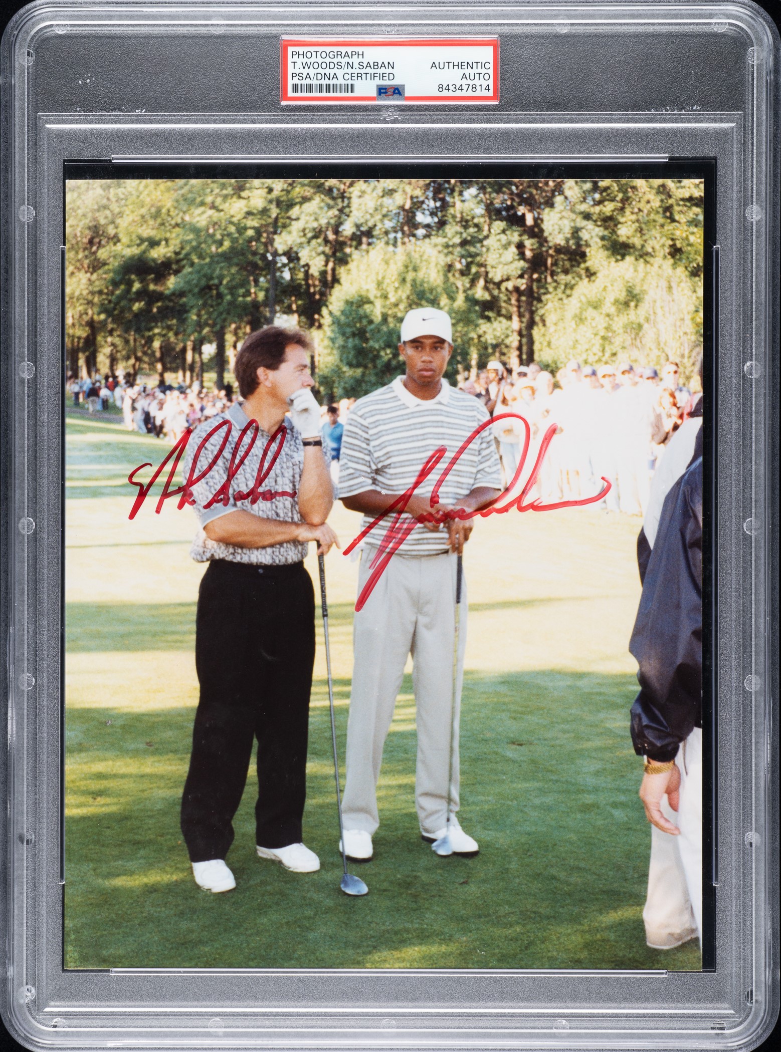 Photograph of Tiger Woods and Nick Saban, signed by both men across their respective images in red Sharpie. Encapsulated by PSA/DNA as "Authentic." The photograph captures the two in conversation on the golf course, likely at a charity event. The photograph (8 x 10 inches) displays a small unobtrusive surface flaw and light corner wear; Excellent condition. Reserve $300.