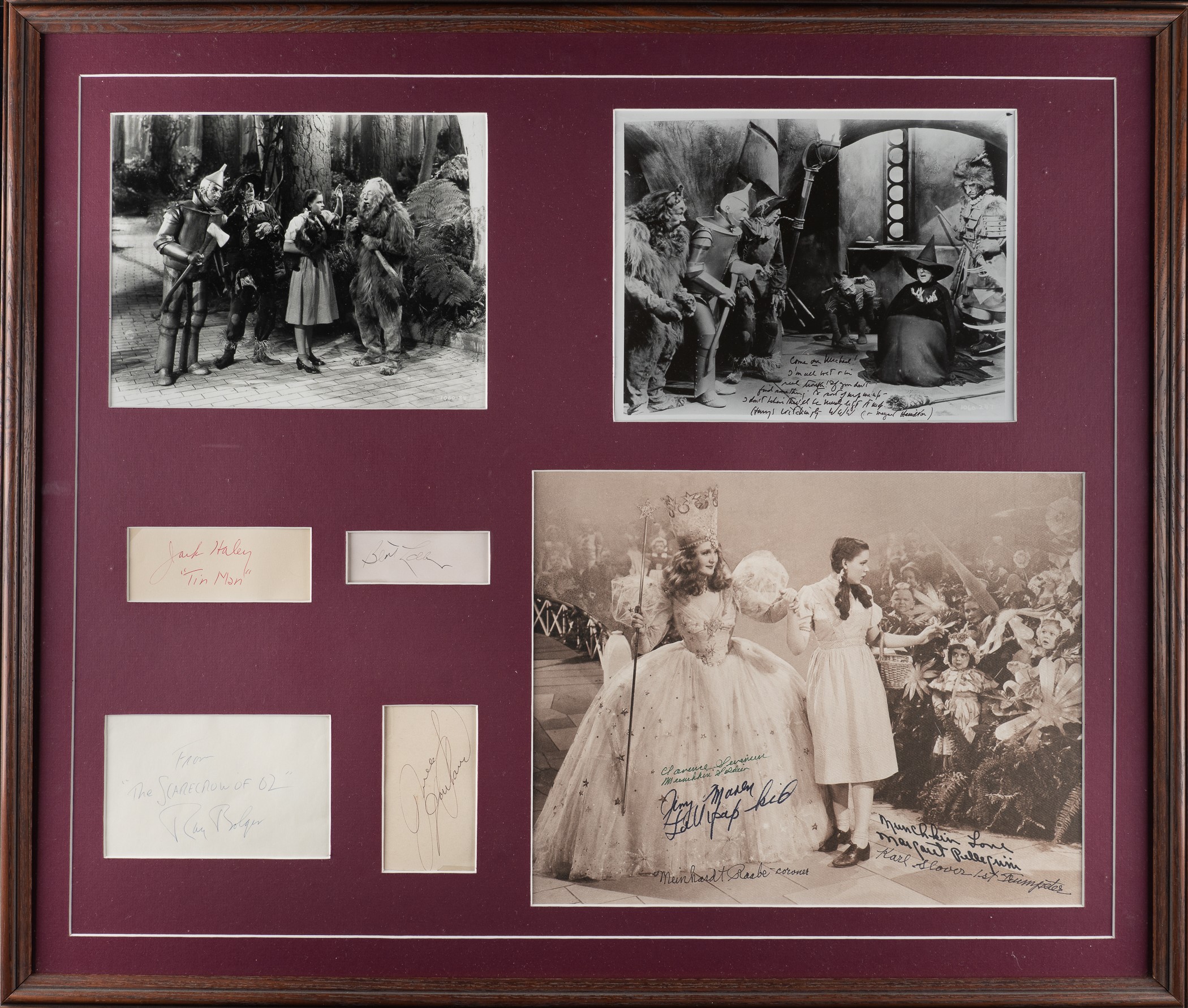 Framed display featuring four unlined pages signed, respectively, by the actors who played Dorothy (Judy Garland), the Scarecrow (Ray Bolger), the Tin Man (Jack Haley), and the Cowardly Lion (Bert Lahr) in the classic 1939 film The Wizard of Oz. Also included are three modern prints, of which two are signed. One is signed and inscribed by Margaret Hamilton (Wicked Witch of the West), and the other is signed and inscribed by five cast members: Clarence Swanson (Munchkin Soldier), Jerry Maren (Lollipop Kid), Meinhardt Raabe (Coroner), Margaret Pellegrini (Munchkin), and Karl Slover (1st Trumpeter). All seven items are matted and framed together to the total dimensions of 29.75 x 25.25 inches. Auction LOA from James Spence/JSA. The size/weight of this item requires that there will be an additional shipping charge for this lot. Reserve $300.