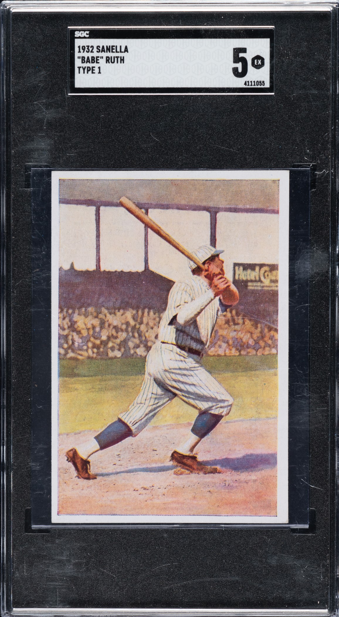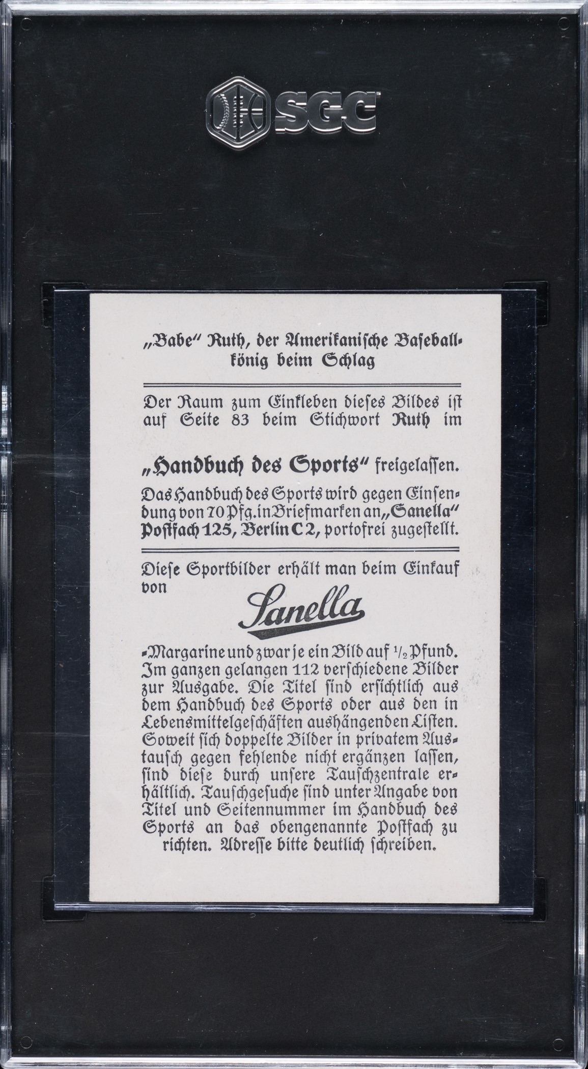 Graded EX 5 by SGC. Outstanding mid-grade example of Babe Ruth (Type 1) from the 1932 Sanella Margarine series. Issued in Germany, this beautiful full-color issue of 112 different subjects measures 2-3/4 x 4-1/8 inches and includes all types of athletes (boxing, football, tennis, wrestling, track, etc.). The text on the reverse is printed in German. The card features a full-color image of Ruth hitting a homer. There are three different back-printing variations of the set. The offered example is the “Type 1” variation, which has a Sanella advertisement located toward the center. This card has brilliant colors, a crisp image, and light corner wear (slightly weaker bottom right). Boldly printed reverse. For the Ruth collector not interested in paying a king's ransom for his cards from the popular 1933 Goudey series but who still wants original 1930-era vintage cards of Babe Ruth, the 1932 Sanella Margerine series presents an exceptional opportunity. Opening Bid $200.