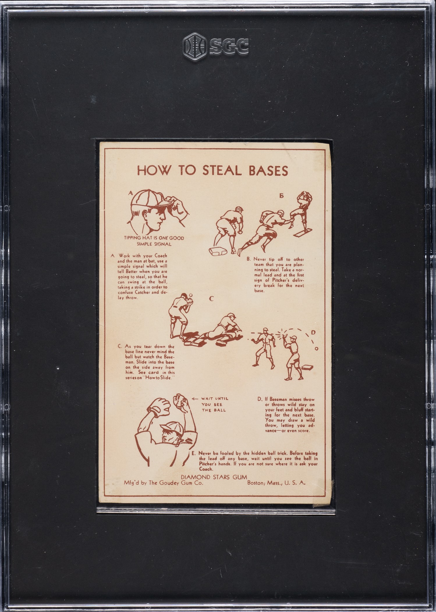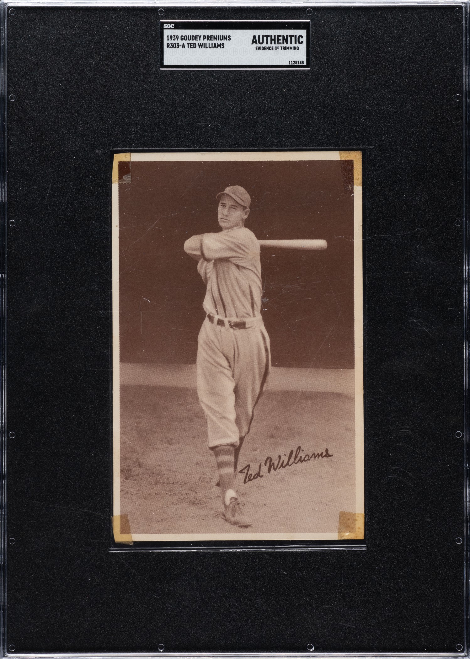 Incredibly rare Goudey Premium dating from Ted Williams' first full season with the Red Sox, in 1939. This is an extremely significant card as it is, with good reason, recognized as one of Williams' true rookie cards. This is also the key card from the R303-A Goudey Premiums series. The set has always been the rarest of the three R303 sets. Because these premium cards are printed on thin stock, they are very susceptible to minor faults, especially creases. Bright and crisp with an outstanding image! The card has even corner wear and light creases. Encapsulated as Authentic by SGC due to clear tape affixed to each corner. The card features playing tips on the reverse. Considering how substantial they are, R303-A premiums have received very little attention from collectors, in part due to the fact that they are larger than standard cards and therefore have only recently begun to be encapsulated by grading services. A case could be made that they represent one of the best values among all 1930s issues. This is an extremely important and overlooked card. Opening Bid $500.