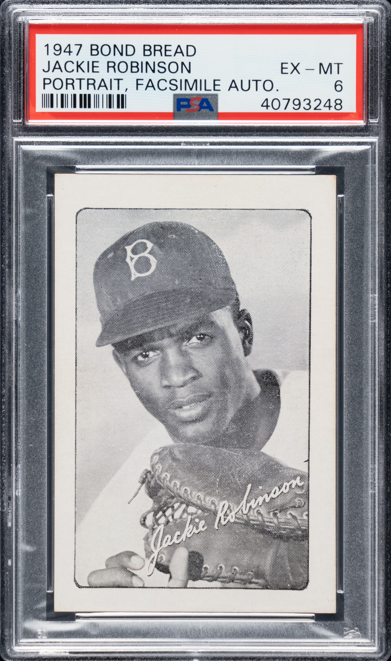 Graded EX-MT 6 by PSA. Striking example of one of the truly great Jackie Robinson cards and one that in our opinion is a classic. Dating from 1947, this card represents Robinson's true rookie card. This card has a unique design in the thirteen-card 1947 Jackie Robinson Bond Bread set. It is the only one in the set that has a biography along with advertising on the reverse. In the 1970s, a legendary find of about seventy-five high-grade examples of this card "walked in" at a New York convention. The gentleman in possession of the cards received them as a youngster directly from a Bond Bread delivery-truck driver in 1947. All cards from the find were just the one special biography card, and despite pleas from the youngster for the additional cards in the set, the driver was never able to fulfill his requests. Because of this find long ago and accompanying story, we have always thought that this uniquely designed card in the set might have been produced to be given out at stores directly by grocers at the checkout counter as a special advertising vehicle when the set was announced, as opposed to being issued one card per loaf (as was the case with the other twelve cards in the set, each of which has advertising-only reverses). Research presented on Net54baseball.com conclusively proves the set was actually issued over a period of several years (1947-1950), with the portrait card among the first issued in 1947. Here's the link: http://www.net54baseball.com/showthread.php?t=171169. The card has superb clarity and light corner wear. Clean, boldly printed reverse. This is an extremely historic card, Jackie Robinson's true rookie card, dating from his earliest days in the Major Leagues. Opening Bid $10,000.