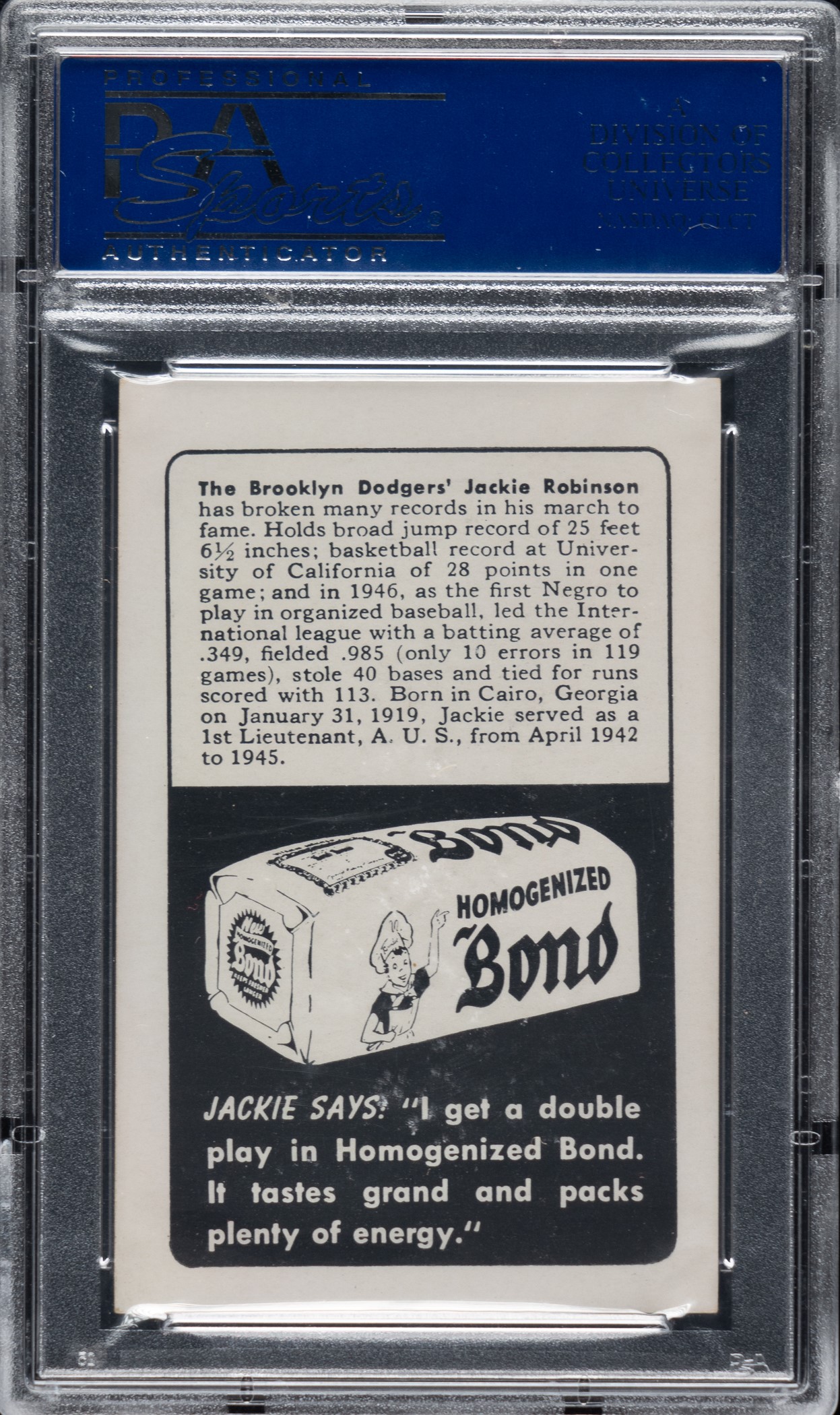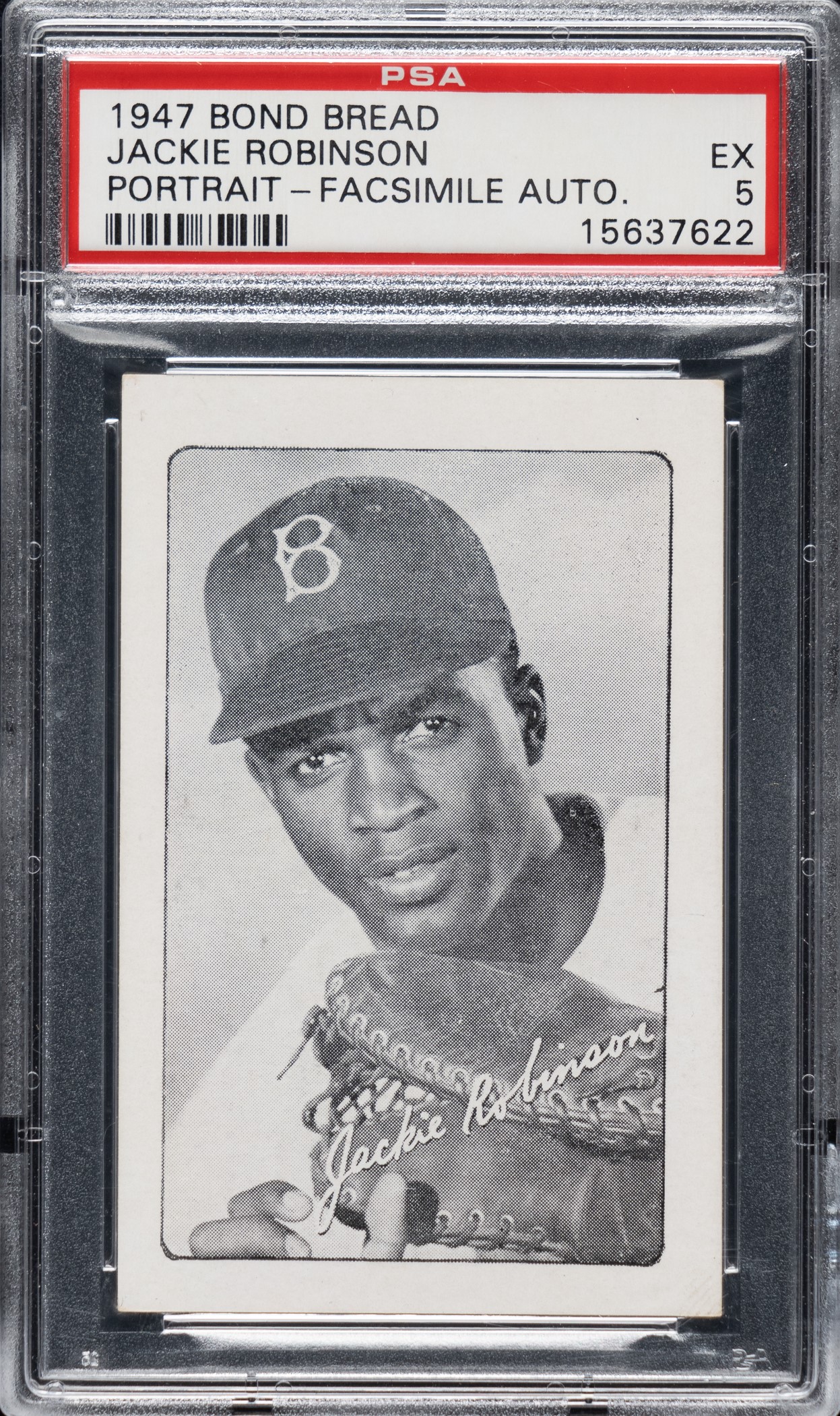 Graded EX 5 by PSA. Superb mid-grade example of one of the truly great Jackie Robinson cards. Dating from 1947, this card represents Robinson's true rookie card. This card has a unique design in the thirteen-card 1947 Jackie Robinson Bond Bread set. It is the only one in the set that has a biography along with advertising on the reverse. In the 1970s, a legendary find of about seventy-five high-grade examples of this card "walked in" at a New York convention. The gentleman in possession of the cards received them as a youngster directly from a Bond Bread delivery-truck driver in 1947. All cards from the find were just the one special biography card, and despite pleas from the youngster for the additional cards in the set, the driver was never able to fulfill his requests. Because of this find long ago and accompanying story, we have always thought that this uniquely designed card in the set might have been produced to be given out at stores directly by grocers at the checkout counter as a special advertising vehicle when the set was announced, as opposed to being issued one card per loaf (as was the case with the other twelve cards in the set, each of which has advertising-only reverses). Research by two card scholars and presented on Net54baseball.com conclusively proves the set was actually issued over a period of several years (1947-1950), with the portrait card among the first issued in 1947. Here's the link: http://www.net54baseball.com/showthread.php?t=171169. The offered card has superb image clarity, bright white borders, and light corner wear. Clean, boldly printed reverse. This is an extremely historic card, Jackie Robinson's true rookie card, dating from his earliest days in the Major Leagues. Opening Bid $5,000.