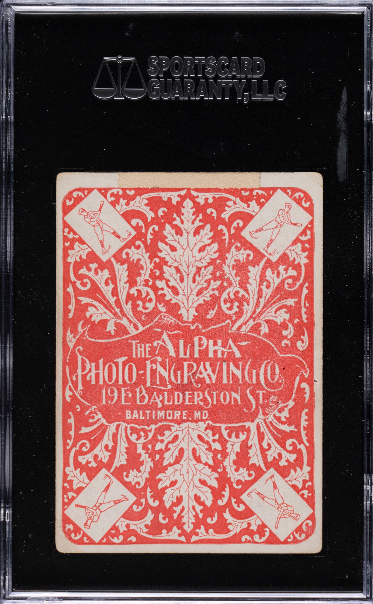 Graded GOOD 30 by SGC. Offered is a type card of Sadie McMahon from one of the rarest nineteenth-century baseball-cards sets: the legendary 1894 Alpha Photo-Engraving. We believe this is the only example in existence of the only card of Baltimore pitcher Sadie McMahon ever issued. McMahon joined Baltimore in 1890 and played a total of seven seasons with the club between 1890 and 1896. His career happened to be during a time in which very few sets were issued. The Alpha Photo-Engraving set features players from the 1894 Baltimore Orioles, one of the greatest teams in the history of the game, with each player pictured in formal attire. Only fourteen cards from this extraordinary issue are known to exist. All fourteen known cards are different. Each of these cards, including the offered one of Sadie McMahon, is the only example known. Few sets from any era rival the 1894 Alpha Photo-Engraving set in terms of rarity, mystique, and significance. This set is one of the few issued during the 1890s, includes the earliest issued cards for many important players, and features one of the greatest teams in the history of the game. Alpha Photo-Engraving cards have long been recognized as almost impossible to obtain. All fourteen known cards were for many years owned by one very advanced collector who finally sold them in early 2006. This is an exceptional example. The card is bright and clean, both front and back, with an extremely strong Vg-Ex appearance. As is the case with all of the Alpha Photo-Engraving cards, the card has been downgraded by SGC solely due to an insignificant strip of tape and surface paper loss along the top border of the reverse, from long ago being taped to a window and later removed. This is an extraordinary example of one of card collecting’s rarest issues. Opening Bid $2,000.