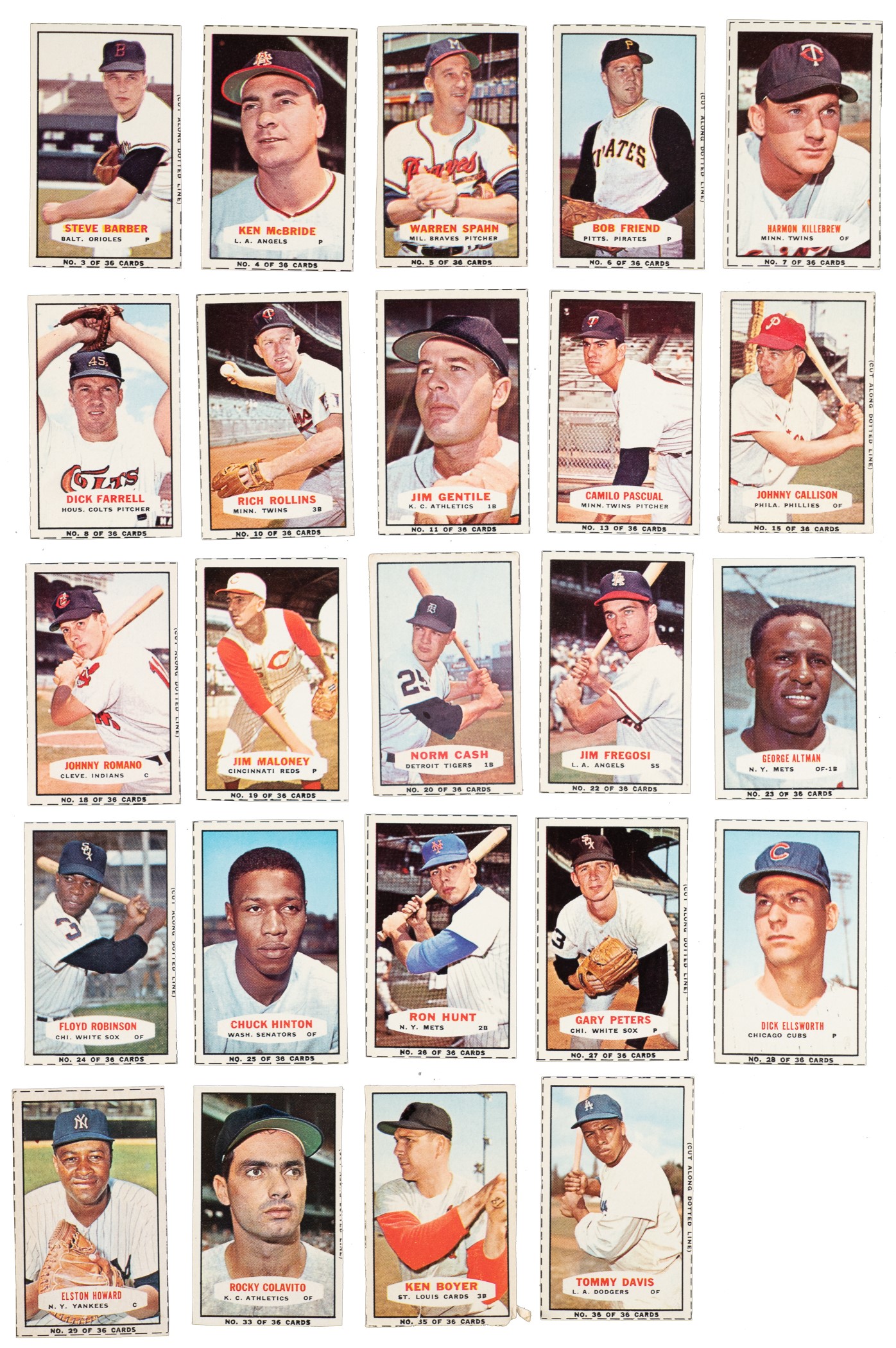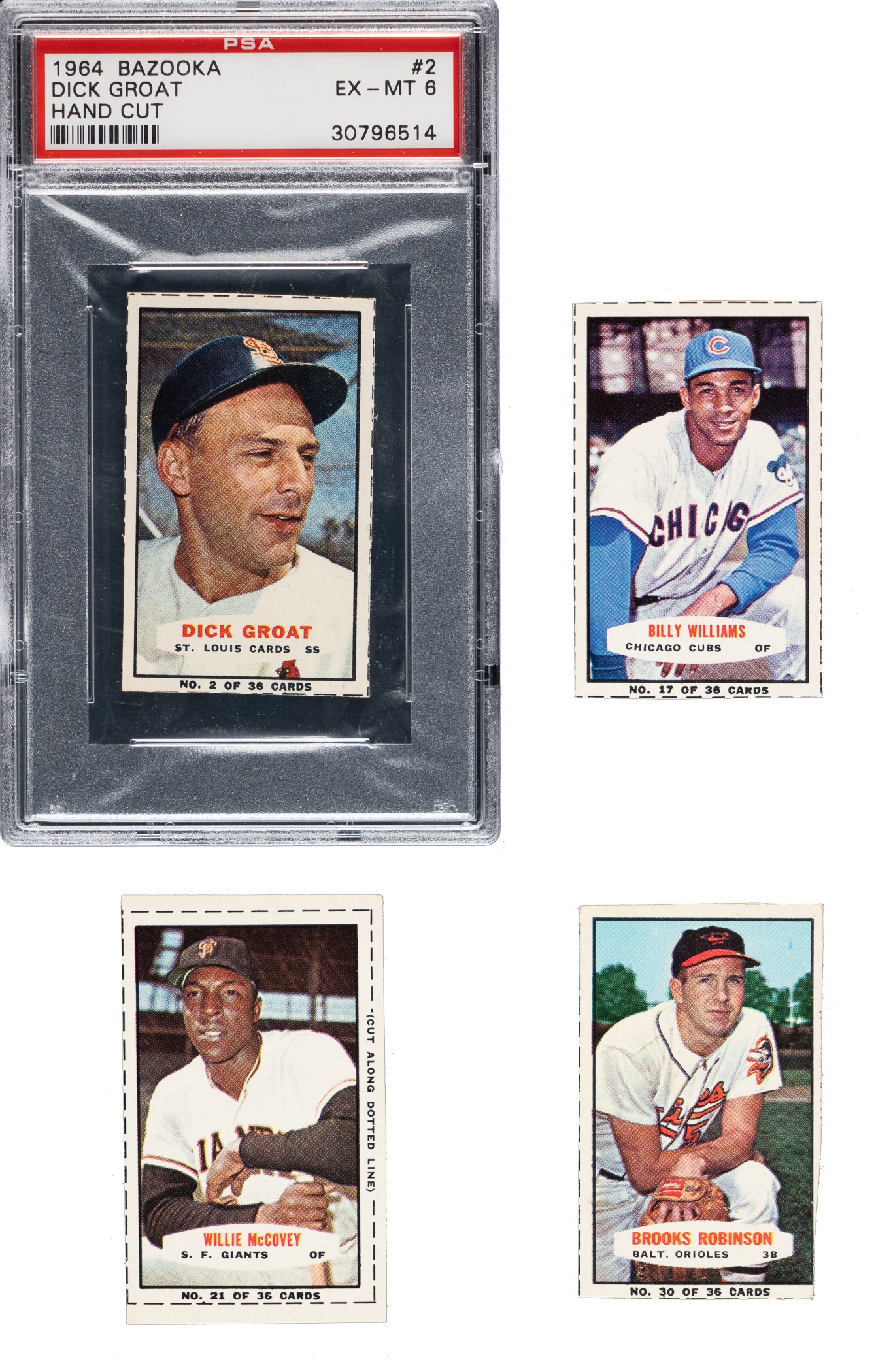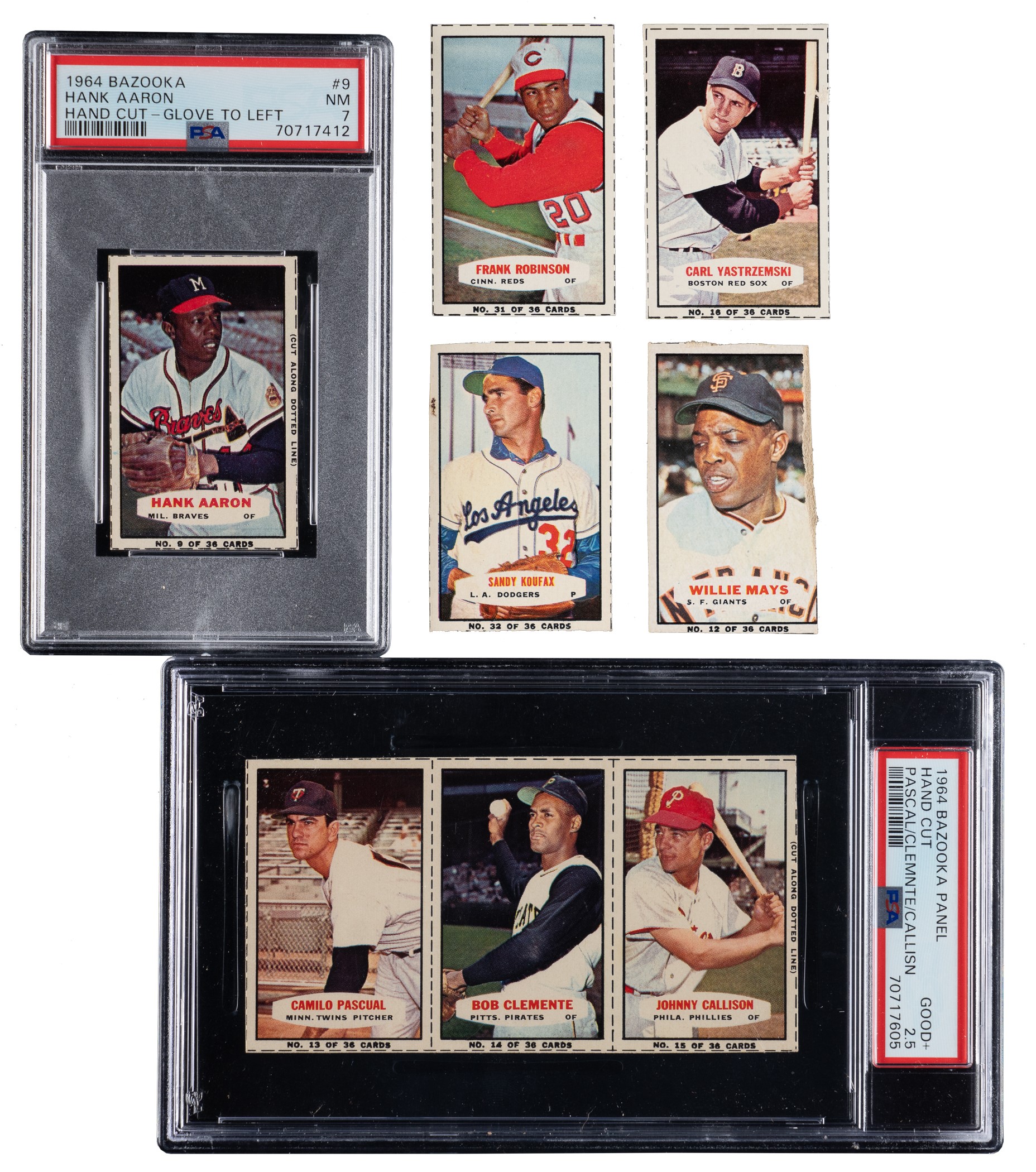 Near-complete set of 1964 Bazooka consisting of thirty-three single hand-cut cards (out of thirty-six in the set) plus one uncut three-card panel. Missing #1 Mantle, 14 Clemente (who appears on the panel included in this collection), and 34 Kaline for completion. The Hall of Famers featured in this near-set are Clemente, Aaron, Mays, Koufax, Kaline, Killebrew, McCovey, B. Robinson, F. Robinson, B. Williams, and Yastrzemski. Condition is 60% Nr/Mt to Nr/Mt-Mt, 10% ranging from Vg to Ex-Mt, and 30% Pr to Fr. The preceding grades, as well as those in the composite below, are also without respect to the neatness of the cut. (Most of the cards are cut neatly, although there are a few cases of tapering cuts or missing borders.) Three cards are graded and encapsulated by PSA. Keys: #2 Groat (EX-MT 6), 9 Aaron (NM 7), 12 Mays (cut small, otherwise Pr-Fr), 16 Yastrzemski (Fr-Gd due to small spot of paper loss on right border), 17 Williams (Nr/Mt-Mt), 21 McCovey (Nr/Mt), 30 B. Robinson (pencil mark on reverse, otherwise Gd+), 31 F. Robinson (Nr/Mt-Mt), and 32 Koufax (marks on reverse, otherwise Gd). Also included is an uncut panel #13/14 Clemente/15 (PSA GOOD+ 2.5, with no creasing of the Clemente portion of the panel). This is a very attractive near-set of these unusual, scarce, and underrated Bazooka Bubble Gum package-design cards. Total: 34 items (near-complete set of 33 cards plus uncut panel). Opening Bid $200.
