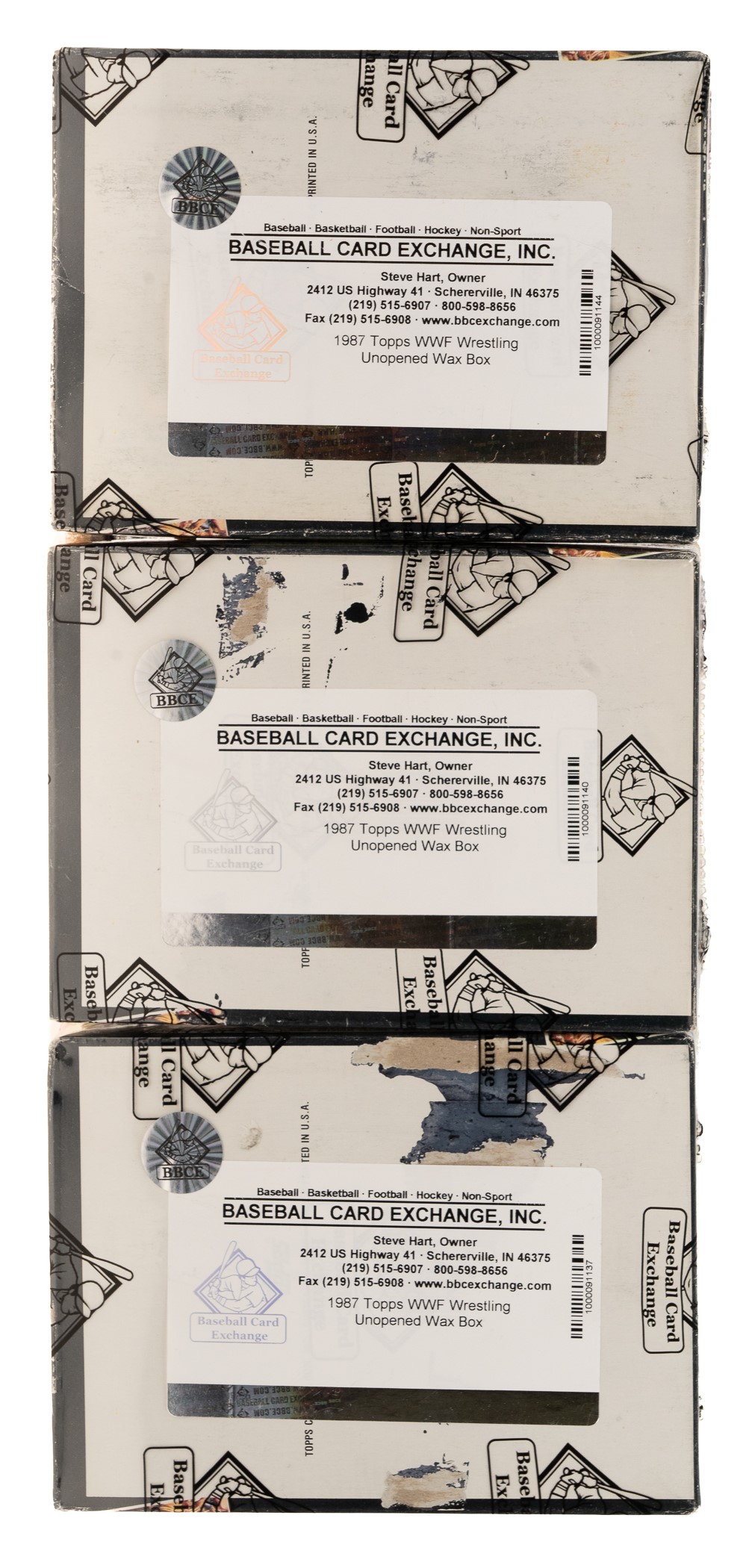 Trio of unopened wax boxes of 1987 Topps "WWF Wrestling" cards. Each box contains thirty-six packs. The 1987 Topps "WWF Wrestling" set includes cards of numerous wrestling superstars including Hulk Hogan and Andre the Giant. The store display boxes are bright and bold with moderate shelf wear. One of the boxes has a few spots of paper loss along the lid. These boxes come shrink-wrapped by Baseball Card Exchange (owned by Steve Hart, the foremost expert on unopened material). Total: 3 boxes. The size/weight of this item requires that there will be an additional shipping charge for this lot. Opening Bid $300.