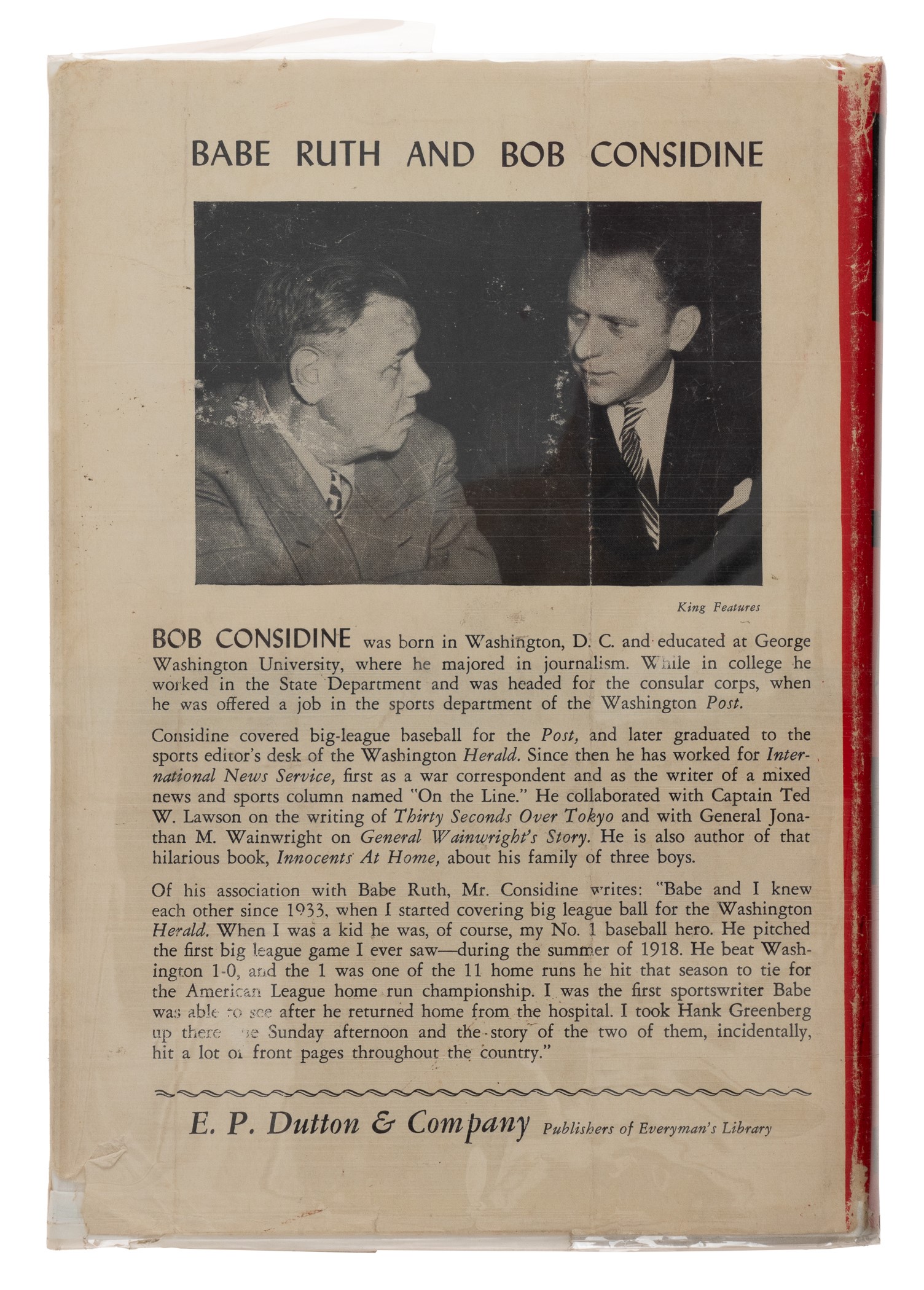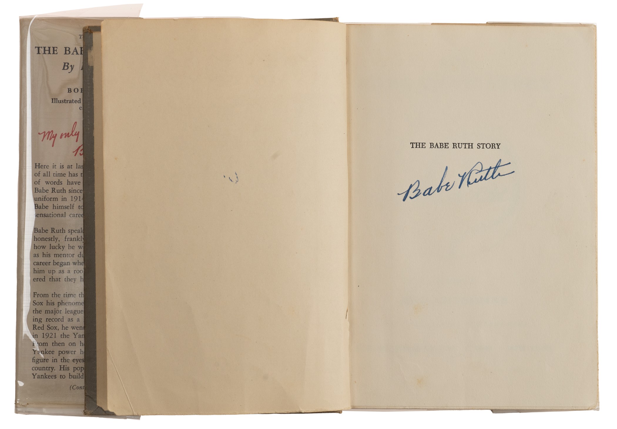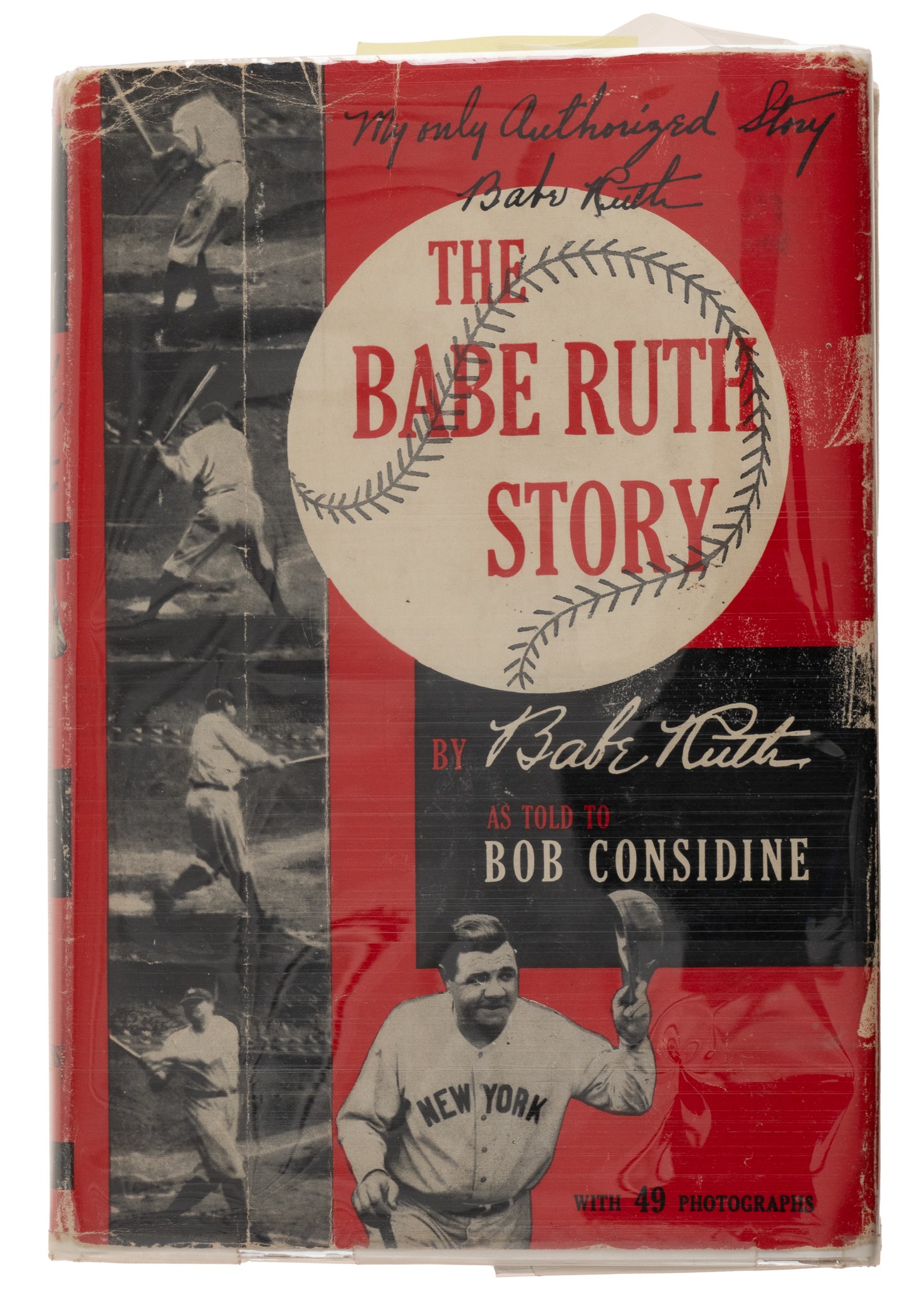 Beautifully signed copy of one of the most desirable of all baseball books: a first edition of The Babe Ruth Story by Babe Ruth as told to Bob Considine (New York: E. P. Dutton & Co., 1948). This copy includes a spectacular Babe Ruth signature written in blue fountain pen on the front flyleaf. The Babe Ruth Story was published just months prior to Ruth's death, a time when his failing health precluded him from honoring all of the many autograph requests he normally received. Signed copies of this book are not only rare but also represent one of the most important and final items ever penned by the legendary Ruth. For that reason they are highly prized by collectors today. The book has moderate general wear to the cloth-covered boards and is otherwise in Excellent condition. Together with a dust jacket dating from a later printing (12th printing, as noted on the interior) that is in Good to Very Good condition. Full LOA from James Spence/JSA. Opening Bid $2,500.
