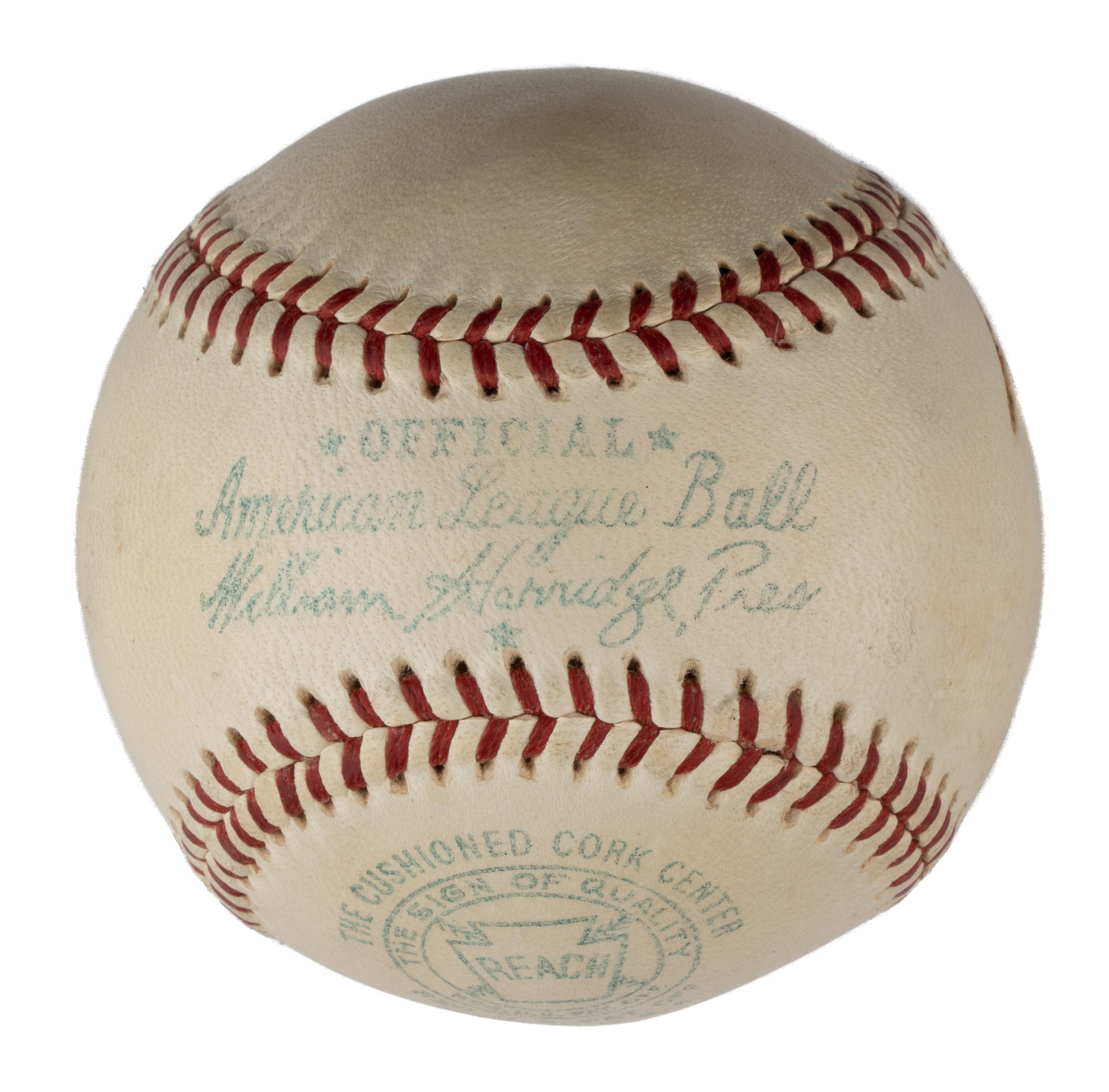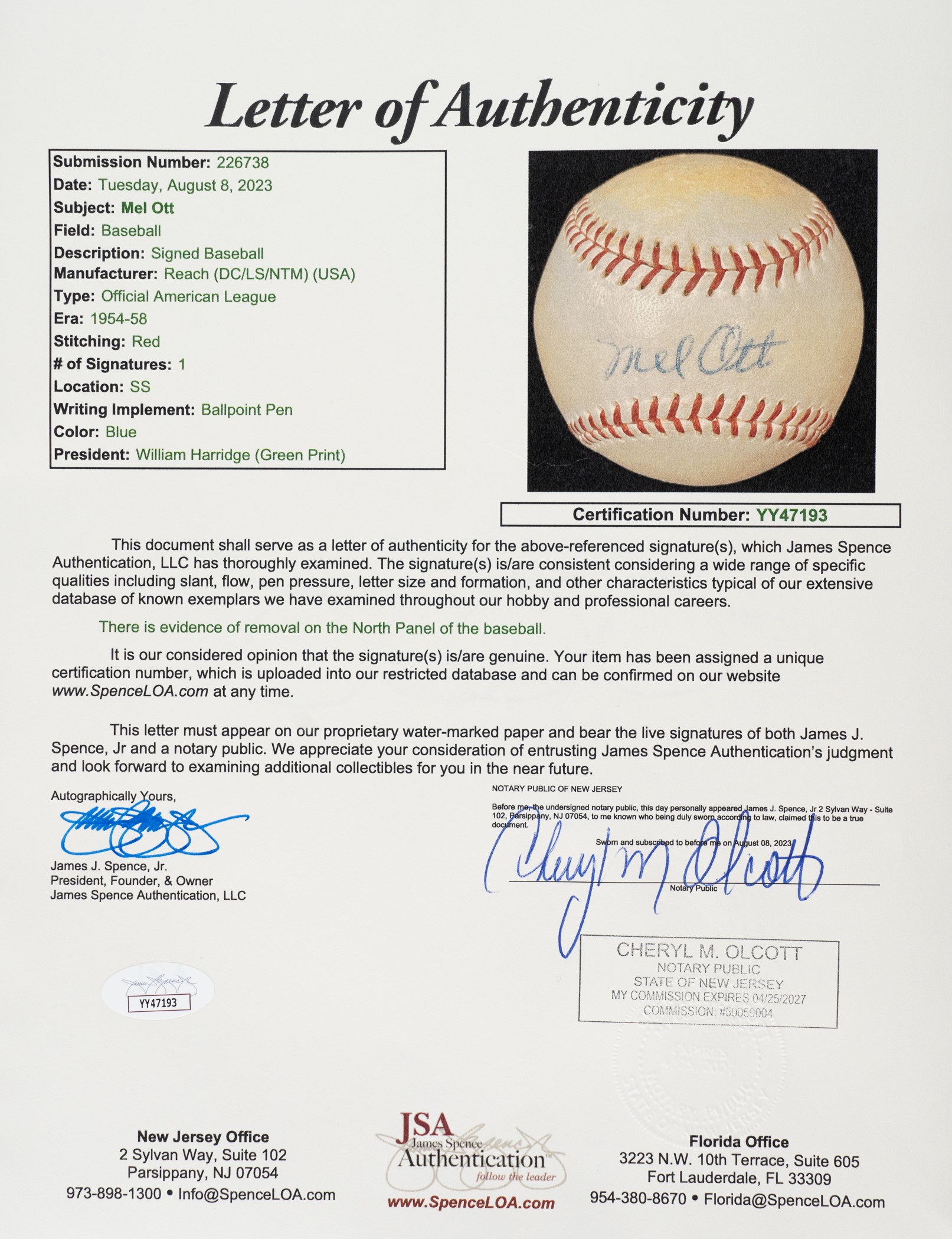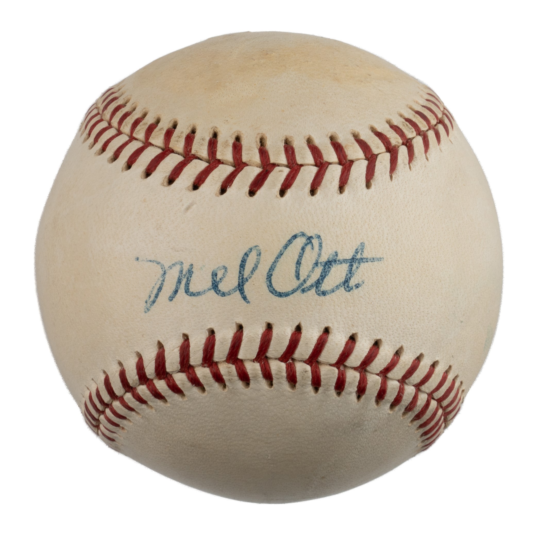 Official National League baseball (Harridge) signed by Hall of Fame slugger Mel Ott on the sweet spot. Ott has scripted his name in blue ink. According to JSA, there are signatures removed to give the ball the appearance of a Mel Ott single. The professional removal or covering of signatures on baseballs has become a cottage industry in recent times, carried out by a few skilled practitioners. Though many purists deride such practices, there are also collectors who welcome the service. Single-signed balls did not become the ideal for autograph collectors until the late 1980s/early 1990s. As a result, acquiring single-signed balls for many of the early Hall of Famers is quite difficult for the average collector due to their rarity and exorbitant prices. Examples such as this, though not truly "single signed," offer the same aesthetic appeal and provide a more economical alternative to a true single-signed ball for many collectors. Ott is a rare signature alone on a ball due to his death in 1958 at the age of 49. The ball has a black mark and abrasions on the north panel (to remove signatures), but otherwise in Excellent condition overall. Full LOA from James Spence/JSA. Opening Bid $1,000.