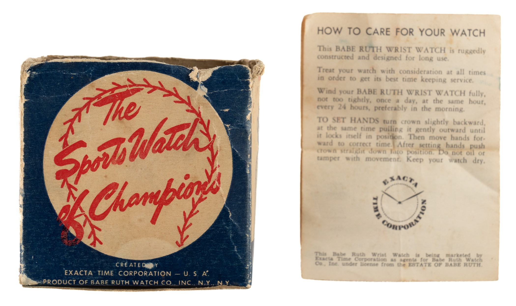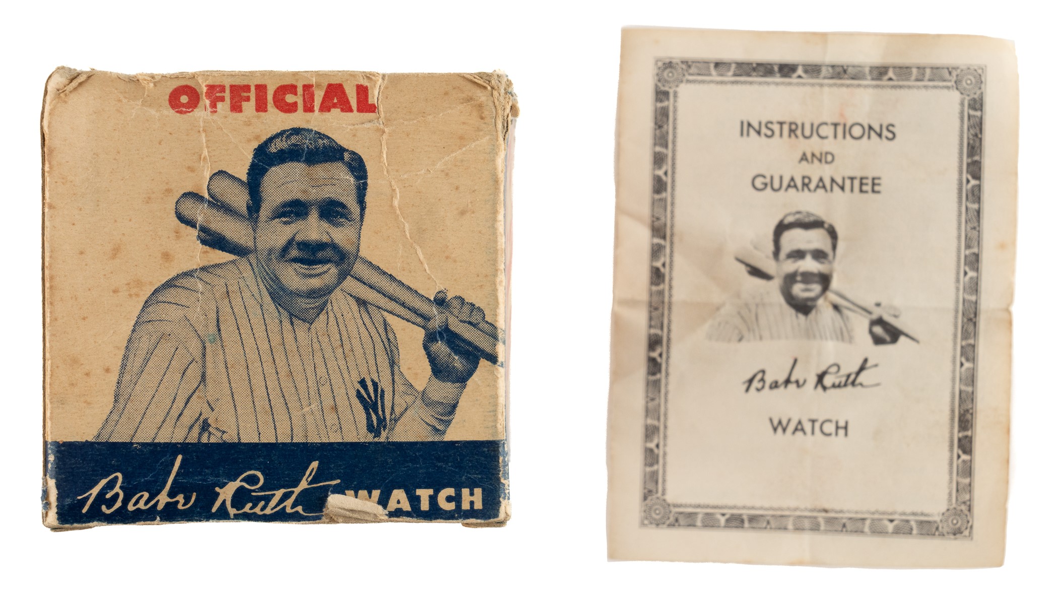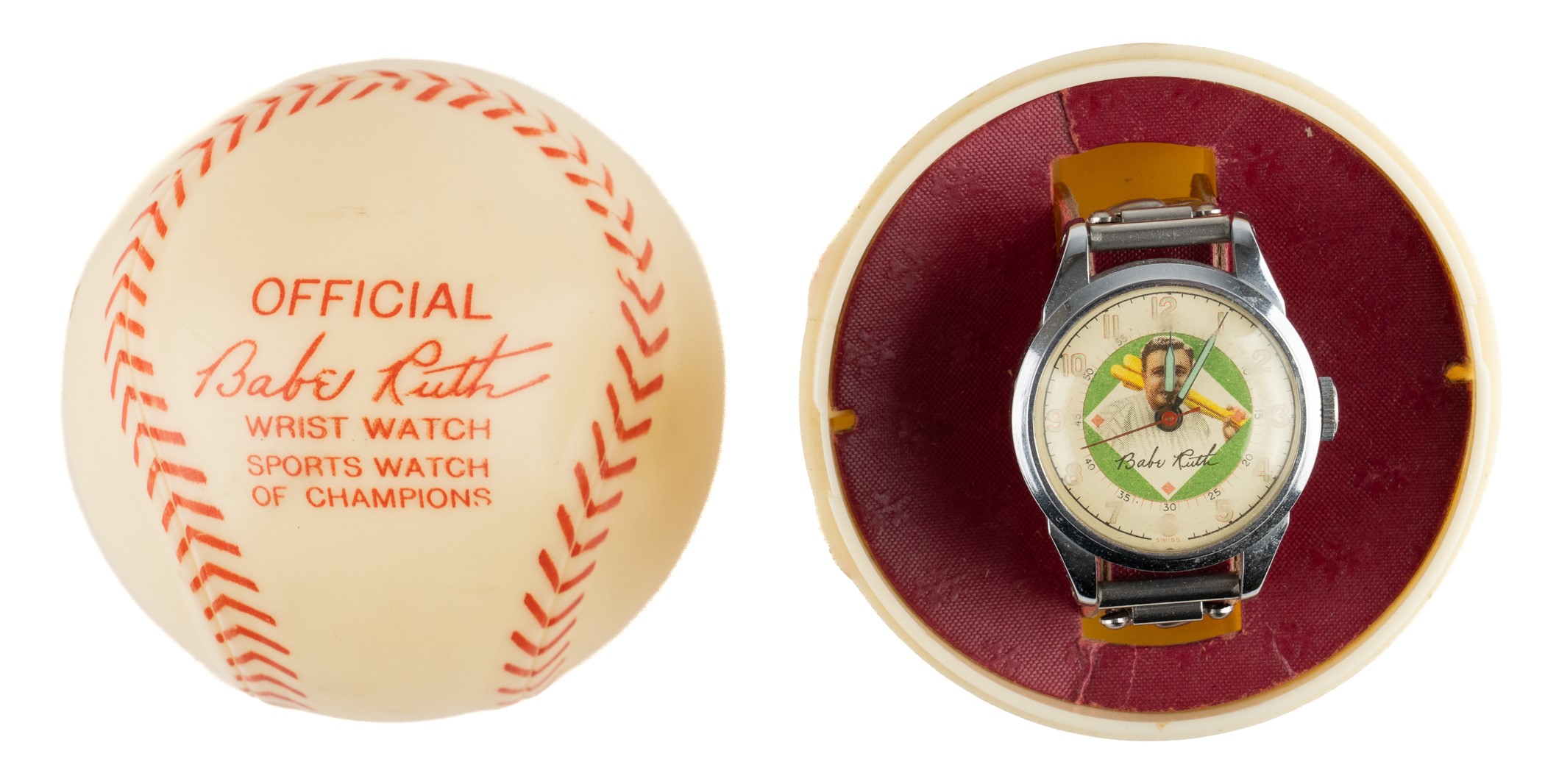 Babe Ruth wristwatch complete with original plastic ball case, the instruction sheet, and retail display box. The colorful watch, manufactured by the Babe Ruth Watch Company and distributed by the Exacta Time Corporation, features Ruth's image on the facing along with his facsimile signature. The original ball case is lettered "Official Babe Ruth Wrist Watch/Sports Watch of Champions." This piece has always been highly regarded by collectors for its outstanding display value, especially when accompanied by its original plastic baseball case (which is almost always missing), and the offered example is no exception. The watch is not in working order, but is otherwise in Excellent condition. The plastic ball case has minor wear and is in Very Good to Excellent condition overall. The instruction sheet is in Good condition. The lid to the box (3 x 3 x 3 inches) became detached at some point. Fr condition. Total: 4 items (watch, case, instruction sheet, and display box). Opening Bid $200.