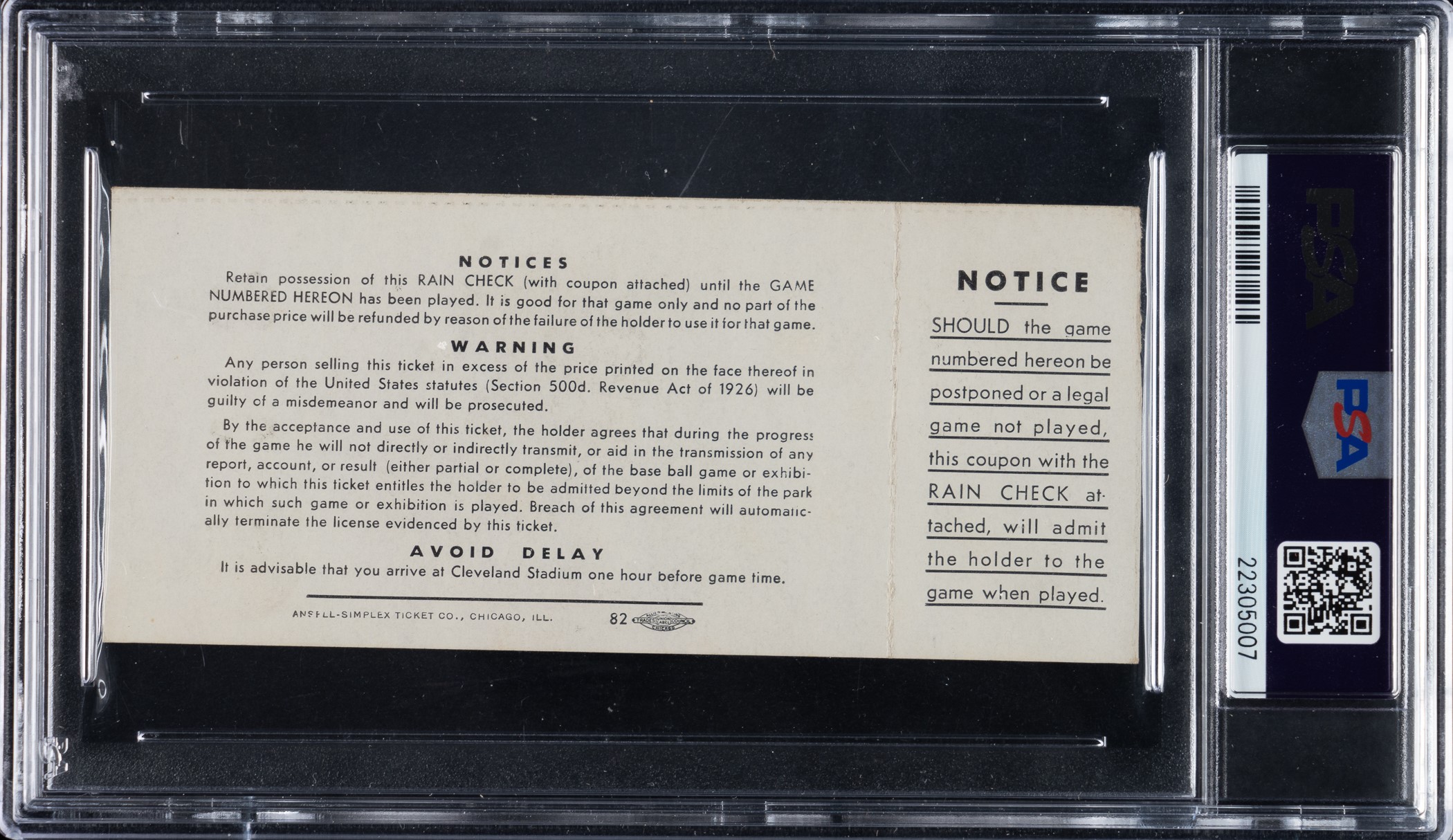 Ticket stub issued for Game 5 of the 1948 World Series between the Cleveland Indians and Boston Braves held at Municipal Stadium on October 10th. Graded EX 5 by PSA. The Braves defeated the Indians 11-5 behind Warren Spahn's complete game. Game 5 also marked the World Series debut for Satchel Paige. The ticket stub (5-1/8 x 2-1/4 inches) has light handling wear. Opening Bid $200.