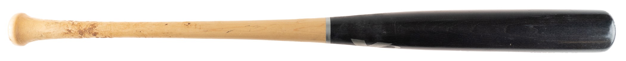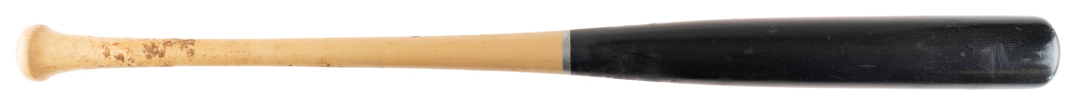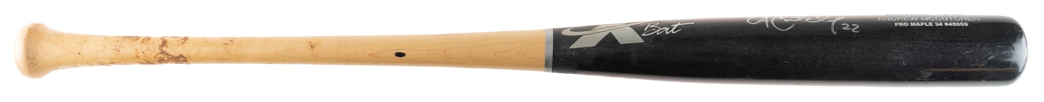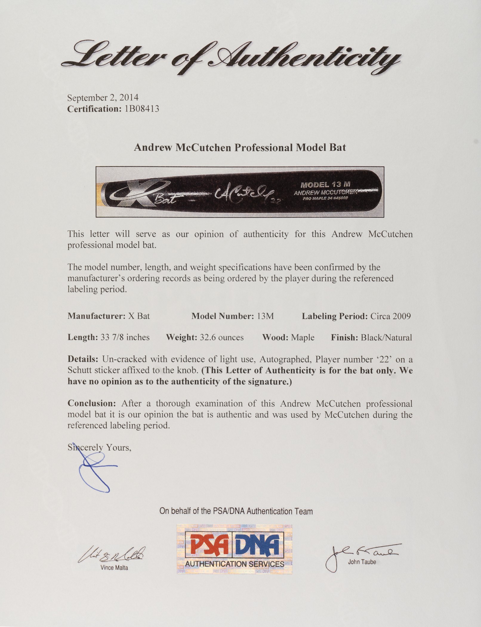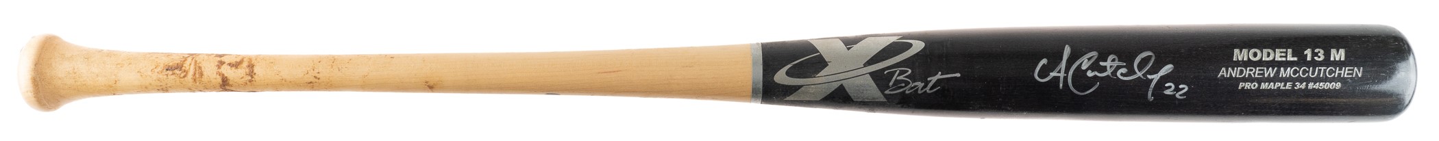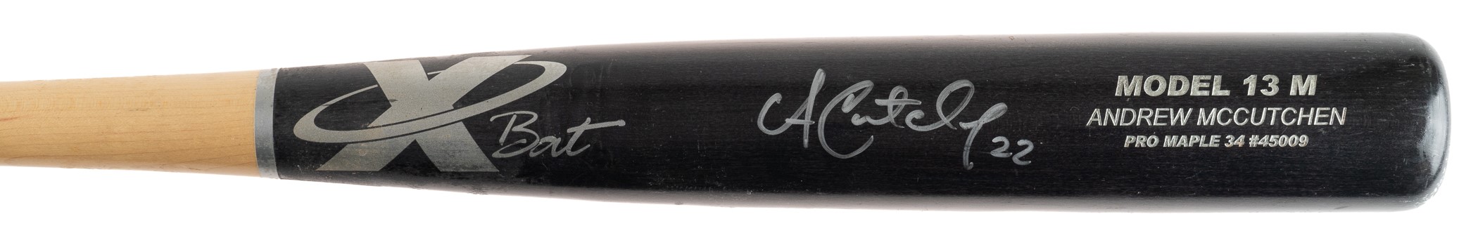 Andrew McCutchen X Bat block-letter (full name) model "13M" bat dating from the 2009 manufacturing period. The bat, which is not cracked, has evidence of light use, including ball marks and a light coat of pine tar on the handle. McCutchen's uniform number ("22") on a Schutt sticker is affixed to the knob end. He has signed the bat and added his uniform number "22" in silver marker on the barrel. This is a scarce rookie-era McCutchen bat. Length: 33.75 inches. Weight: 32.6 ounces. Full LOA from John Taube of PSA/DNA (bat only). Auction LOA from James Spence/JSA (autograph only). The size/weight of this item requires that there will be an additional shipping charge for this lot. Opening Bid $100.