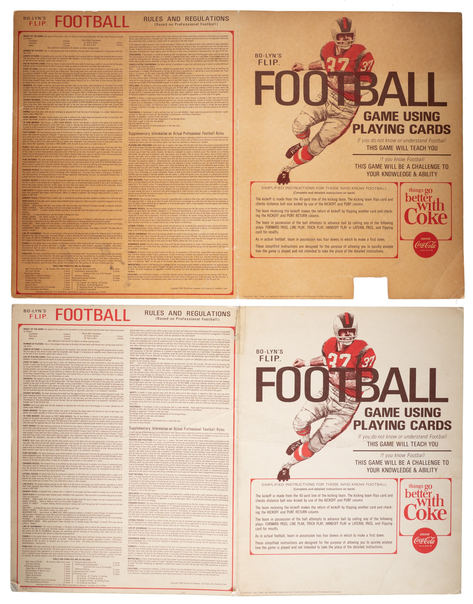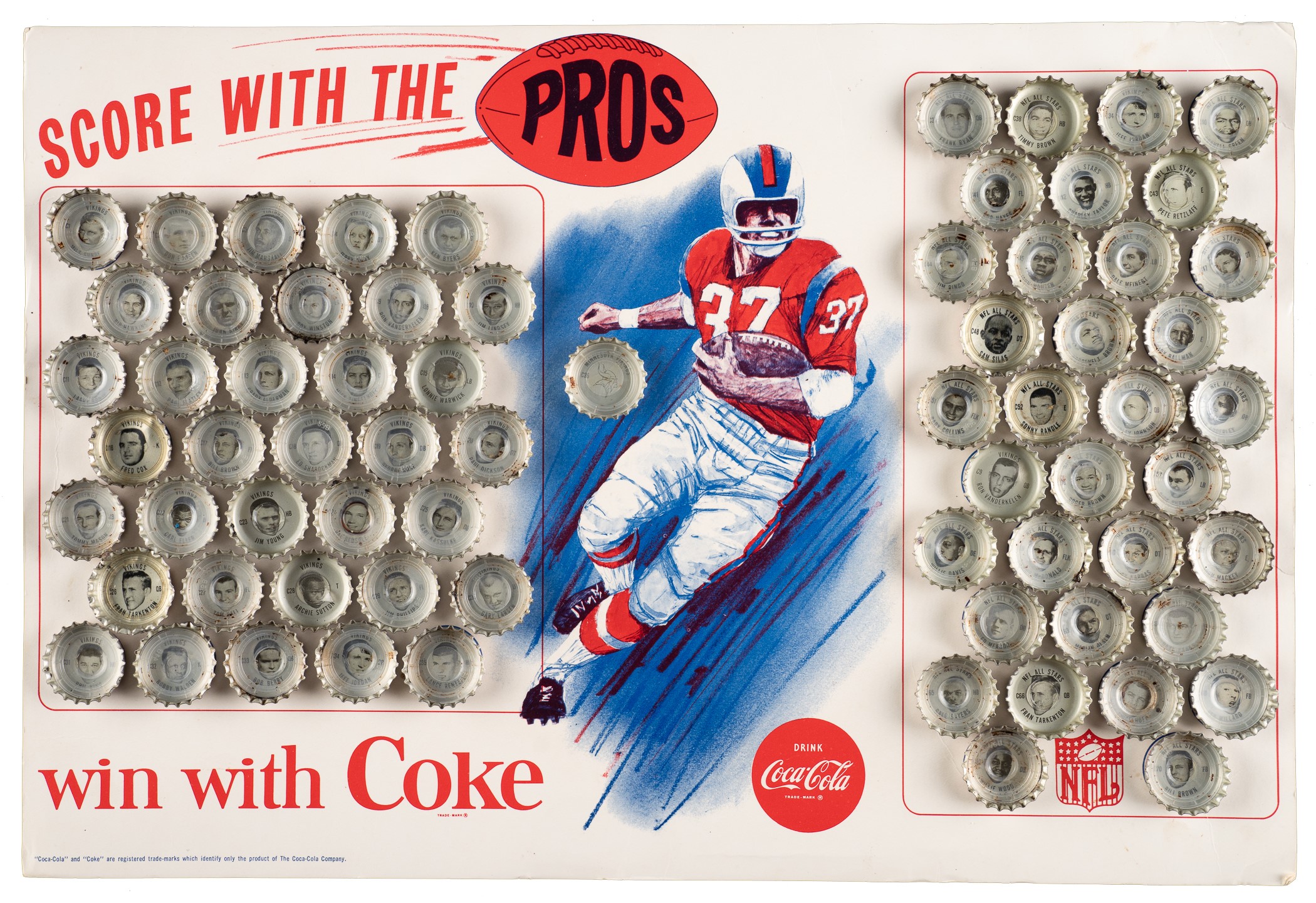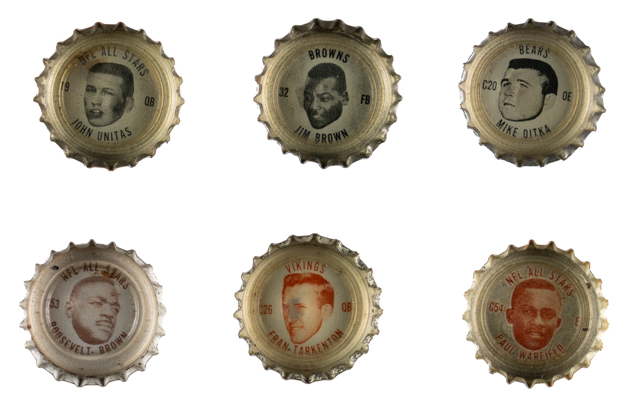 Tremendous collection of 631 assorted (621 different) Coca-Cola bottle caps spanning the years 1964 to 1966, all of which feature a portrait image of a football player on the underside. Each player is identified in print below his image, with the team name above. Condition ranges from Pr to Vg-Ex (averaging Gd-Vg), with some better. Seventy of the bottle caps have been affixed with glue to a Coca-Cola "Score with the Pros" board designed for that purpose. This collection consists of the following: 1) 1964 All-Star Complete Set (44). 2) 1964 Bears (10): Petitbon, Whitsell, Galimore, L. Morris, J. Morris, Karras, Leggett, Barnett, Johnson, and Bradovich. 3) 1964 Browns (30): Jim Brown, Ninowski, Webb, Scales, Parker, Ryan, Benz, Gain, Glass, Warfield, Wooten, Franklin, Hickerson, John Brown, Kanicki, Shorter, Groza, Truax, Lucci, Parrish, Fiss, Beach, Costello, Collins, Fichtner, Green, Morrow, Clark, Hutchinson, and Brewer. 4) 1964 Lions Partial Set (18/35): Barr, Brown, Clark, Gaubatz, Lions Logo, Lane, LaRose, Lary, Lewis, Morrall, Scholtz, Smith, Studstill, Vargo, Watkins, Whitlow, and Williams. 5) 1964 Redskins (7): Budd, Carr, Sample, Taylor, Pellegrini, Williams, and Paluck. 6) 1964 Vikings (4): Tarkenton, Kassulke, Franckhauser, and Brown. 7) 1965 All-Star Complete Set (34). 8) 1965 Bears (12): Taylor, Morris, Pyle, Leclerc, Lee, Evey, George, Atkins, Arnett, Bivins, Cadile, and Bears Logo. 9) 1965 Giants (26): Koy, Mercein, Timberlake, Katcavage, Walker, Moran, Winter, Child, Patton, Morrison, Lynch, Larson, Slaby, Costello, Dess, Lasky, Pesonen, Scott, Shofner, James, Stynchula, Thurlow, Wheelwright, Bolin, Wood, and Giants Logo. 10) 1965 National NFL Partial Set (23/70): Walker, Paluck, Adderley, Lilly, Ballman, Promuto, Warfield, Roosevelt Brown, Roger Brown, Lary, Tingelhoff, Marchetti, Johnson, Barr, Ringo, Wood, Cross, Gregg, Browns Logo, Gordy, Schafrath, Krause, and Jurgensen. 11) 1965 Patriots Partial Set (16/36): St. Jean, Eisenhaur, Farmer, McKinnon, Garrett, Hunt, Oakes, Nance, Dee, Patriots Logo, Felt, Schmidt, Watson, Morris, Wilson, and Dukes. 12) 1965 Redskins Partial Set (23/36): Paluck, Cesares, Bredlove, Pellegrini, Hernandez, Taylor, Coia, Krause, Carr, Sanders, Steffen, Nisby, Izo, Promuto, Sample, Richter, Carpenter, Huff, Barnett, Hauss, Reger, Seals, and Rotgens. 13) 1965 Vikings Complete Set (36) Plus Two Duplicates: Includes two duplicates (#9 and 34). 14) 1965 Vikings Partial Set (17/36): Swain, Lacey, Marshall, Linden, Reichow, Flatley, Hawkins, Cox, Calland, Rose, Tarkenton, Phillips, Kirby, Winston, Jobko, Walden, and Prestel. 15) 1966 AFL Partial Set (18/34): Kemp, Bell, W. Brown, Buchanan, Cappelletti, Daniels, Frazier, Hadl, Hennigan, Holub, Johnson, Lincoln, Lowe, Maynard, Morris, Namath, Paulson, and Talamini. 16) 1966 All-Star Complete Set (34). 17) 1966 Bears Complete Set (36) Plus Seven Duplicates: Includes the following duplicates: #1, 5, 8, 10, 13, 17, and 27. 18) 1966 Browns Near-Complete Set (35/36) Plus One Duplicate: Missing cap #10 for completion. Includes one duplicate (#31). 19) 1966 Browns Partial Set (20/36): Brewer, Beach, Modzelewski, Houston, Lucci, Hutchinson, Morrow, Kanicki, Warfield, Johnson, Kelly, Fiss, Wooten, McNeil, Wiggin, Green, Williams, Parrish, Costello, and J. Brown. 20) 1966 Chiefs Partial Set (26/36): Missing the following ten caps for completion: #15, 21, 22, 25, 27, 28, 30 Taylor, 32, 33, and 34 Dawson. 21) 1966 Giants Complete Set (35). 22) 1966 Giants Near-Complete Set (31/36): Missing the following five caps for completion: #10, 13, 17, 30, and 31. 23) 1966 Jets Complete Set (35). 24) 1966 NFL All Stars Near-Complete Set (32/34): Missing two caps for completion: #39 and 55. 25) 1966 Patriots Partial Set (19/36): Buoniconti, Huarte, Cappelletti, Shonta, Felt, Eisenhauer, Fraser, St. Jean, Arrington, Patriots Logo, Long, Romeo, Neville, Graves, Johnson, Hennessey, Garron, Canale, and Graham. Also included are two "Bo-Lyn's Flip Football" game boards sponsored by Coca-Cola. One board has a tape repair at the vertical fold, otherwise presenting in Good condition. The second board has had a playing piece (not present) cut from the board, otherwise presenting in Very Good condition. Total: 631 bottle caps. The size/weight of this item requires that there will be an additional shipping charge for this lot. Opening Bid $300.