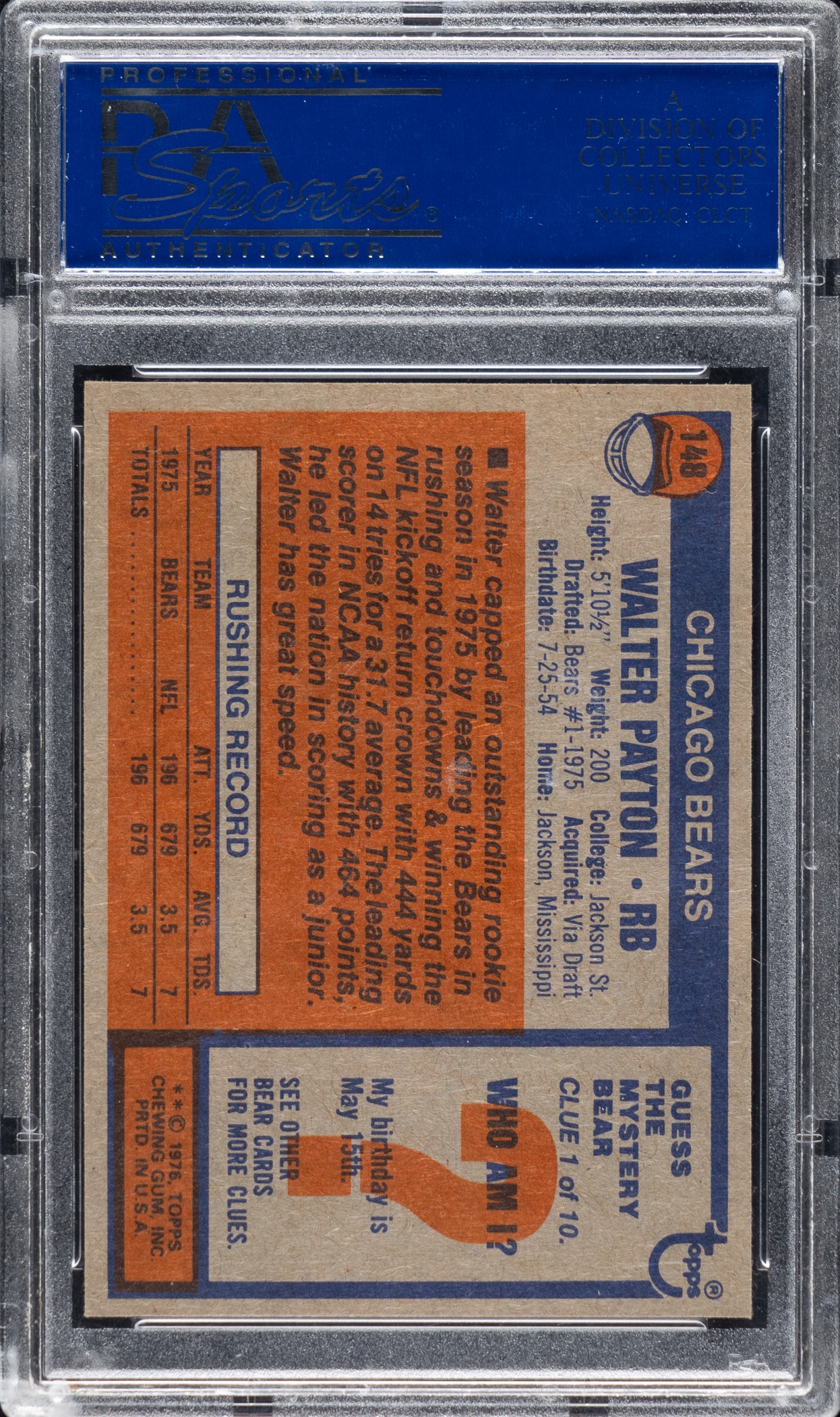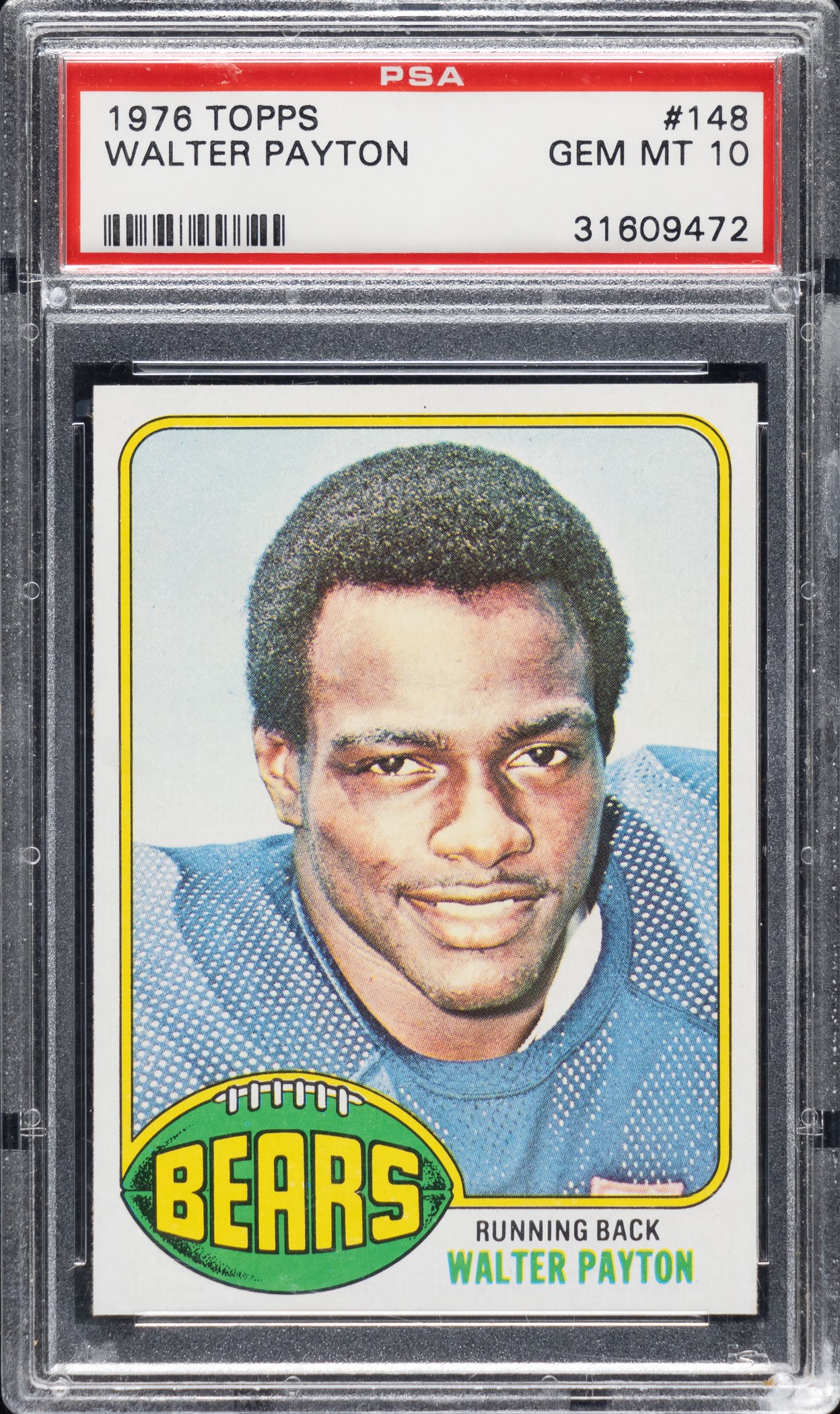Graded GEM MINT 10 by PSA. Spectacular ultra-high-grade rookie card of Hall of Famer Walter Payton from the 1976 Topps football set. This card boasts vibrant colors, superb image quality, sharp corners, and excellent centering. Examples of premier rookie cards, such as this, in extremely high grades have realized exceptionally strong prices recently. This is a tremendous rookie card of one of the great running backs in the history of the game and one of card collecting's modern classics. It would be at home in a world-class collection! Opening Bid $10,000.