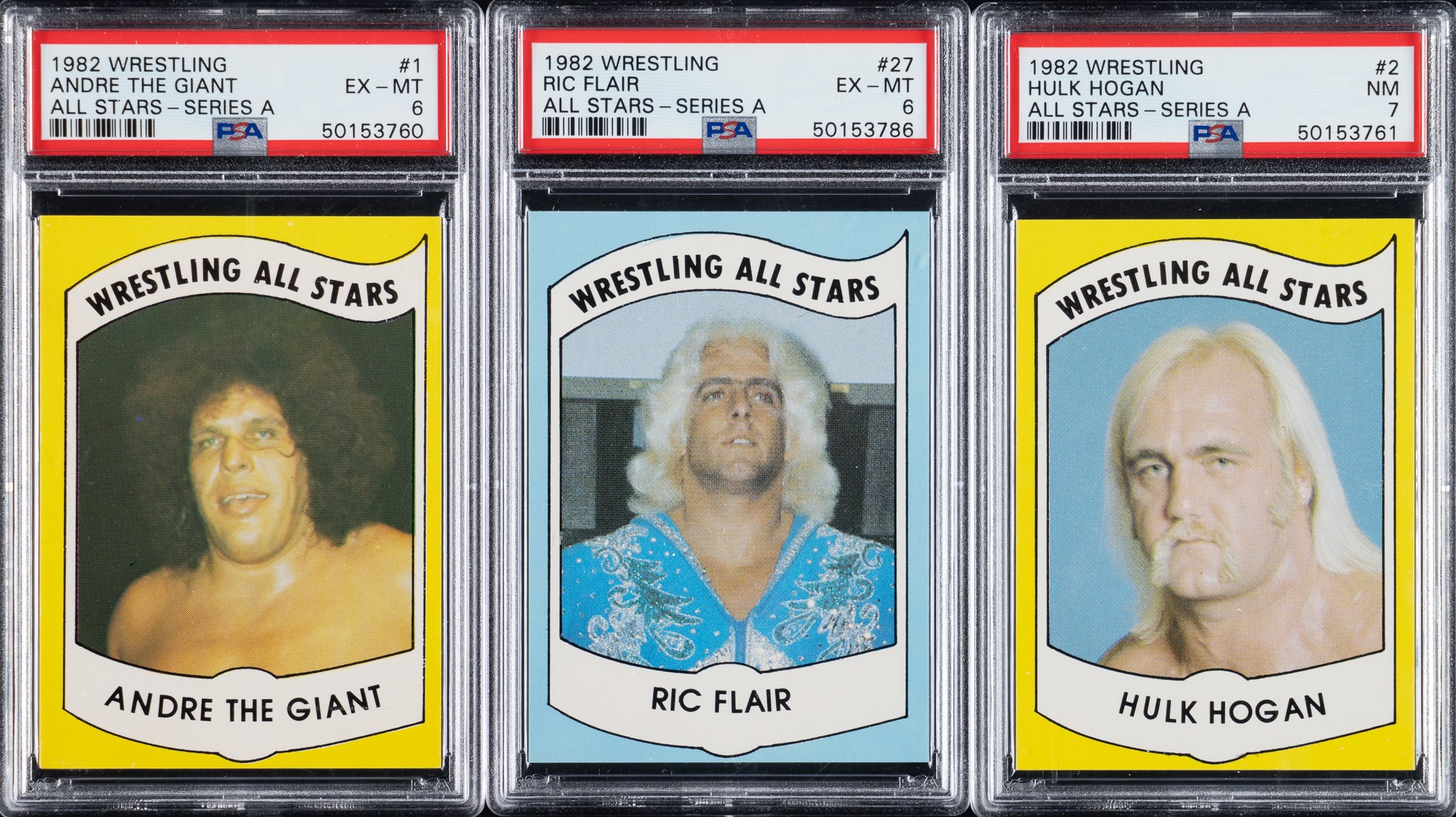 Produced by the Wrestling News magazine, the 1982 Wrestling All Stars "Series A" offers the first standard trading cards of legends like Andre the Giant, Hulk Hogan, and Ric Flair. The only way these sets could be purchased at the time of issue was as full, cellophane-wrapped sets via mail order through an ad in the Wrestling News or Wrestling Revue magazines for $5. Estimates for production are that less than 2,000 sets were produced. Many collectors compare this set to the 1986-1987 Fleer Basketball set as a landmark set with the first cards of many legends and superstars, including what most collectors consider to be Hulk Hogan and Ric Flair rookie cards! This set is very condition sensitive due to the color borders and the fact that most sets were sold tightly wrapped in cellophane. This is an extraordinary high-grade complete set! Each card has been professionally graded and encapsulated by PSA (submitted by REA). PSA Grading Composite: NM-MT 8 (2 cards): #6 and 32. NM 7 (7 cards): #2 Hulk Hogan, 4 DiBiase, 5, 9 Funk Jr., 12, 31, and 35. EX-MT 6 (27 cards): #1 Andre The Giant, 3, 7, 8, 10, 11, 13 Sammartino, 14 Morales, 15, 16, 17, 18, 19, 20 Brody, 21 Fabulous Moolah, 22 McDaniel, 23, 24, 25, 26, 27 Flair, 28 Putski, 29 Murdoch, 30, 33, 34, and 36. For generations of fans who grew up watching these innocent but thrilling spectacles on late Saturday night and early Sunday morning TV, these card sets will evoke strong memories. This set harkens back to a simpler age before blaring music, pyrotechnics, and catch phrases, when wrestling was a guilty pleasure, when these pioneers of athletics and entertainment broke new ground. Total: 36 cards. Opening Bid $2,000.