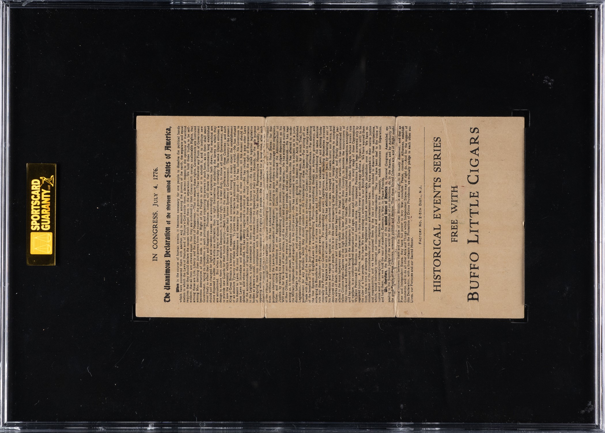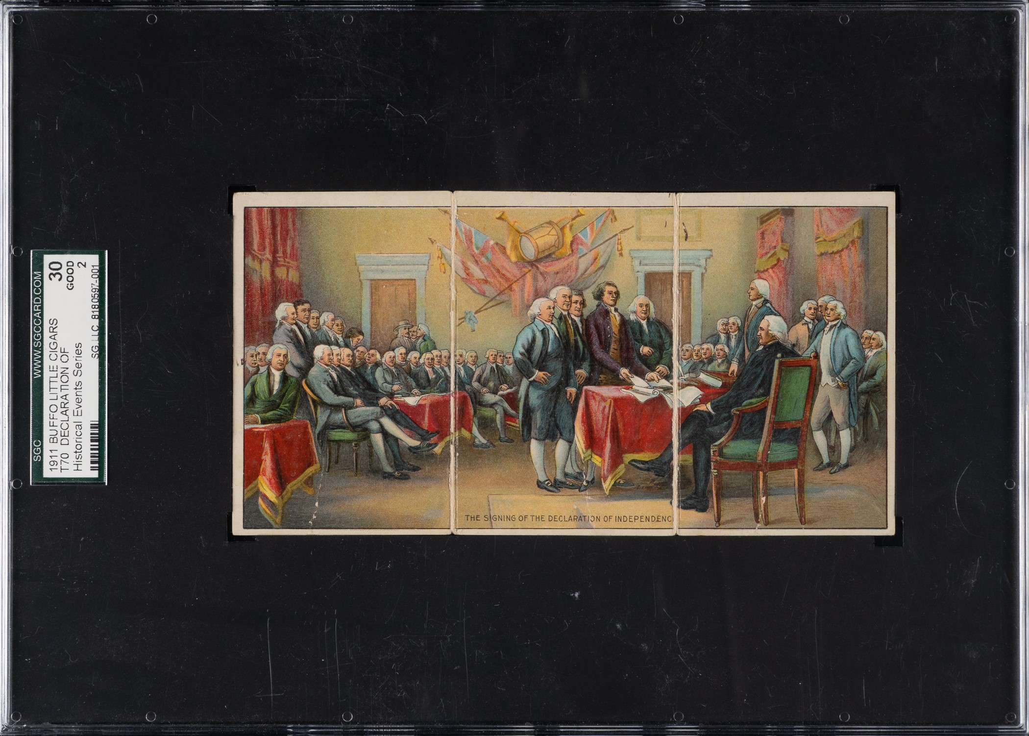 Rarely offered and extremely desirable tri-fold card of "The Signing of the Declaration of Independence" from the T70 "Historical Events Series." Issued in 1911, "Historical Events Series" is one of the most highly regarded and popular of all 1910-era nonsports sets. The offered example is graded GOOD 30 by SGC and features advertising for "Buffalo Little Cigars" on then reverse. This card is highly prized by both historical collectors and nonsport tobacco-card collectors. Opening Bid $100.