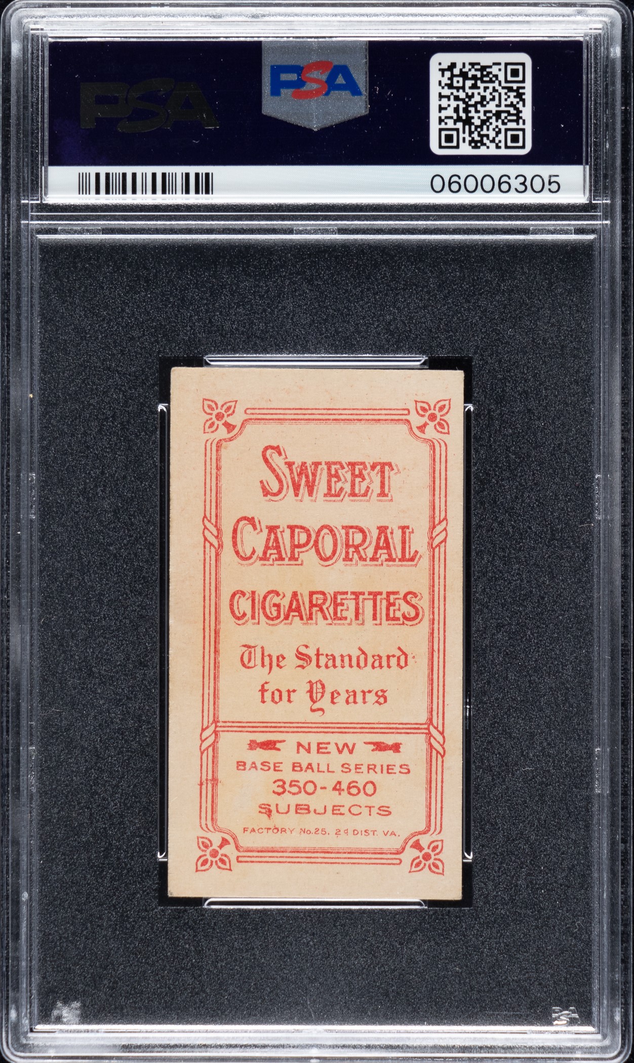 Graded NM 7 by PSA. High-grade example of what is recognized as one of Ty Cobb's more striking cards. The red-background pose is one of the classics of the T206 set and of all vintage cards. This card has a brilliant red background, outstanding registration, and strong corners with light touches of wear (weaker top right). Boldly printed Sweet Caporal 350-460/25 advertising reverse has a small surface flaw in the lower portion. A very attractive high-grade example of one of the key cards from the premier tobacco issue of the 1910 era. This T206 Cobb red-background portrait would make a significant addition or upgrade to virtually any world-class T206, vintage Hall of Famer, or Ty Cobb card collection. Opening Bid $25,000.