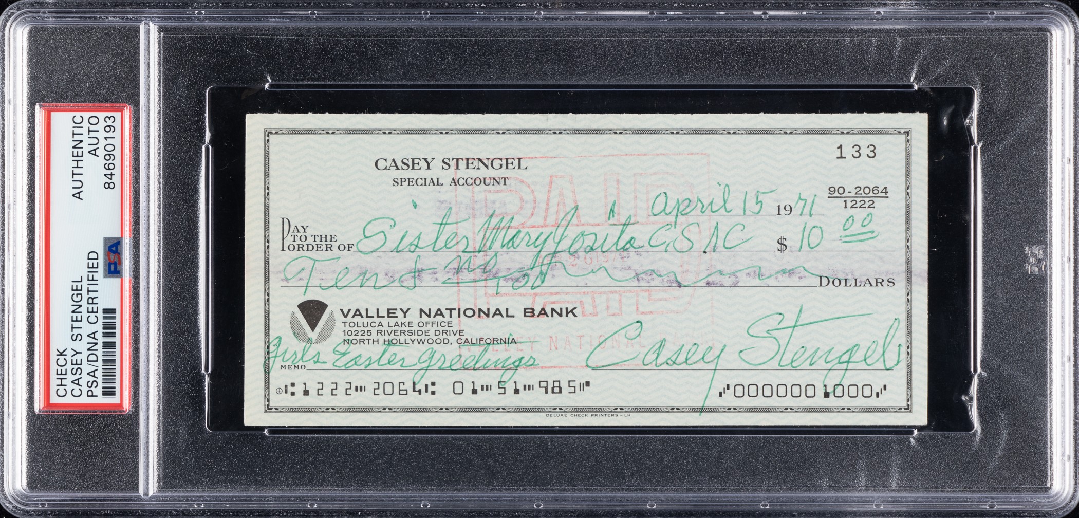 1971 Casey Stengel Signed Check - PSA/DNA