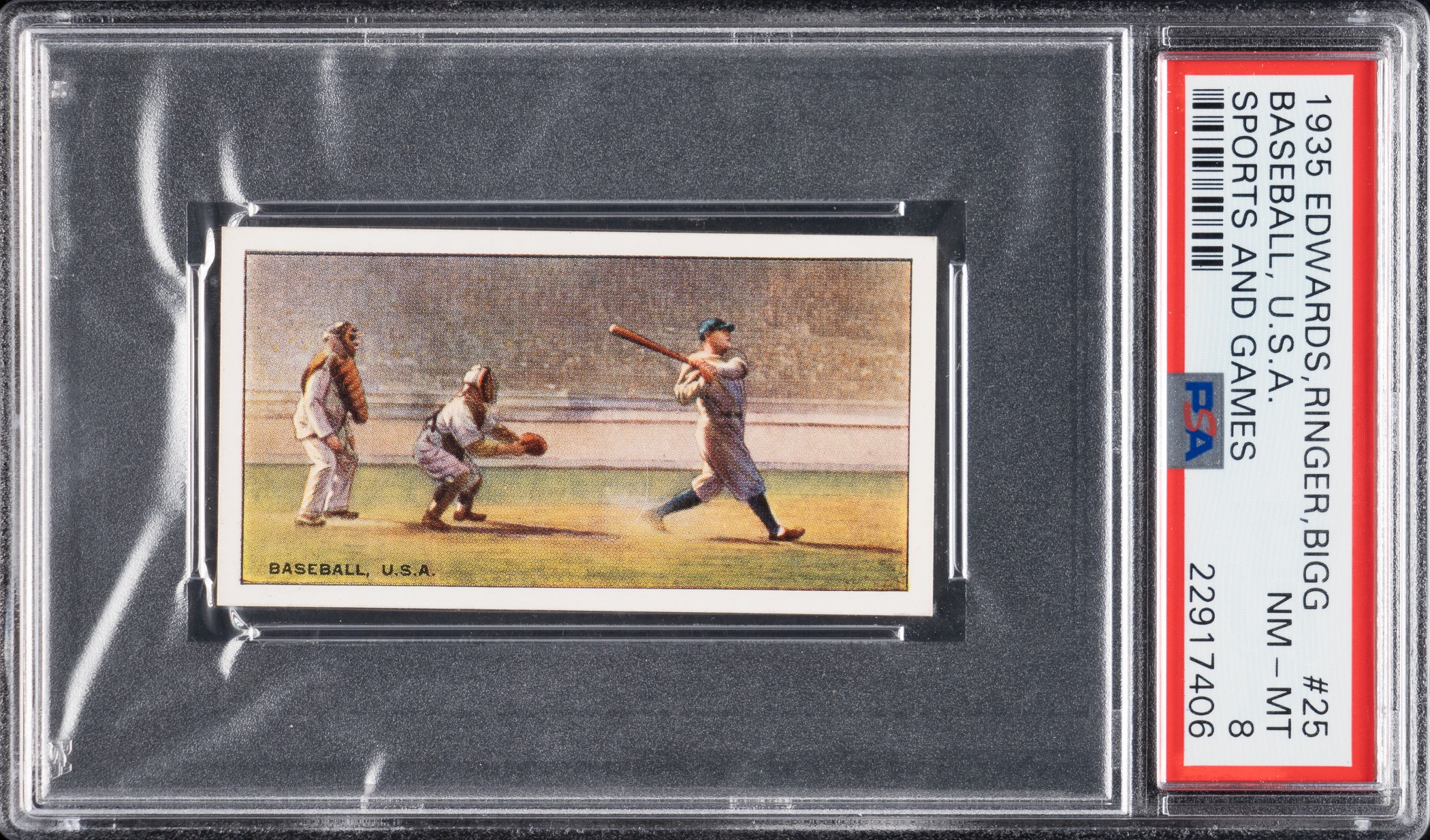 Graded NM-MT 8 by PSA. Outstanding example featuring #25 Babe Ruth from the "Sports & Games In Many Lands" set issued by Imperial Tobacco Co. with their Edwards, Ringer, & Bigg tobacco brand. Issued in England, this beautiful full-color tobacco issue of 25 different subjects includes representation of all types of athletes (boxing, football, tennis, track, etc.), and Ruth is the only representative of American baseball. The card features a full-color scene of Babe Ruth in a swinging follow-through pose, with a short description of the scene on the reverse. It is interesting to note that this card was produced with the same image as the Shonen Club Japanese postcard and the more frequently seen 1929 Churchman card. The offered example has brilliant colors, a crisp image, strong corners, and excellent centering. This scarce high-grade Babe Ruth card represents a remarkable value in comparison to gum cards of Ruth from the 1930s. Reserve $10.