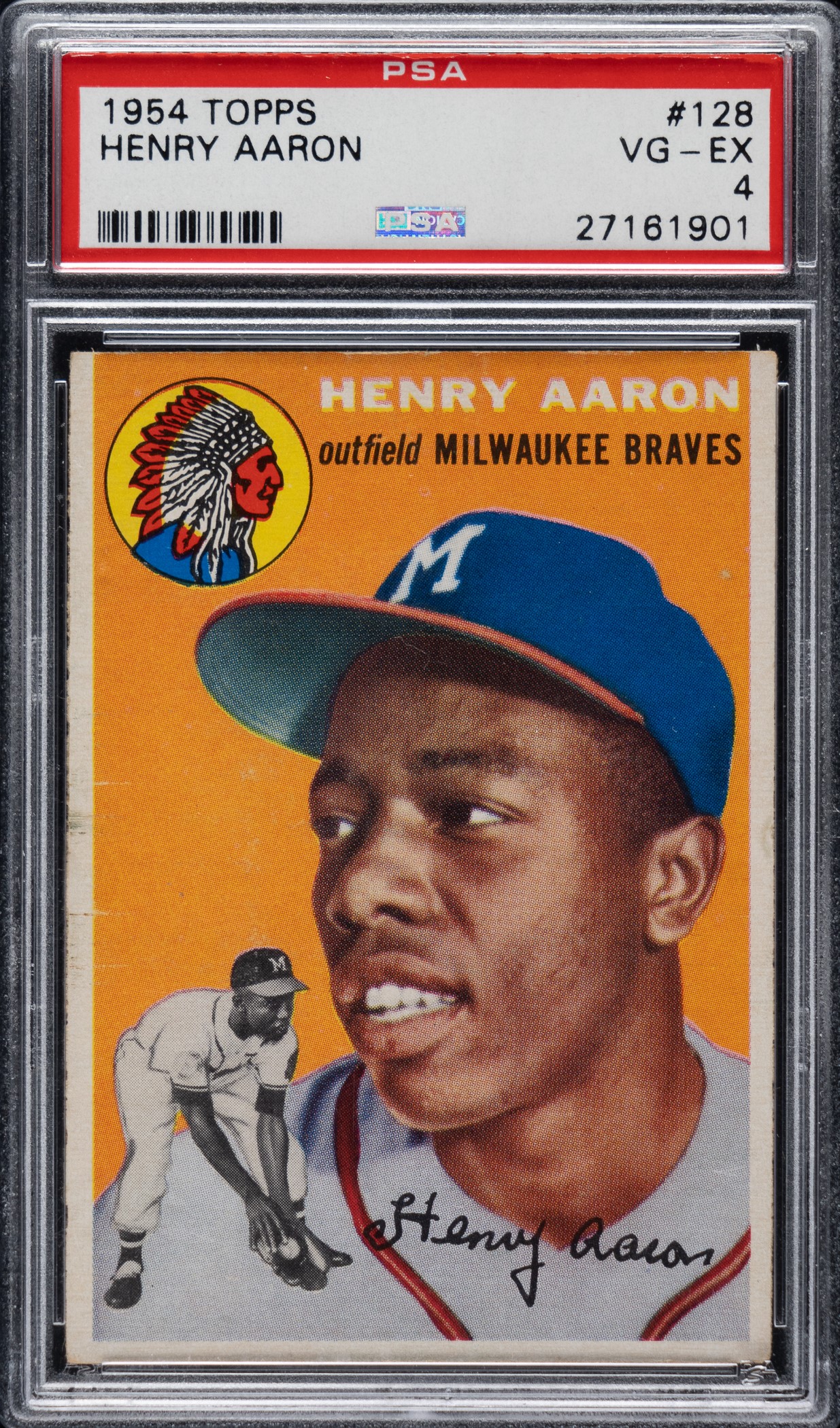 Graded VG-EX 4 by PSA. Attractive mid-grade example of Hank Aaron's rookie card. One of card collecting's classics, Aaron's rookie card is the key to the 1954 Topps set and one of the most popular of all postwar baseball cards. The card has vibrant colors, outstanding registration, and honest corner wear. Clean reverse. Please note there is a spot of surface wear along the right border and a few small print lines along the left border. Opening Bid $10.