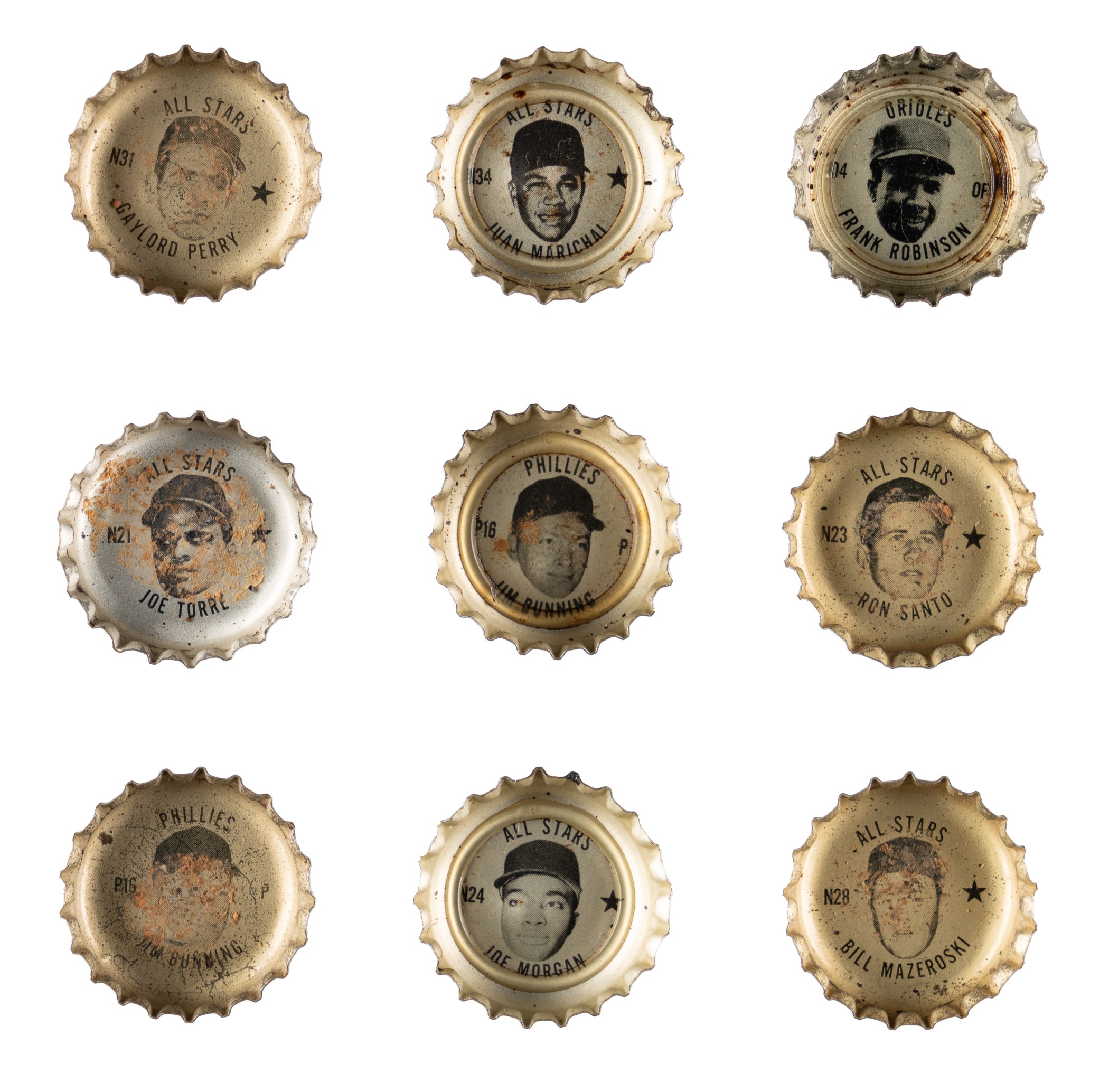 Collection of seventy-two 1967-1968 Coca-Cola, Sprite, and Fresca Bottle Caps, including fifteen Hall of Famers. Condition ranges from Pr to Vg (averaging Gd), including a few higher. This collection consists of the following: 1) National League All Stars (15 caps): #N19 Aaron (Pr), N21 Torre (Gd), N22, N23 Santo (Vg), N24 Morgan (Vg-Ex, Fresca), N26, N27 Banks (Gd+), N28 Mazeroski (Gd+), N29 Stargell (Gd+), N30 Rose (Fr-Gd), N31 Perry (Vg), N32, N33, N34 Marichal (Vg), and N35. 2) Baltimore Orioles (6 caps): #O3, O4 F. Robinson (Vg, Sprite), O8, O10 B. Robinson (Ex), O13, and O16. 3) Philadelphia Phillies (50 caps): #P1, four P2 (one Coke, two Fresca, one Sprite), four P3, three P4, four P5, two P6 (one Coke and one Sprite), three P7, four P8, three P9, P10 (Sprite), six P11 (five Coke and one Fresca), four P12, two P13, three P14, two P16 Bunning (one Coke (Fr) and one Sprite (Gd)), and four P17. 4) Boston Red Sox (1 cap): #R2 Yastrzemski (Vg). Total: 72 caps. The size/weight of this item requires that there will be an additional shipping charge for this lot. Opening Bid $10.