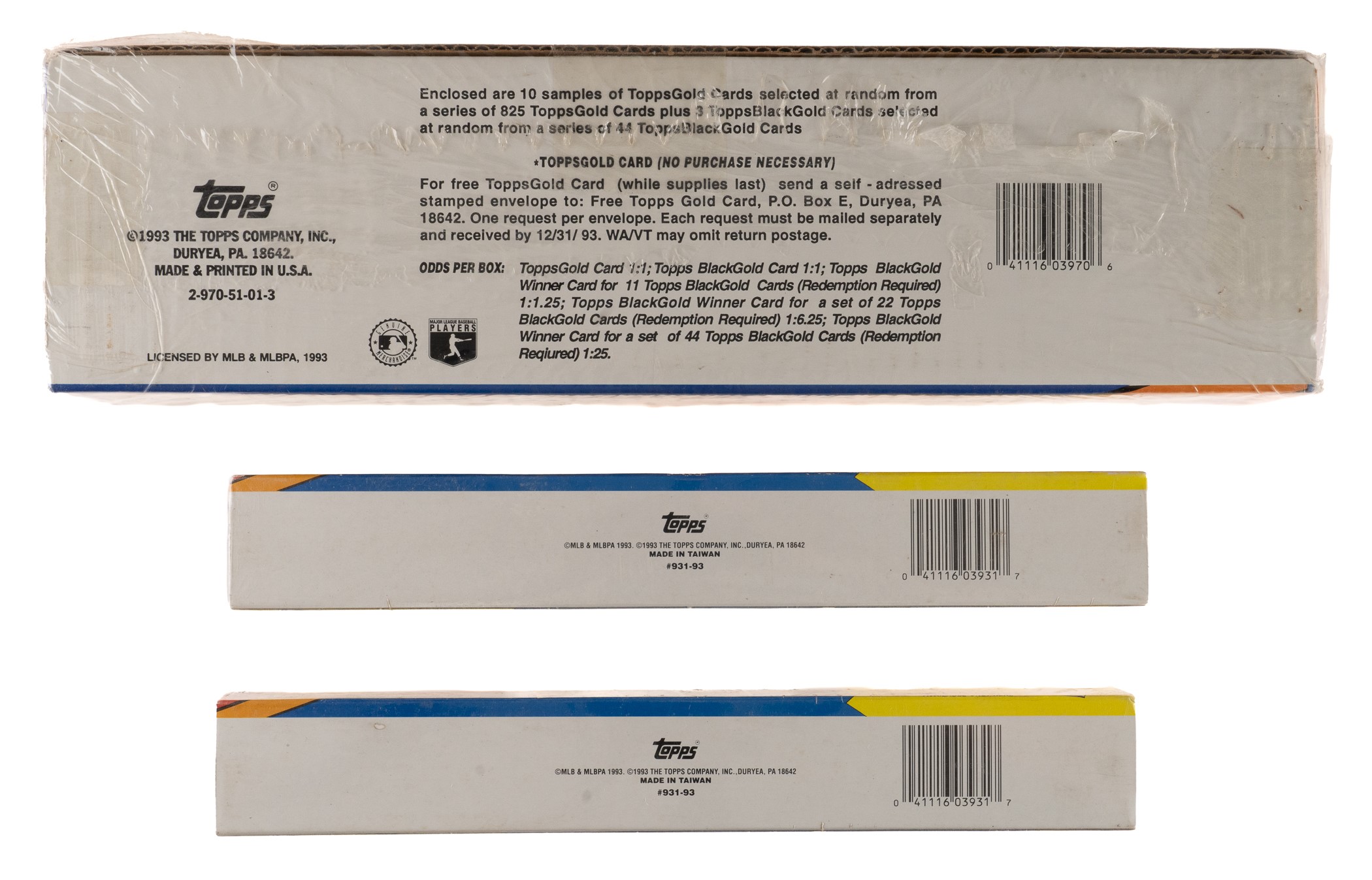 Trio of unopened factory-boxes of 1993 Topps (1) and Topps Micro (2) houses three complete sets with 825 cards per set for a total of 2,475 cards. The size/weight of this item requires that there will be an additional shipping charge for this lot. Opening Bid $10.