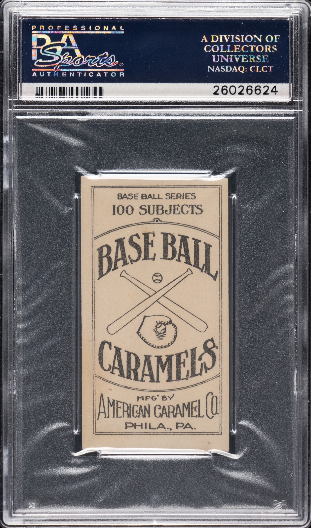 Graded NM 7 by PSA. One of only two examples graded at this level with none higher! Extremely attractive high-grade example of Hall of Famer Nap Lajoie from the classic E90-1 American Caramel series. Bright and clean, both front and back, with vibrant colors, a slight natural "diamond" cut, and four strong corners. Centered toward the upper left. The reverse has bold black printing. Caramel cards are rarely found in high grade, making this an especially desirable example of a key Hall of Famer. Opening Bid $1,000.
